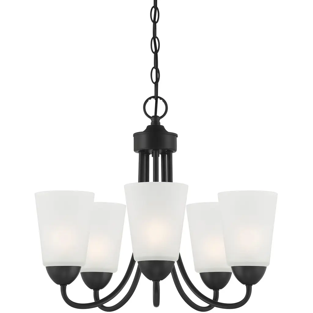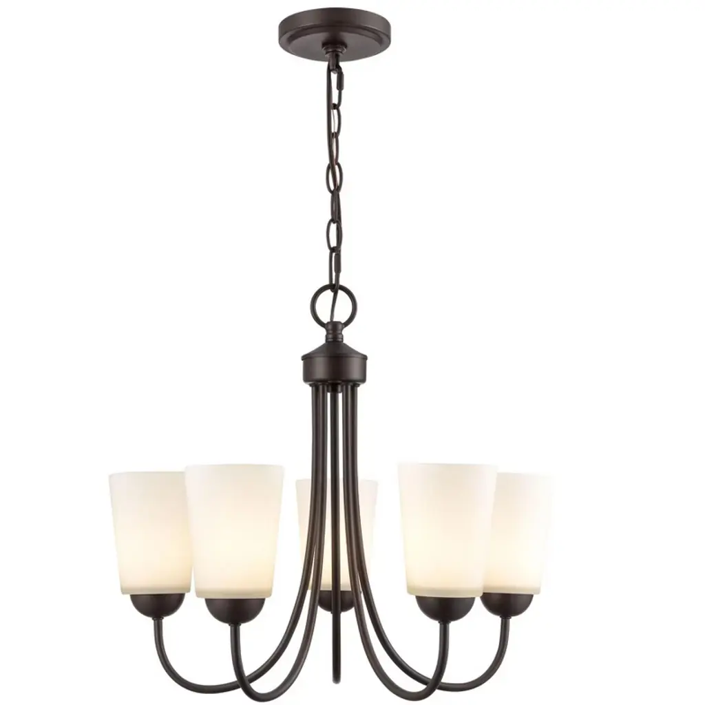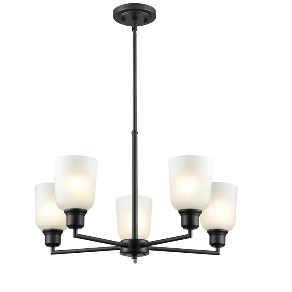 Minimalistic frames finished in your choice of Oil Rubbed Bronze or Polished Chrome support cylinders of Frost glass shades. A clean contemporary look at a very affordable price. Canopy Included: Yes Canopy Diameter: 5.12 Chain Length: 36.00 Dimmable: Yes Shade Included: Yes Material: Glass, Finish Color: Black, Width: 22", Height: 19", Length: 22", Chain Length: 36", Lamping Type: Incandescent, Number Of Bulbs: 5, Wattage: 60 Watts, Dimmable: Yes, Moisture Rating: Dry Rated