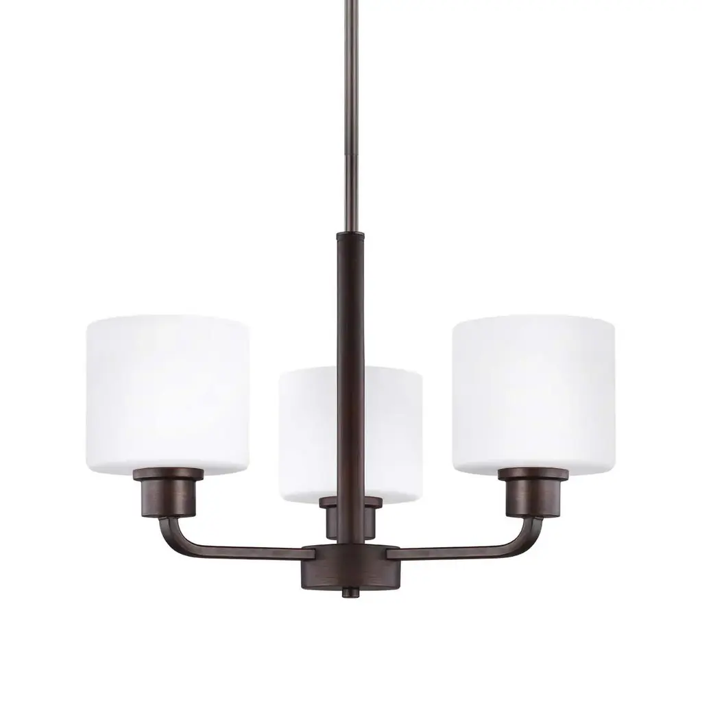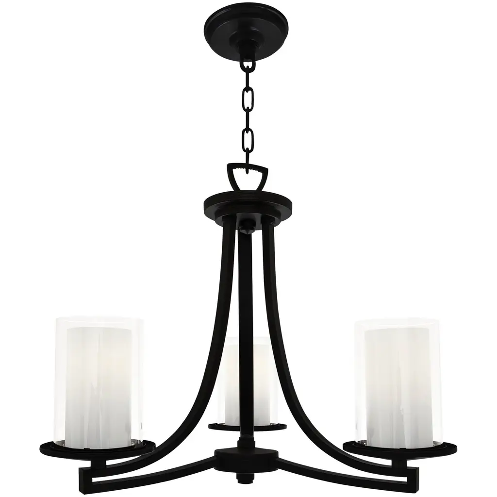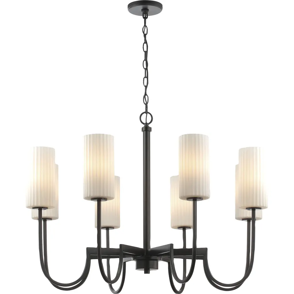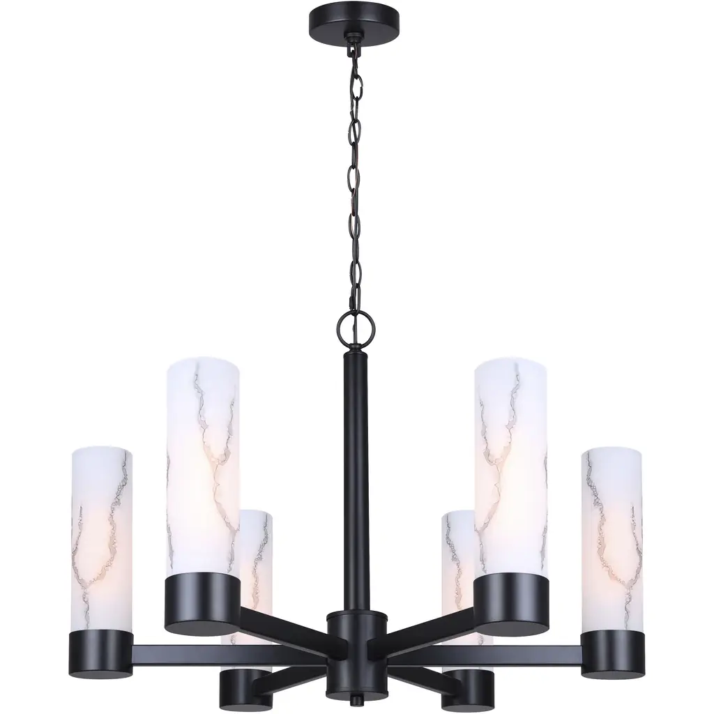 Minimalistic frames finished in your choice of Oil Rubbed Bronze or Polished Chrome support cylinders of Frost glass shades. A clean contemporary look at a very affordable price. Canopy Included: Yes Canopy Diameter: 5.12 Chain Length: 36.00 Dimmable: Yes Shade Included: Yes Material: Glass, Finish Color: Black, Width: 22", Height: 19", Length: 22", Chain Length: 36", Lamping Type: Incandescent, Number Of Bulbs: 5, Wattage: 60 Watts, Dimmable: Yes, Moisture Rating: Dry Rated