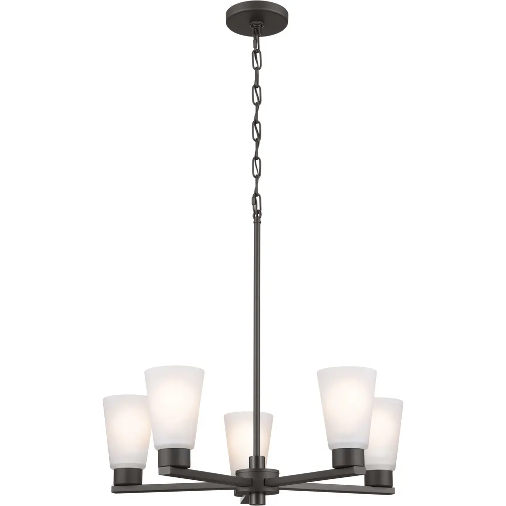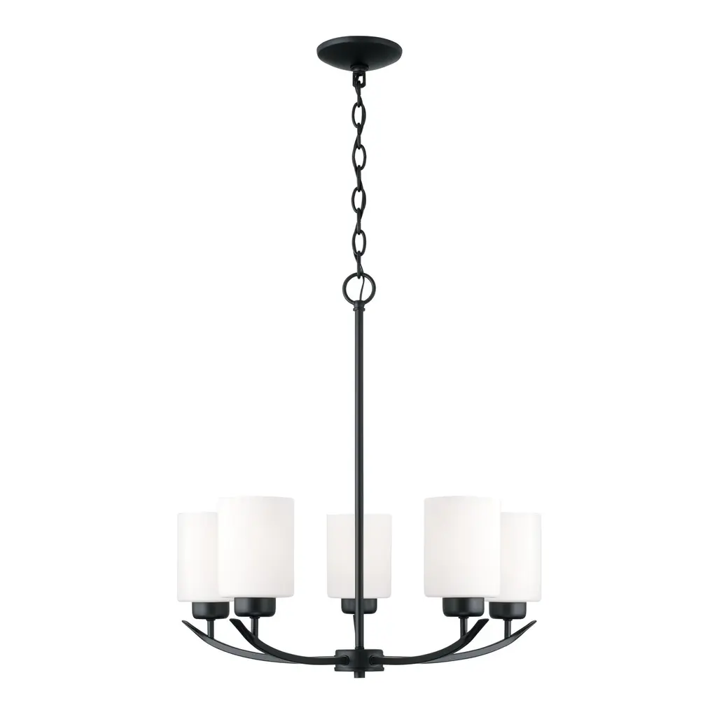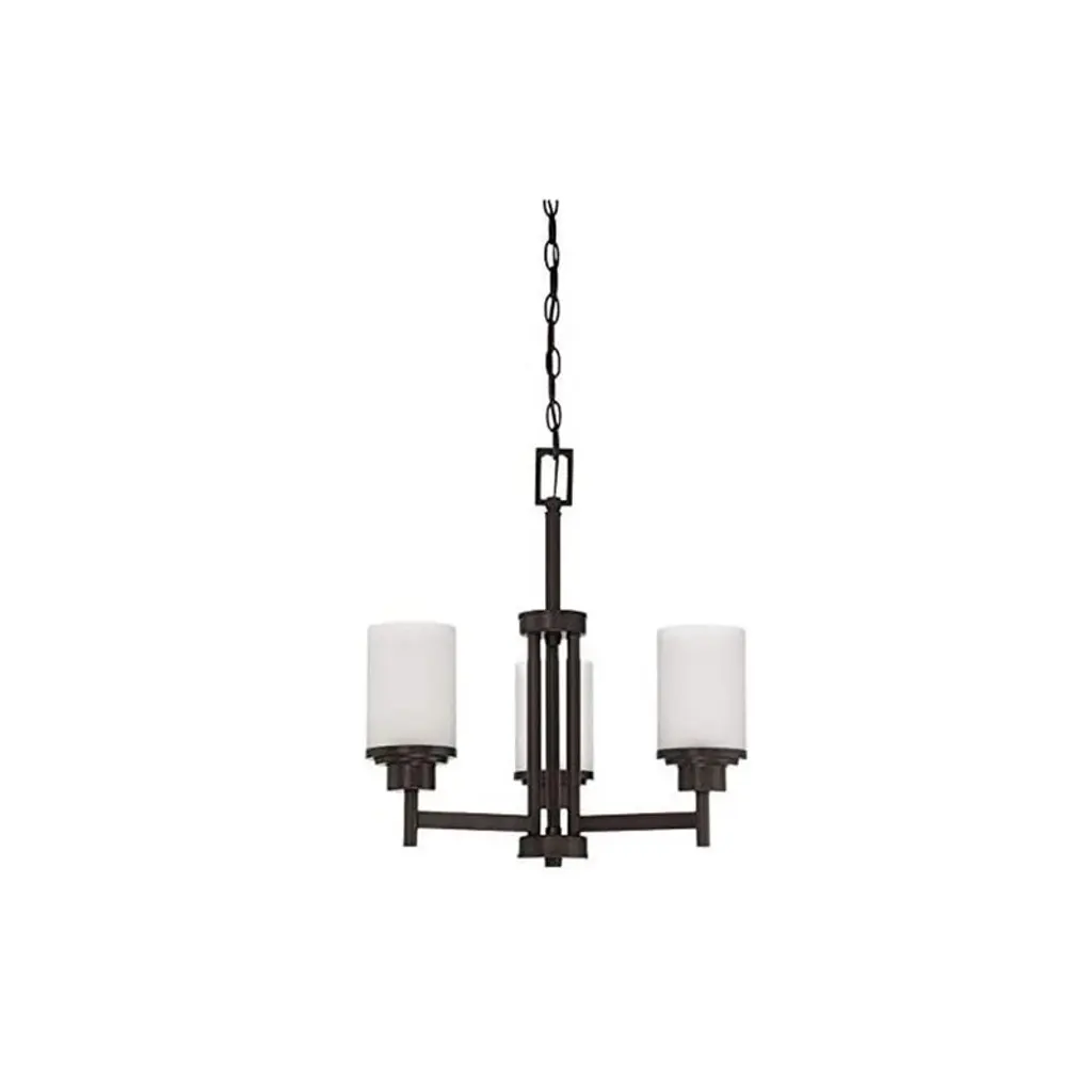 Low sloping arms of rectilinear tubing is finished in a variety of options that include Satin Nickel, Oil Rubbed Bronze, Matte Black, and a contemporary Satin Brass finish. Tall, cylindrical Satin White glass shades soften the light source within. Offered in a variety of configurations that include chandeliers, sconces, and a semi-flush pendant that may be used as a foyer pendant, has become a proven popular choice among builders.