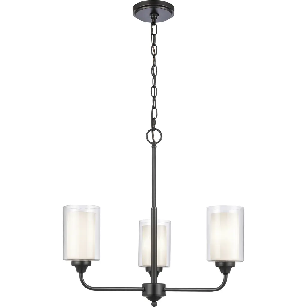 Low sloping arms of rectilinear tubing is finished in a variety of options that include Satin Nickel, Oil Rubbed Bronze, Matte Black, and a contemporary Satin Brass finish. Tall, cylindrical Satin White glass shades soften the light source within. Offered in a variety of configurations that include chandeliers, sconces, and a semi-flush pendant that may be used as a foyer pendant, has become a proven popular choice among builders.
