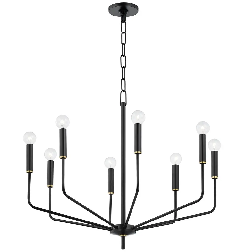 Straight extensions of rectilinear arms emanate from a cylindrical center housing in this transitional design. The candelabra is made in a corresponding cylindrical form playing into the geometries of this streamlined chandelier design. Available in a textured sandy Black or Natural Aged Brass, this collection pairs well with many design aesthetics at an economical price point. Use tubular lamps for an industrial or more modern aesthetic or torpedo shape for an update to the conventional chandelier design.
