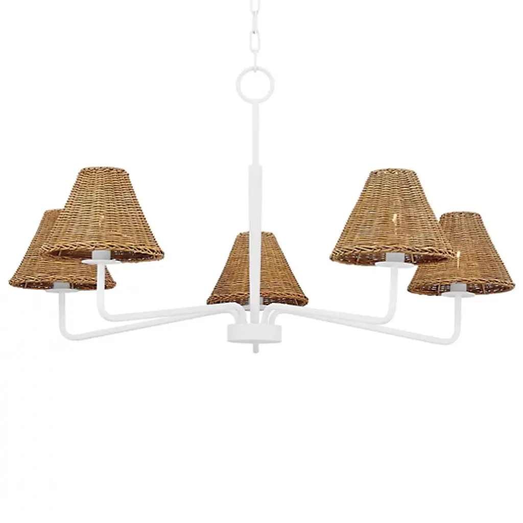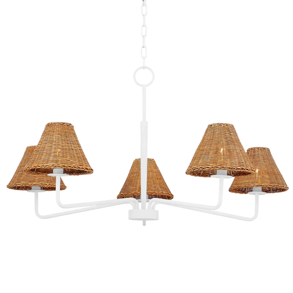 A classical chandelier that transports you to a tropical paradise, the Maldives collection features hand woven wicker shades that elegantly curve around precisely cut opal white glass. Suspended on slender supports of steel finished in Matte Black, the handcrafted shade structures conjure up images of bungalows along the coast. Available in chandelier and sconce configurations.