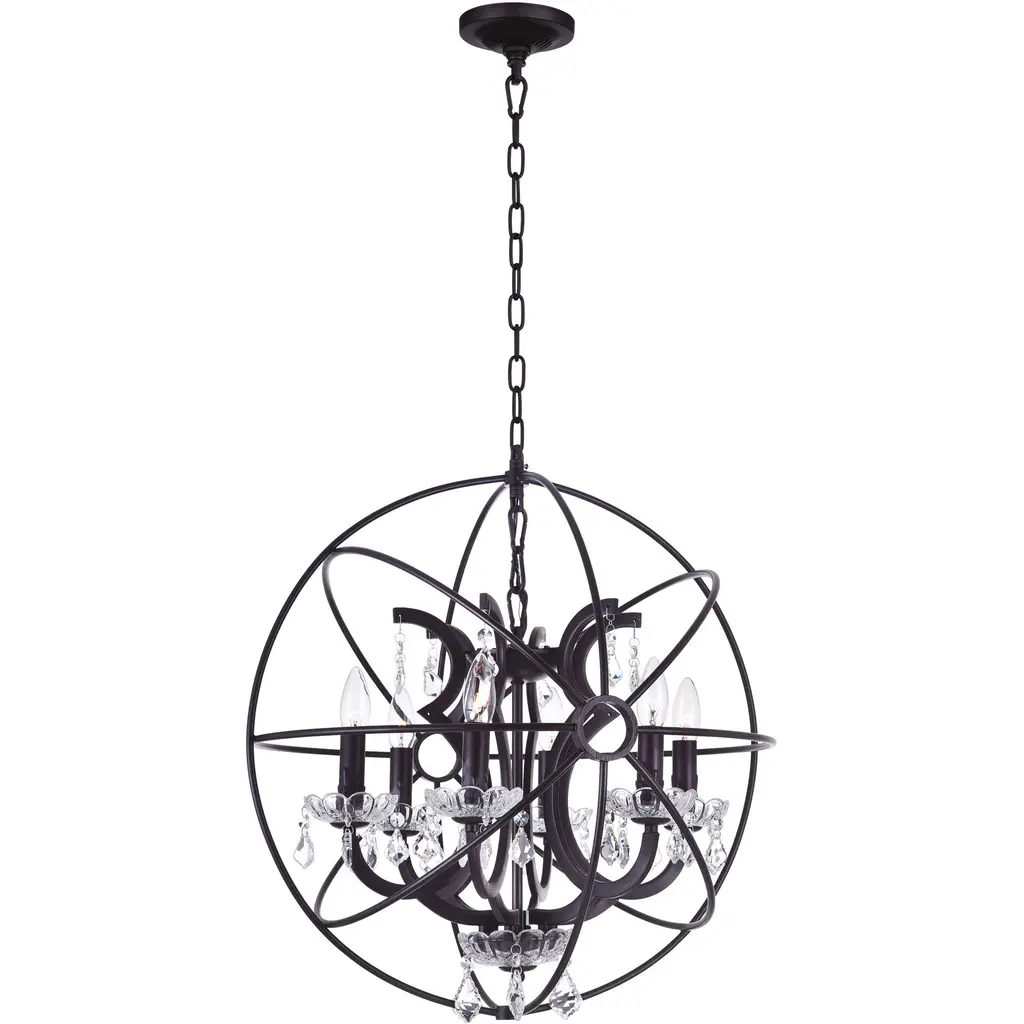 A spherical frame of metal surround a simple line chandelier draped in crystal for a transitional style that fits any interior design. Orbit is available in 2 sizes and 2 finishes, Oil Rubbed Bronze with Cognac crystal and a combo finish of Anthracite and Polished Nickel with Clear crystal. Chain Length: 36.00 Dimmable: Yes
