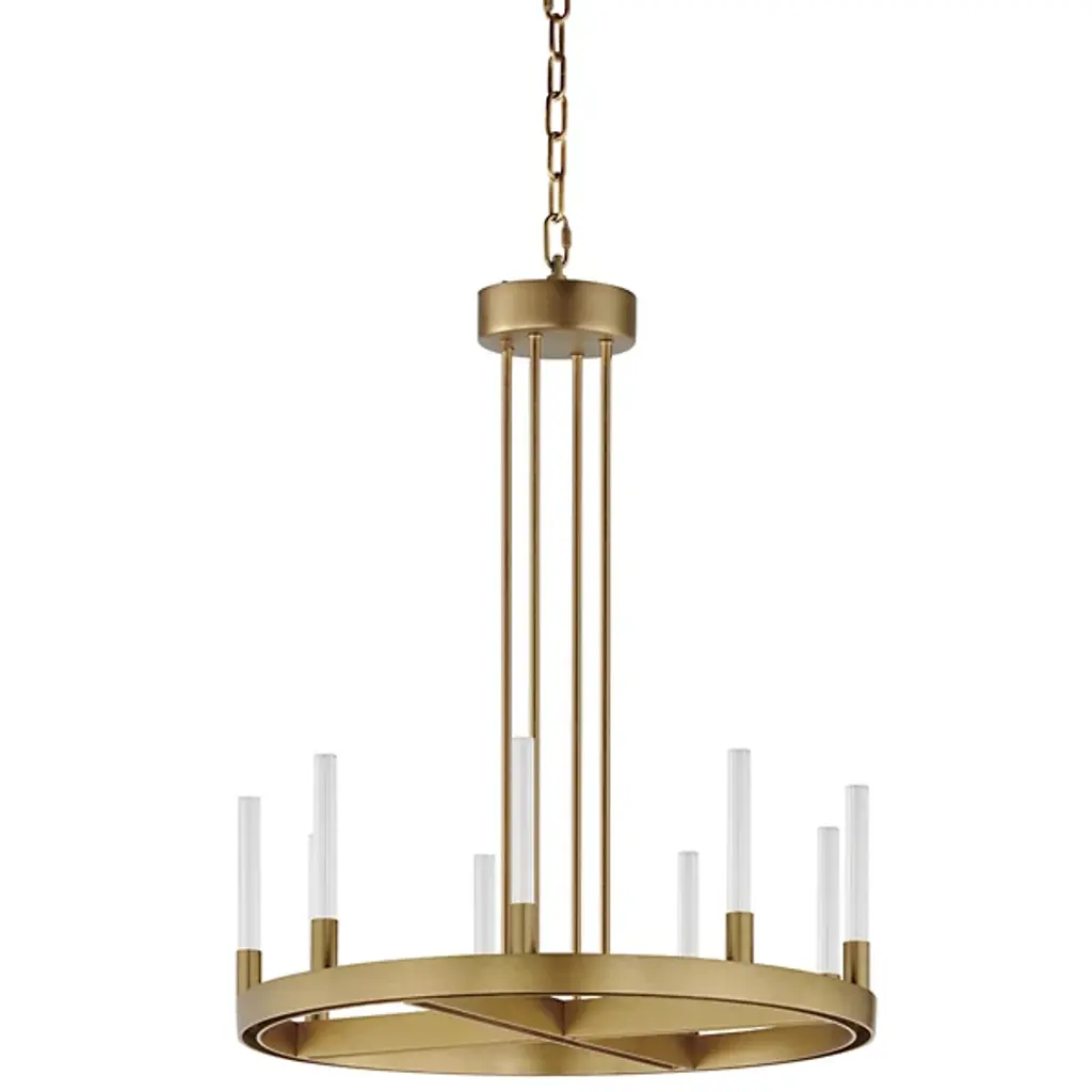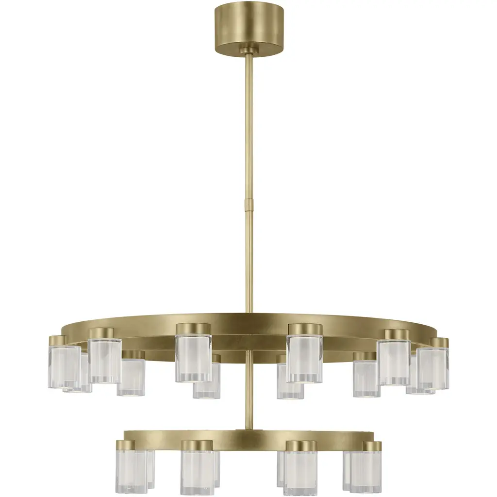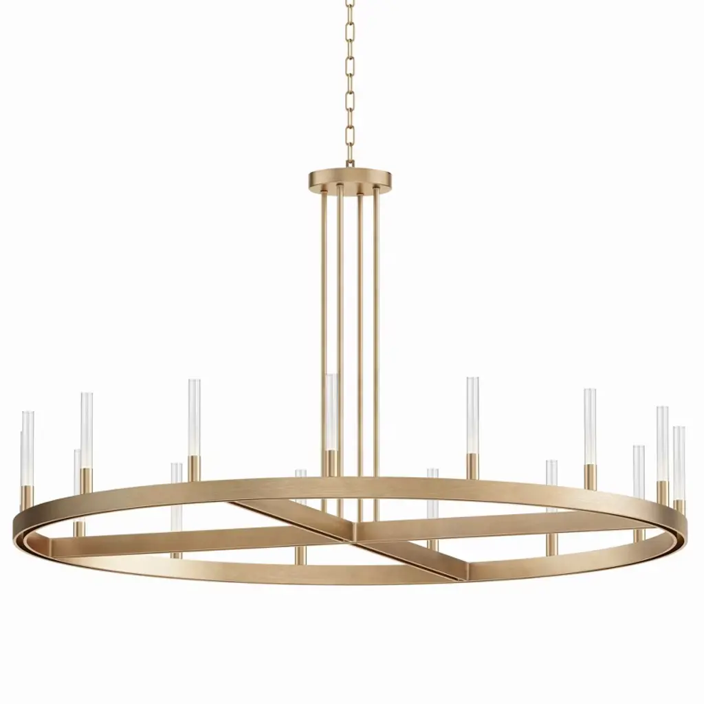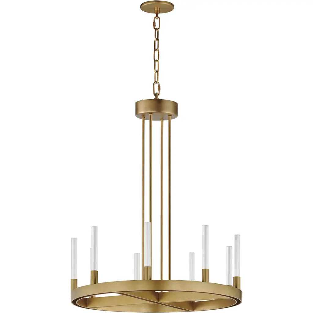 A modern tribute to the wheel chandelier, the Ovation collection integrates LED technology for a dazzling lighting effect. The LED light produces a shimmering lighting effect along the tall and narrow fluted glass shades adding celebratory effervescence. The expansive diameters of the rings join at the center in equipoise using four down rods to suspend the frame. Mount the chandelier from the collector or make use of additional chain supplied to extend the height with ease. Additional sconces with up and down lighting complete the design. Available in Brushed Brass or Black, the collection toasts a classic design creating an elegant statement.