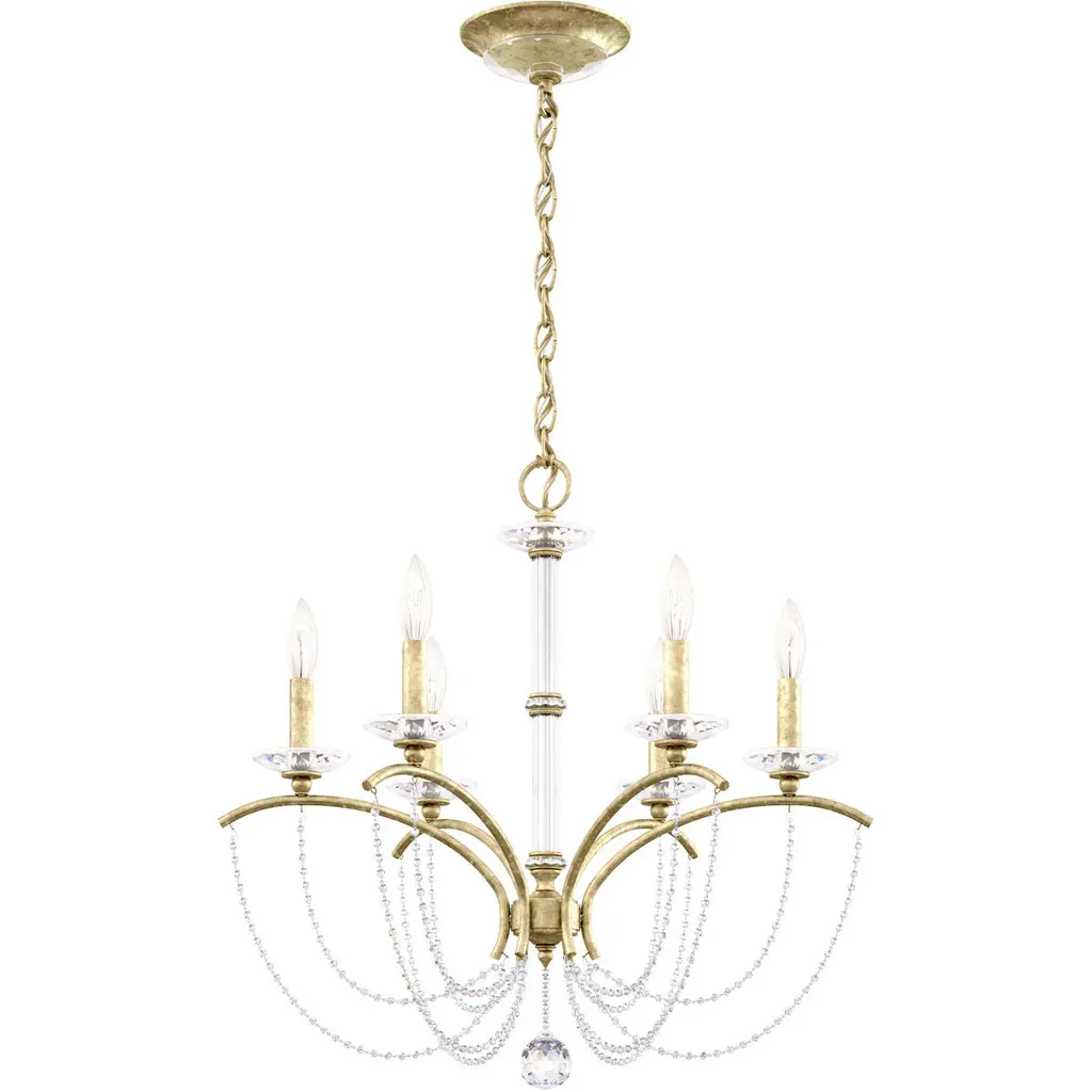 Sweeping metal accents links create classic curves on a minimalist chandelier. Available in hand-rubbed Chestnut Bronze or elegant Gold Leaf finishes. Add crystal accents to elevate the design for a more extravagant glamour. The design manages to evoke French Country charm and enchants any room it illuminates. Material: Iron, Finish Color: Gold Leaf, Width: 28", Height: 22", Length: 36", Hanging Method: Rod and Chain, Chain Length: 36", Lamping Type: Incandescent, Number Of Bulbs: 6, Wattage: 360 Watts, Dimmable: Yes, Moisture Rating: Dry Rated