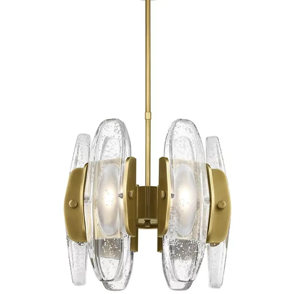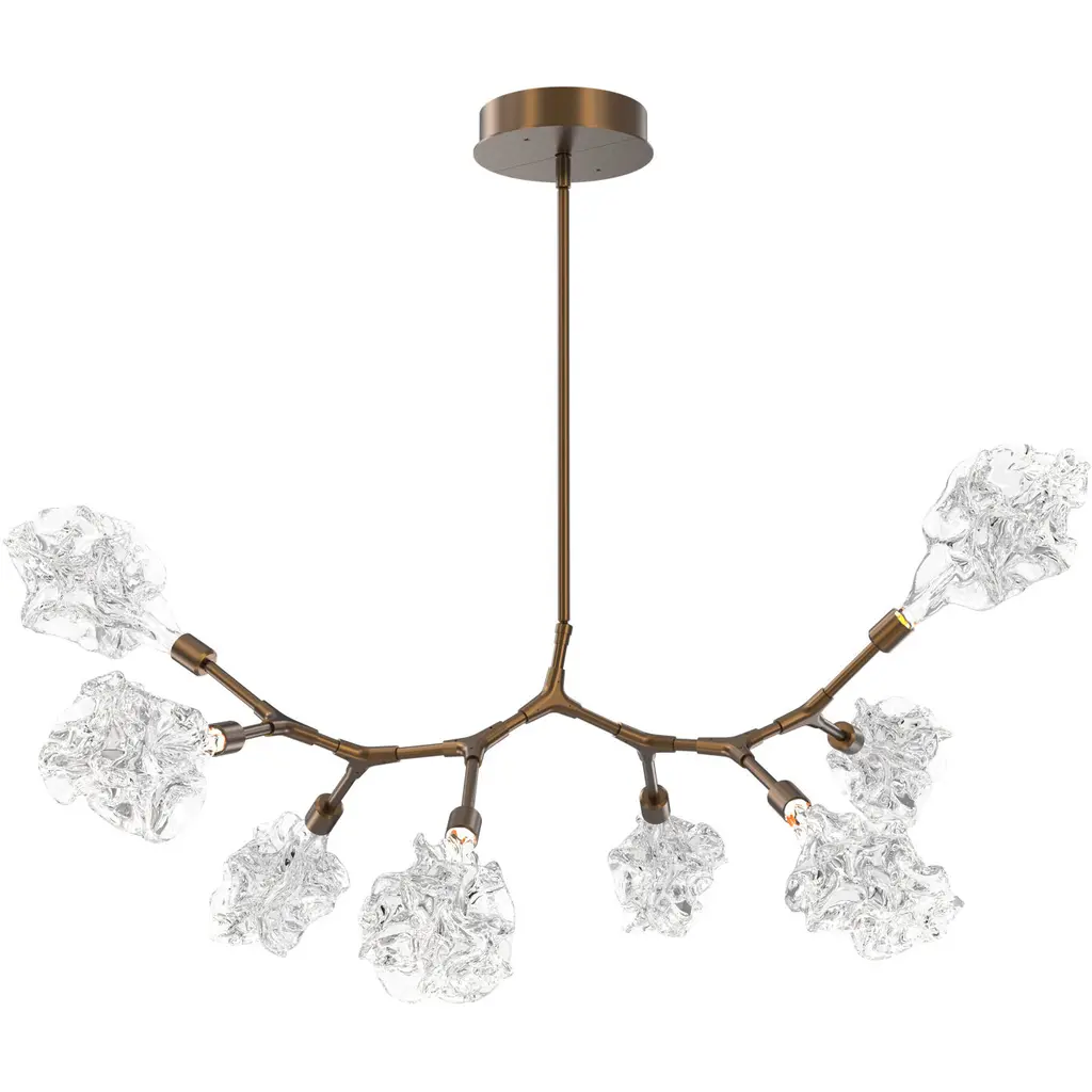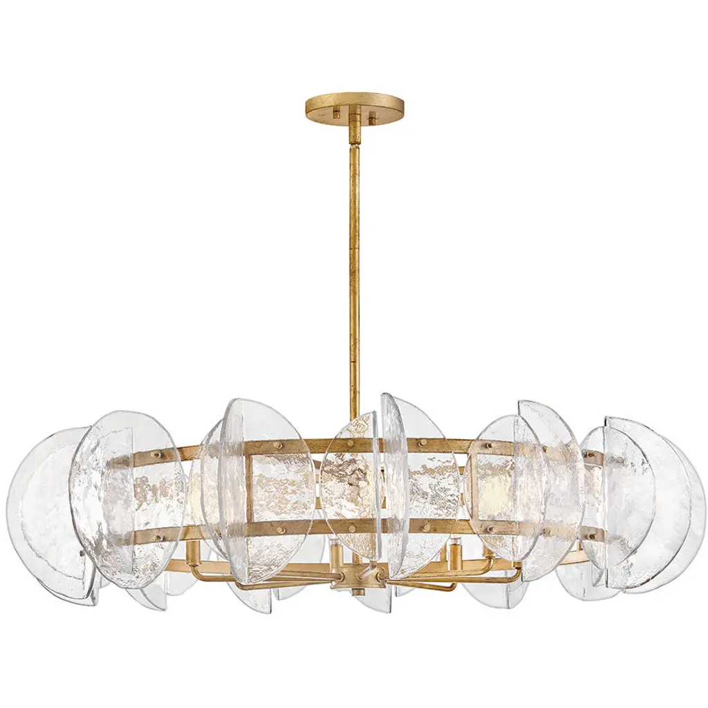 Rings Of Dark Hammered Bronze With A Subtle Golden Interiors. Inspired From Mid Century Modern Design, Each Ring Holds Two Handmade Artisan Inspired Clear & White Swirl Glass Ovals. 9-40 Watt G9 Max Bulbs Included. Also Includes 15ft wire, And 3-12in stems & 1-6in Stem For Adjustable Installation.