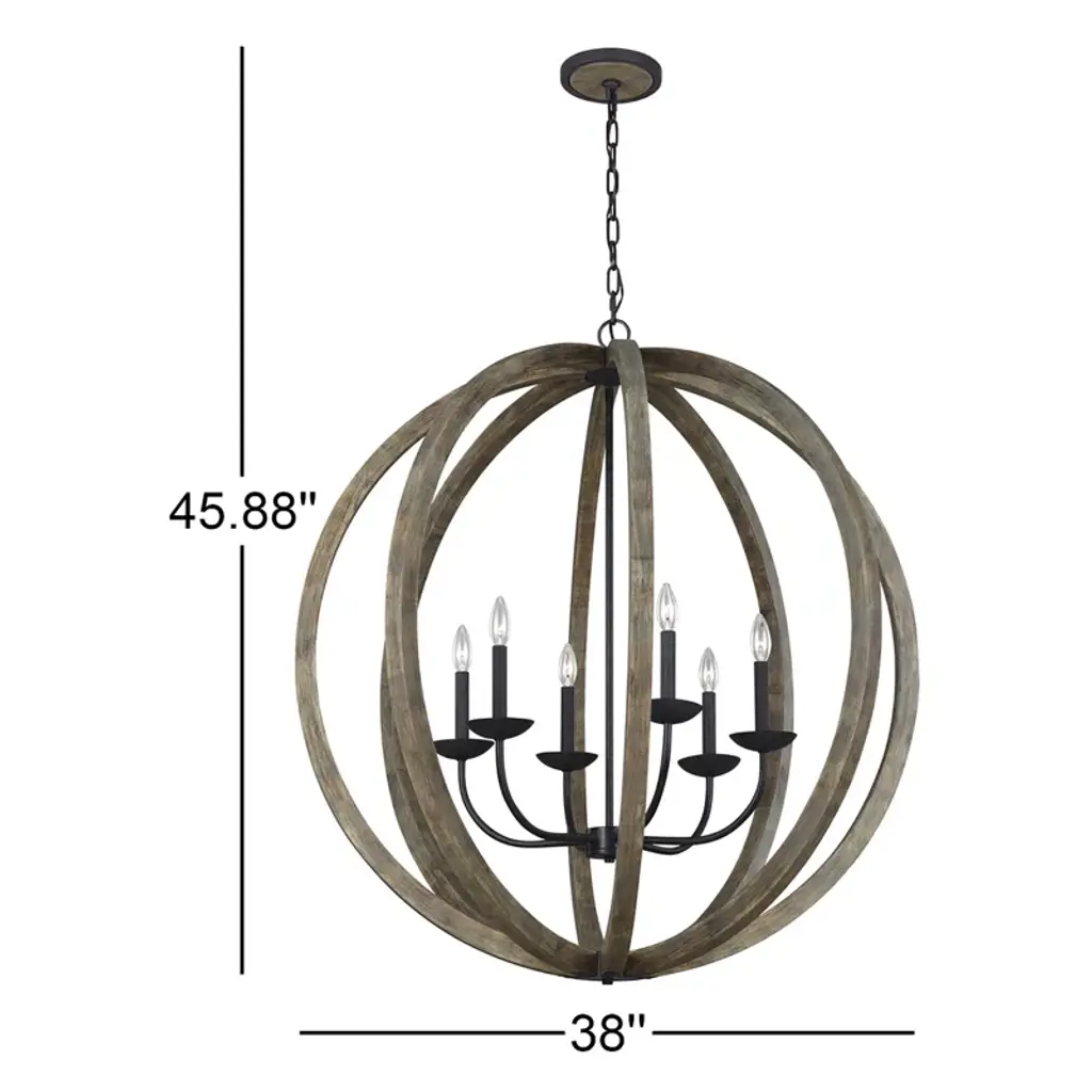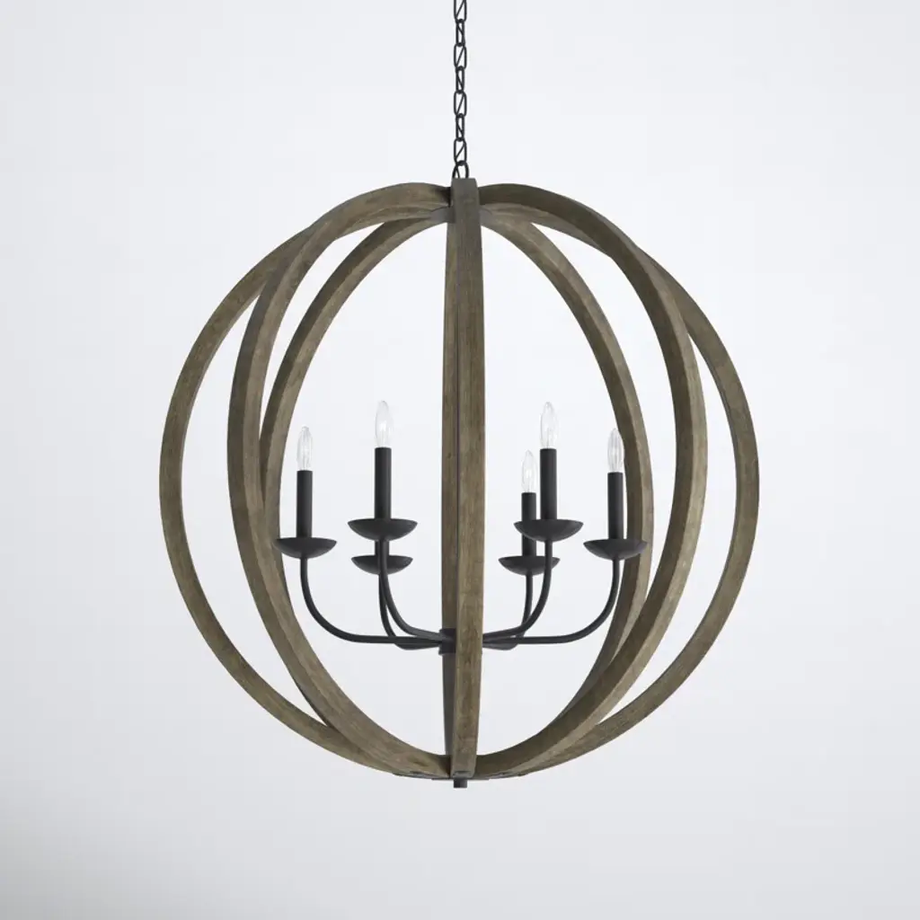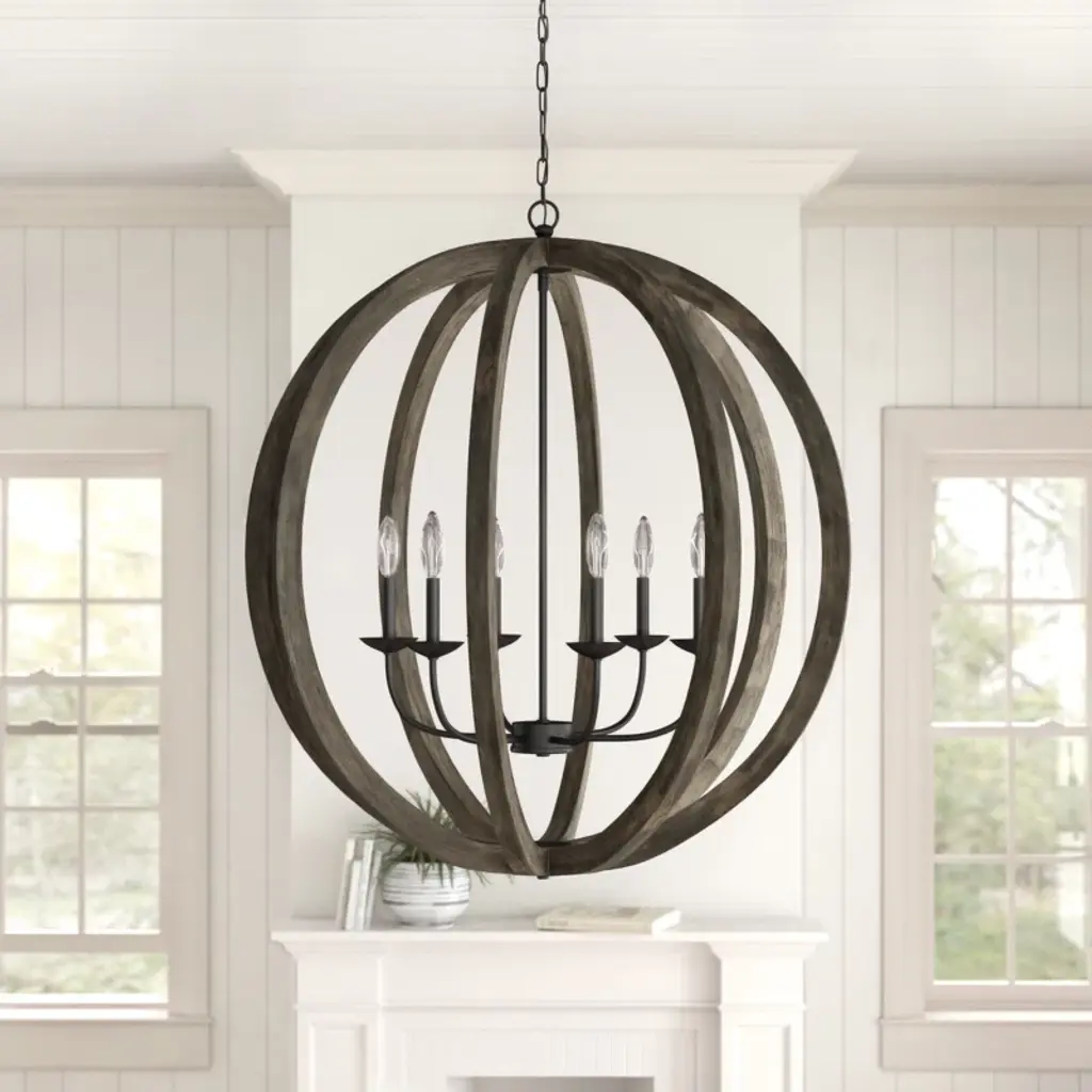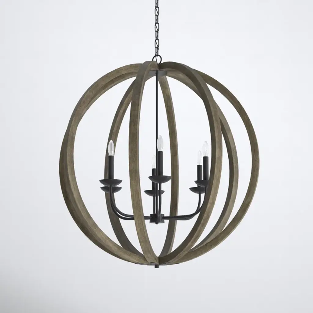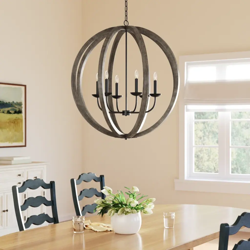 One sure way to welcome in some farmhouse warmth to your dining room is with this 6-light chandelier. Its open globe-shamed frame is made from kiln-dried wood in a rustic brown finish that has a lived-in look. Inside, a slim metal candelabra with matching candle holders takes six 60W bulbs, which are sold separately. We love that this globe chandelier is compatible with dimmer switches, so you can make sure you get the lighting just right during family dinner or a festive brunch.