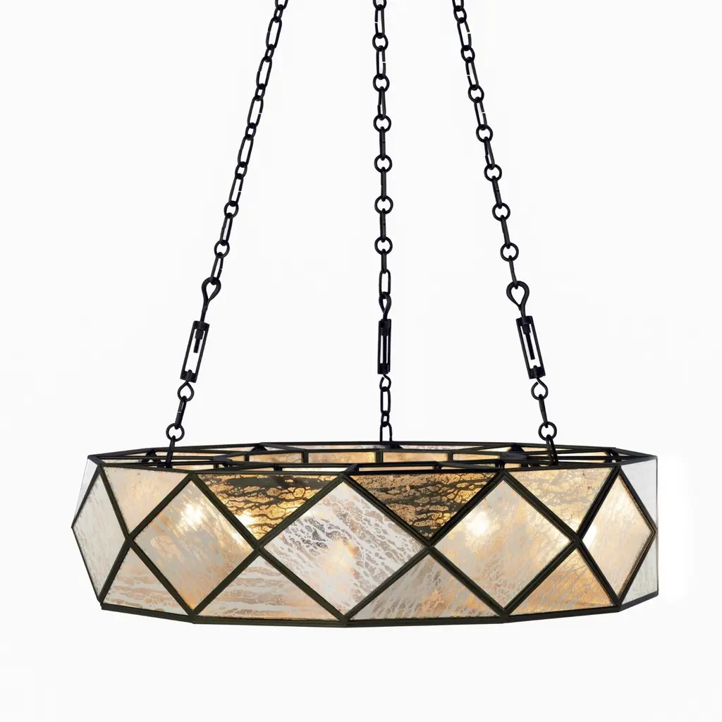 The Small Maybelle Chandelier offers expert design and craftsmanship featuring antique brushed brass and silver mercury glass laid in a diamond-shaped pattern on the circular chandelier. Ideal for smaller spaces, this chandelier provides a touch of elegance and sophistication, making it a beautiful addition to any room. Also available in a larger size.