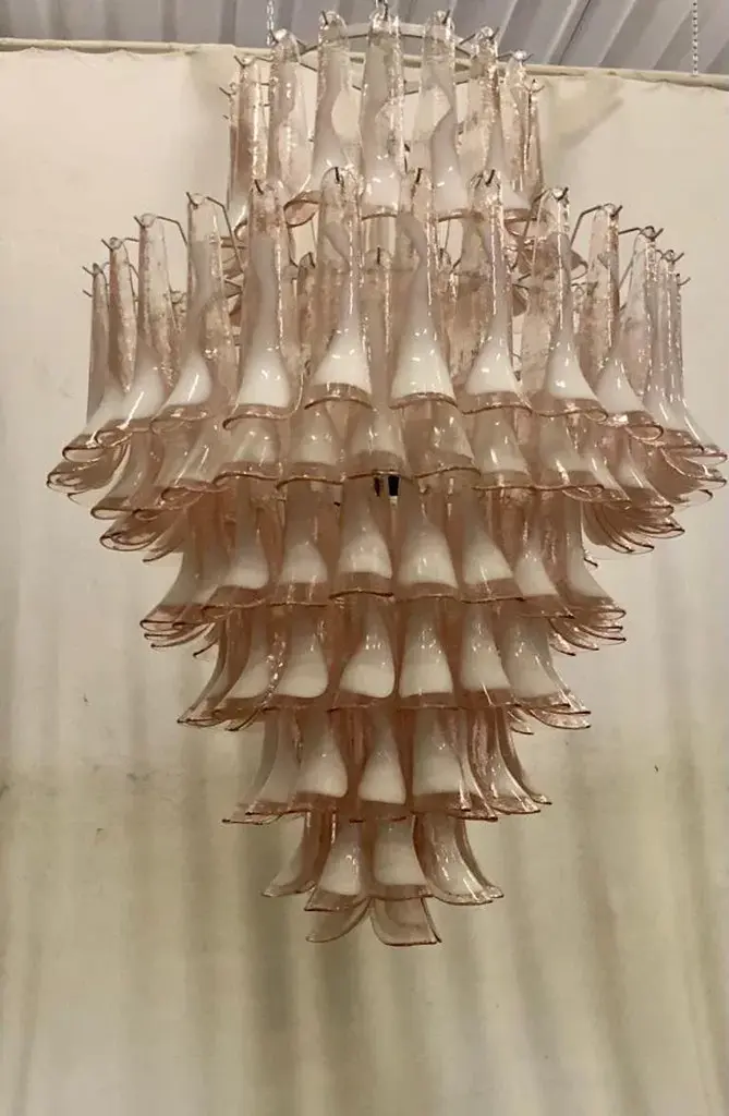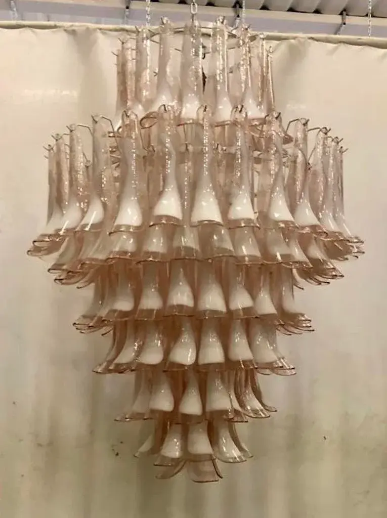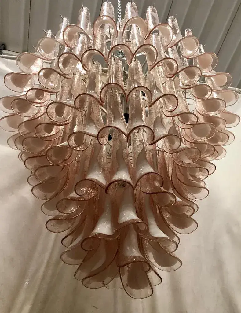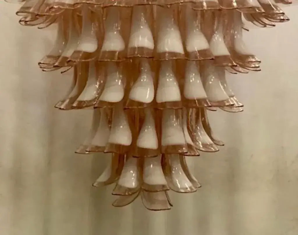 Extraordinary light pink and white color for this "Mazzega" Murano chandelier, a light pink and white color with a unique transparency. Its light pink and white color is really guessed for a different and original chandelier from others. A beautiful stain of color above your ceiling will drive anyone crazy into your home. The chandelier has a round white metal structure. All around there are light pink and white colored Murano glass tiles. There are eight concentric circles, which widen more and more from the bottom up to the last circle at the top. Then again the last circle narrows to cover the hook on the ceiling, so as to be attached directly to the ceiling. Inside there are twelve bulbs on multiple levels. European Plug (up to 250V).The wiring of this item may be original and might need replacement, if not specified otherwise.