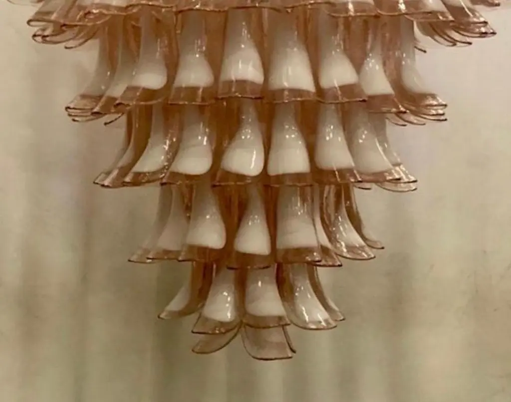 Extraordinary light pink and white color for this "Mazzega" Murano chandelier, a light pink and white color with a unique transparency. Its light pink and white color is really guessed for a different and original chandelier from others. A beautiful stain of color above your ceiling will drive anyone crazy into your home.The chandelier has a round white metal structure. All around there are light pink and white colored Murano glass tiles. There are eight concentric circles, which widen more and more from the bottom up to the last circle at the top. Then again the last circle narrows to cover the hook on the ceiling, so as to be attached directly to the ceiling. Inside there are twelve bulbs on multiple levels.