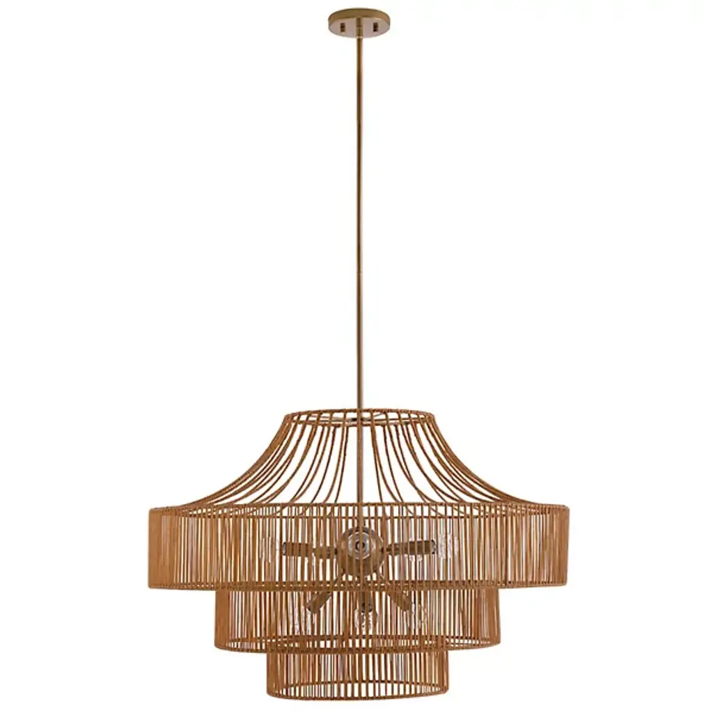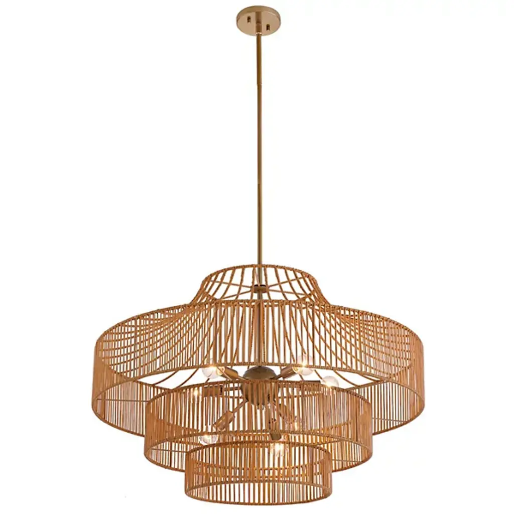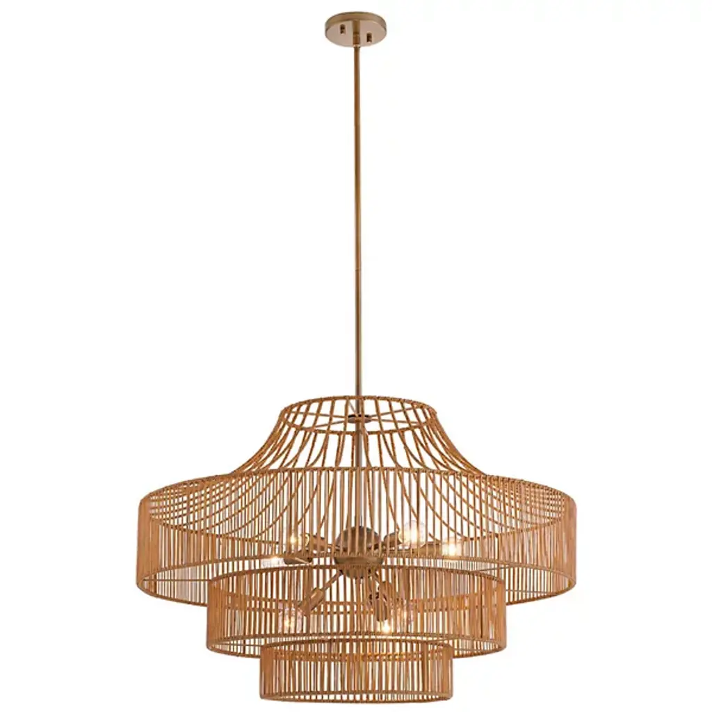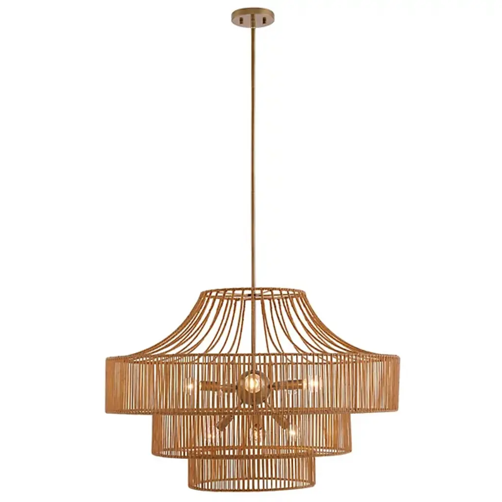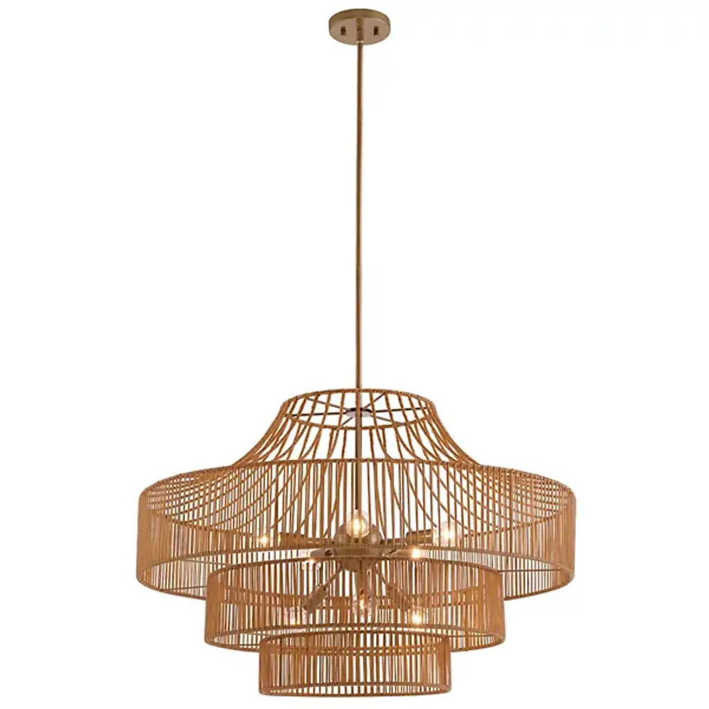 The Medlock Outdoor Chandelier from Savoy House brings the organic allure of rattan-inspired design to outdoor spaces. This striking fixture features a multi-tiered shade crafted from rattan resin, offering the aesthetic charm of natural materials with enhanced weather resistance. The layered construction creates a visually engaging and tactile element, while the eight light sources ensure ample illumination. Designed for exterior use, the Medlock Outdoor Chandelier combines rustic texture with modern durability, making it an eye-catching centerpiece that adds natural beauty and functional lighting to gardens, patios, or covered outdoor areas.
