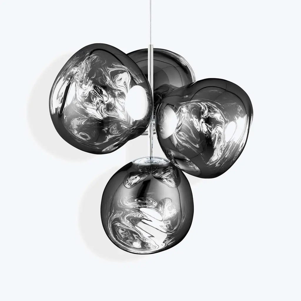 Melt is a beautifully distorted pendant in a modern Silver finish and matching ceiling rose. Featuring our intergrated LED module, this ceiling light creates a mesmirizing melting hot-blown glass effect when on and a mirror-finish effect when off. Made in Germany using a high tech manufacturing technique to achieve the perfect melted orb.