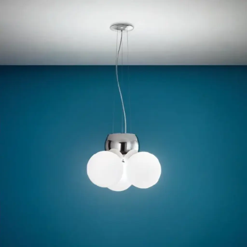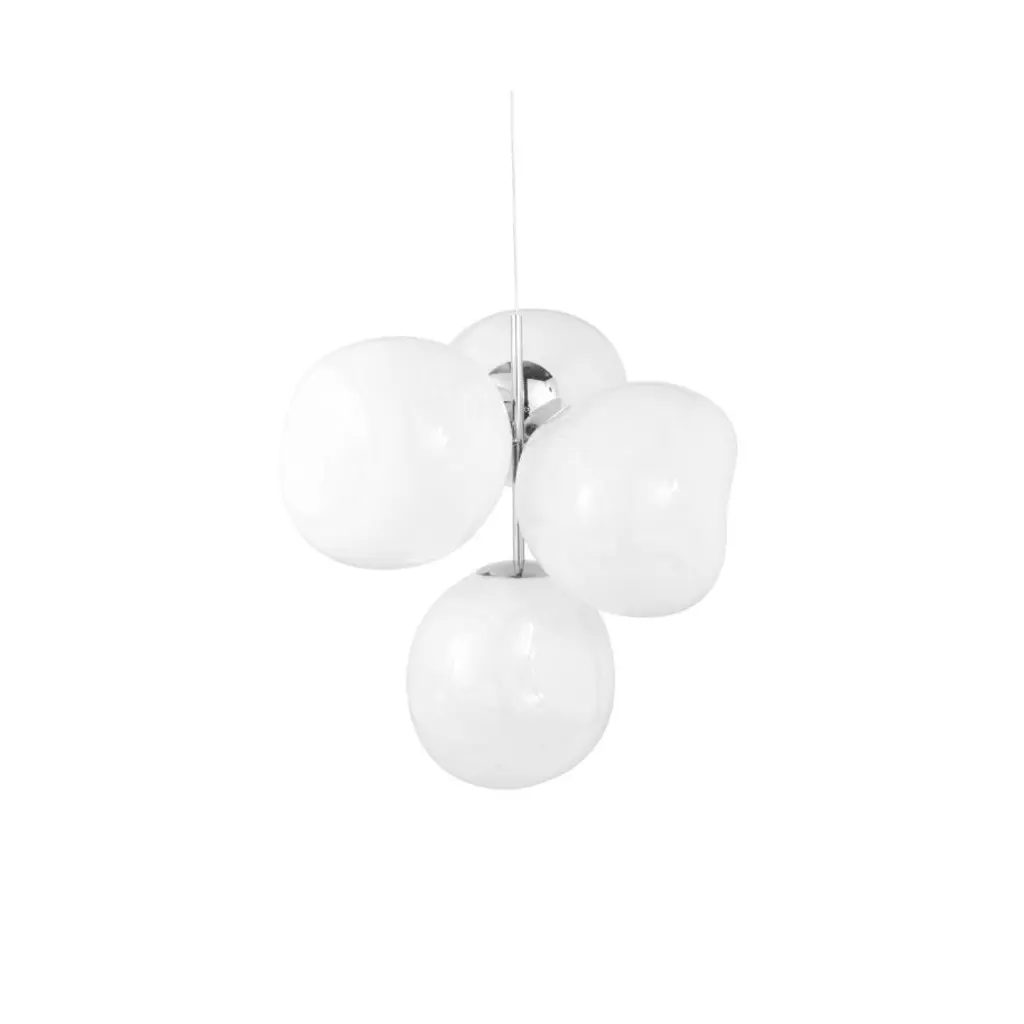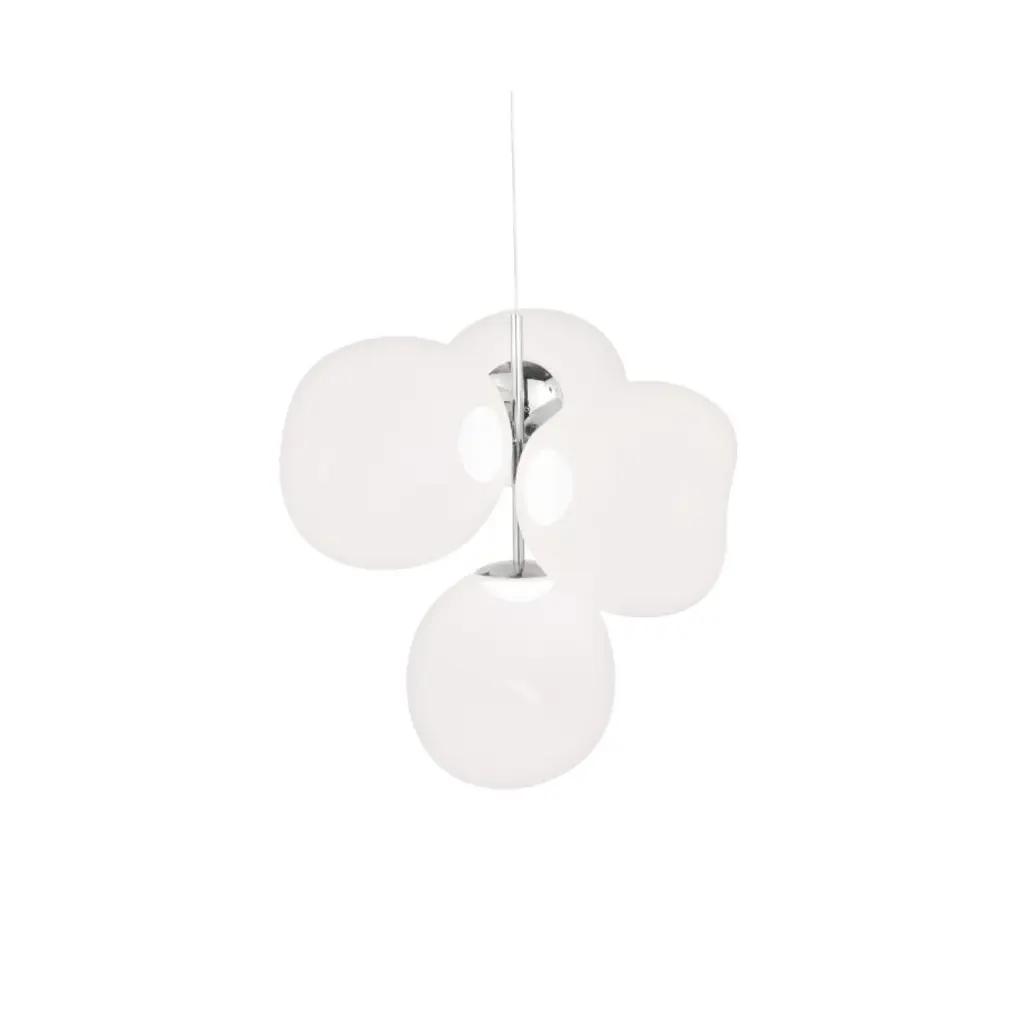 Melt Small Chandelier features four iconic MELT shades in a new tinted white opalescent finish, protruding from sleek steel tubes and measuring one-metre-high lights By retaining Melt’s organic form and instantly recognisable silhouette, we have created an opal version that enhances its luminosity. The shades emit an ethereal glow in daylight and form mesmerizing illuminated orbs at night. Perfectly complementing any interior with its opalescent shade, reminiscent of natural pearls.