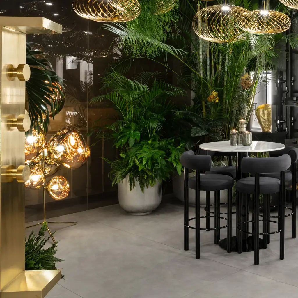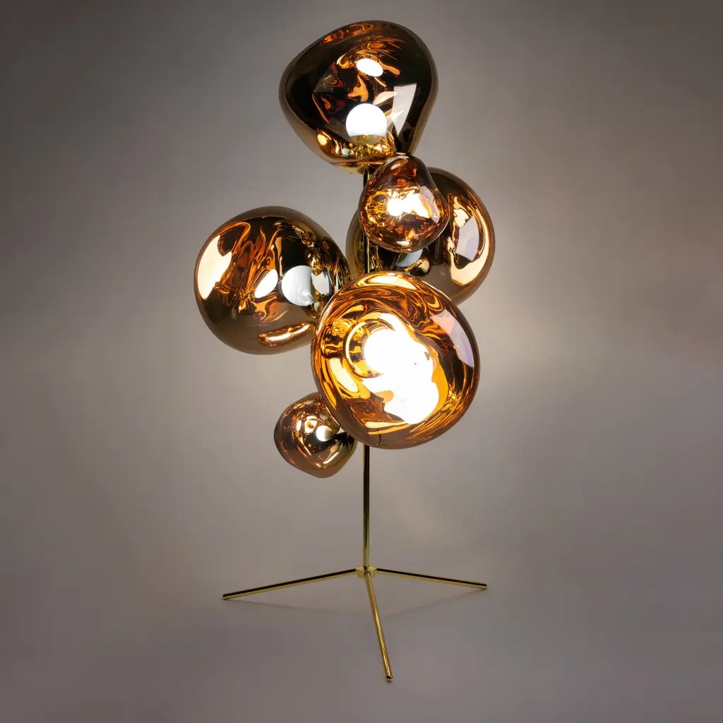 The mesmerizing golden globules of Tom Dixon's Melt lighting series stack up to a serious wow factor in his Standing Chandelier. This stunner evolved from the designer's experiments in the technologically advanced field of vacuum metallization, fabricated in polycarbonate with polished finish. With a total of 7 gold shades (3 Melt Mini and 4 Melt) on a tripod stand, it's as much a collectible sculpture as a lighting tour-de-force.