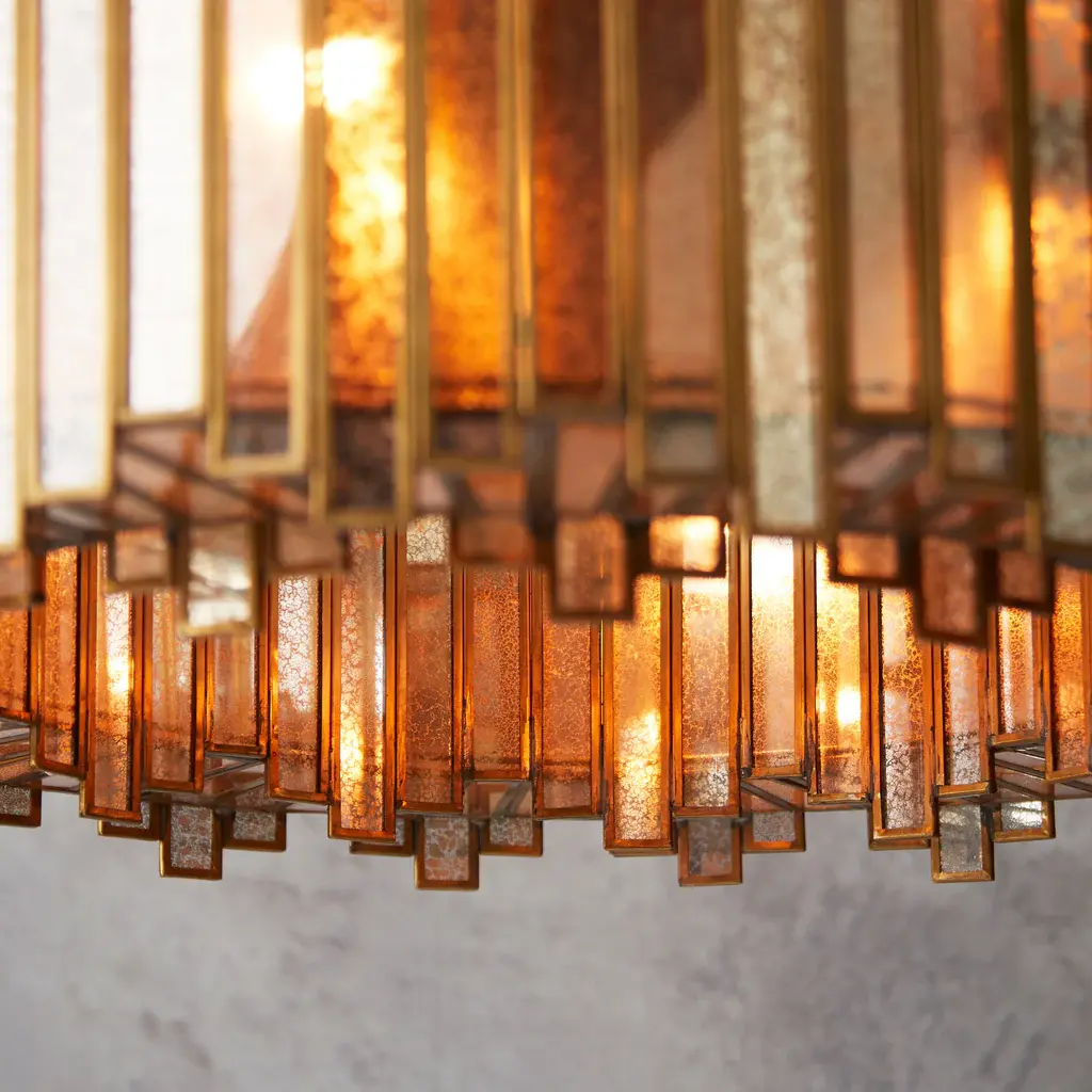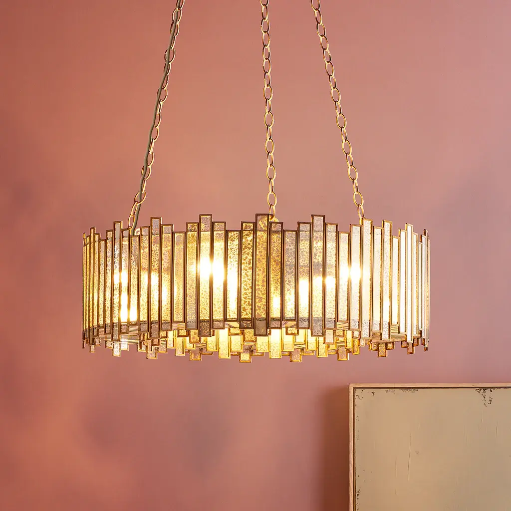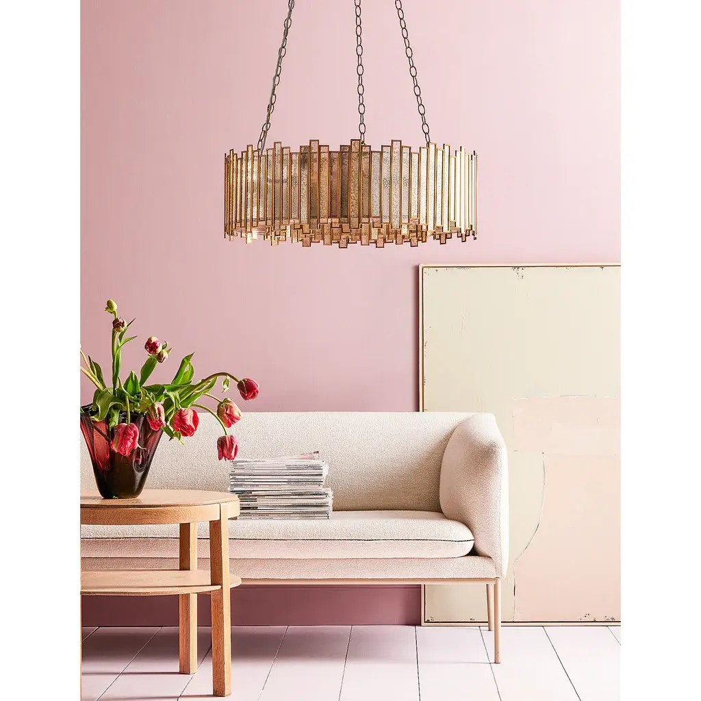 The Melvillous Chandelier boasts a striking presentation of intricate design. With an inner and outer ring of vertical brass and glass panels, connected by a horizontal ring, this chandelier emits a bold presence. Featuring 6 bulbs and a beautiful mercerized finish, it's sure to add an elevated touch of ambiance. All Pooky lighting is exclusively available in the U.S. at abc carpet & home. Originally launched in the UK, Pooky is all about bringing the magic of stunning, decorative lighting to your home.