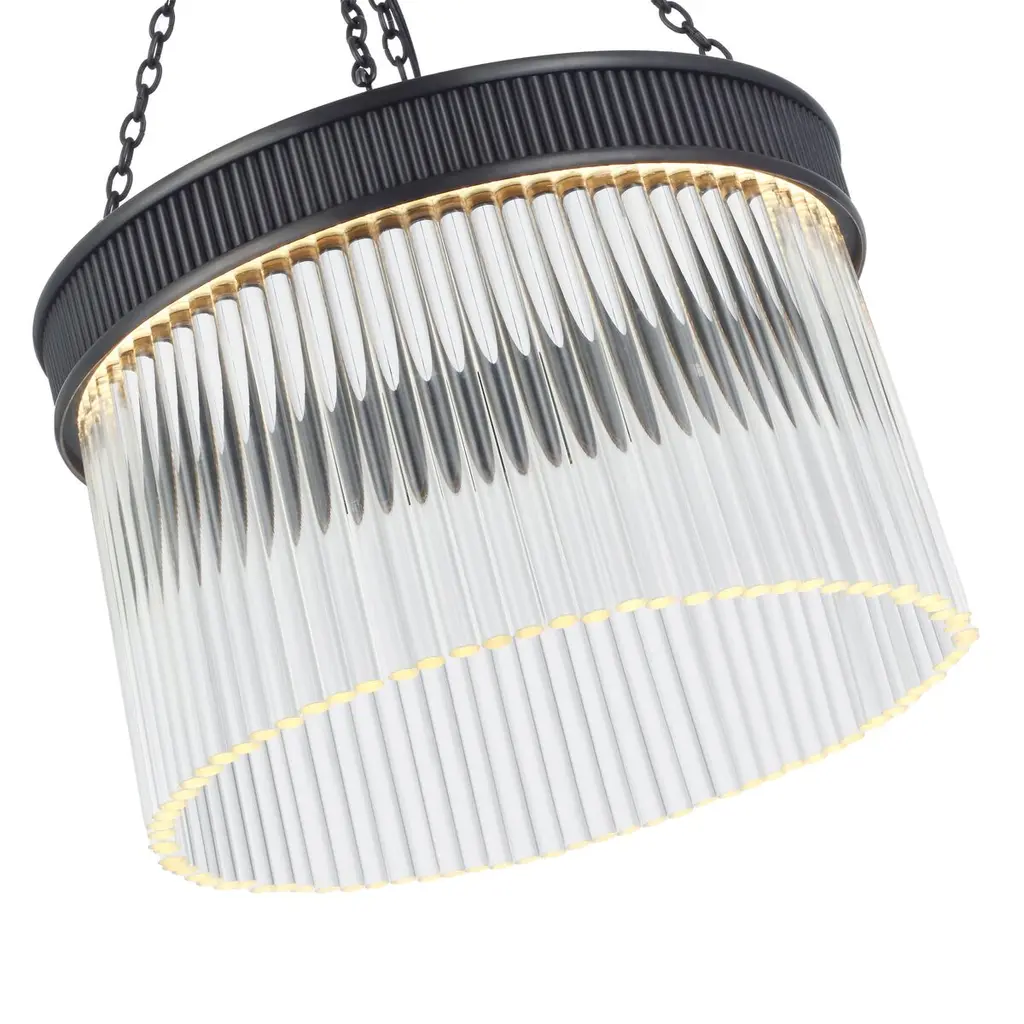 Fluting on the exterior of this chandelier's gleaming brass ring frame echoes the vertical lines of the crystal rods that hang from it. The crystal beautifully diffuses the light to create a warm, flattering glow.