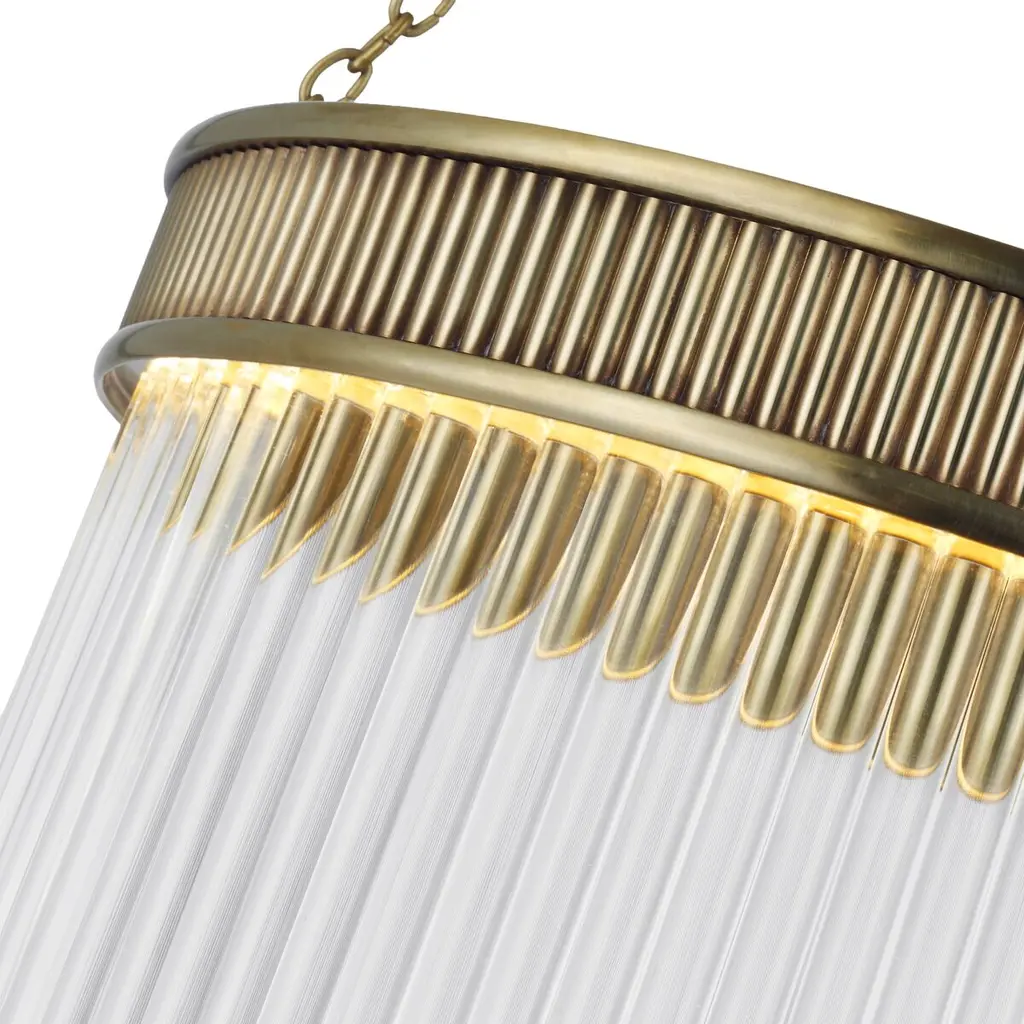 Fluting on the exterior of this chandelier's gleaming brass ring frame echoes the vertical lines of the crystal rods that hang from it. The crystal beautifully diffuses the light to create a warm, flattering glow.