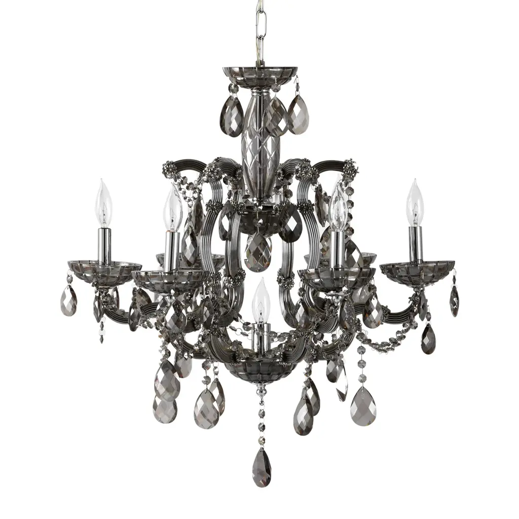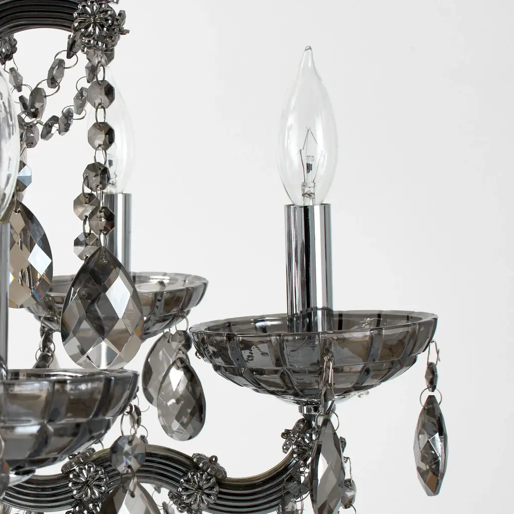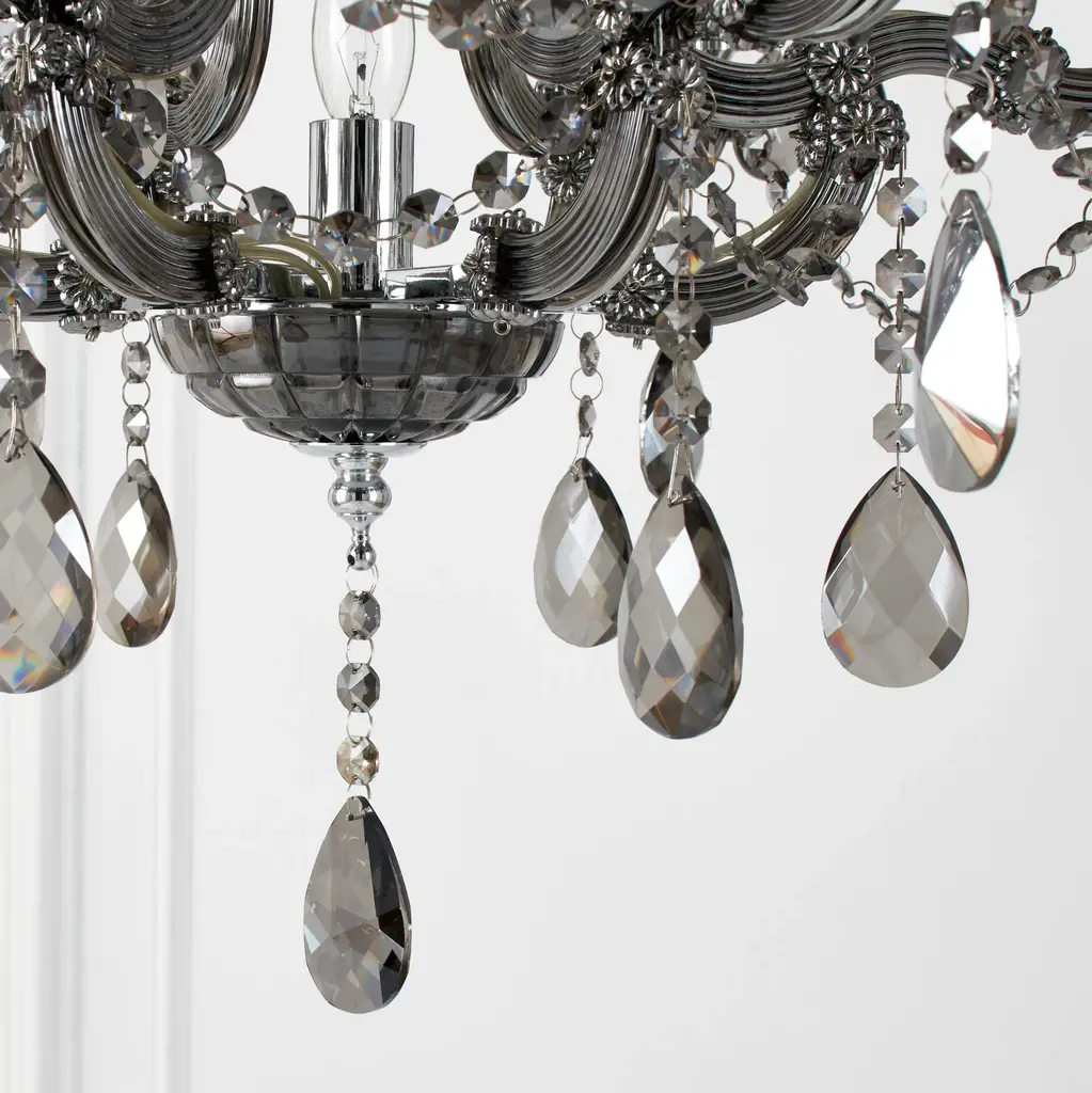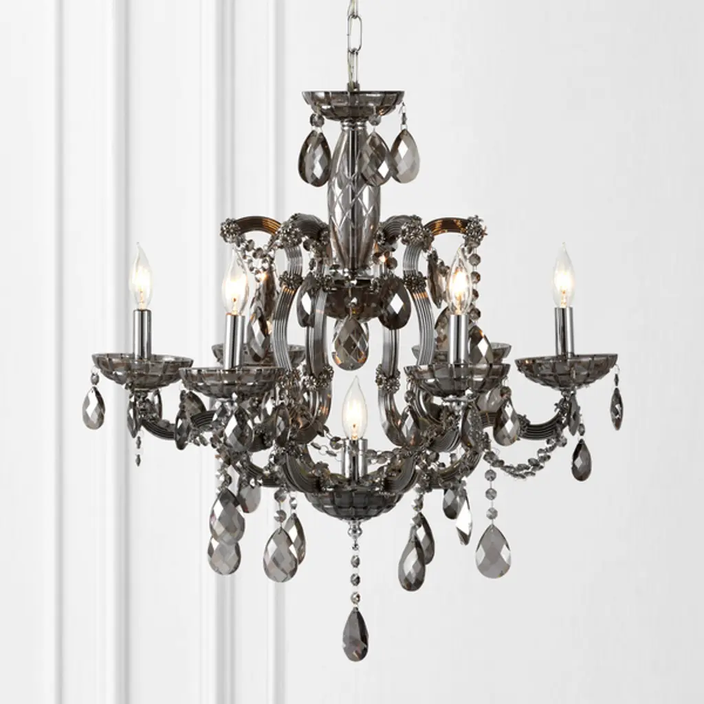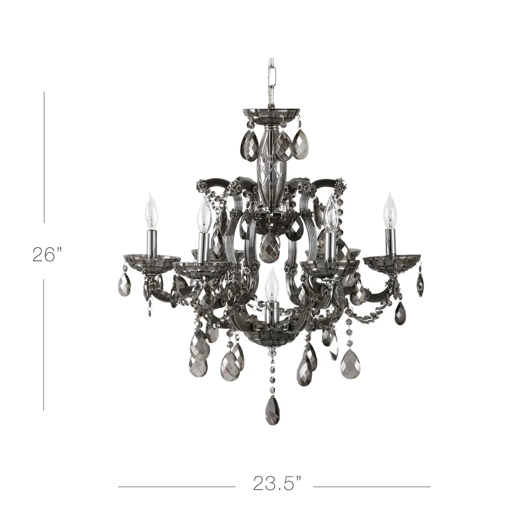 Our spectacular Mercer Chandelier delivers the ultimate in high glamour. Created entirely of reflective smoke glass to lend unparalleled sparkle and brilliance, the base is designed to reflect the romance of traditional Venetian chandeliers. The real magic happens with layers of faceted crystal swags and heavy crystal drops.