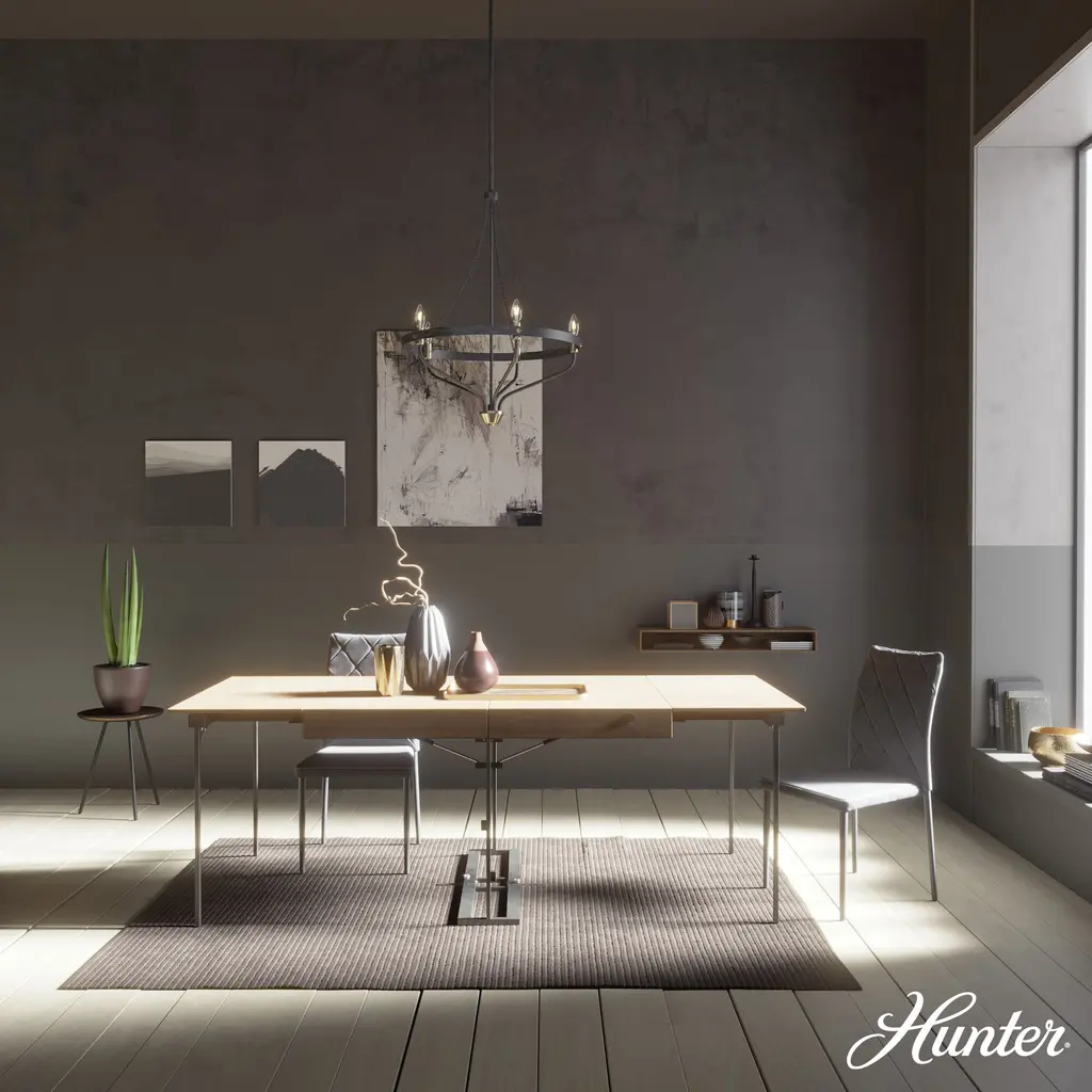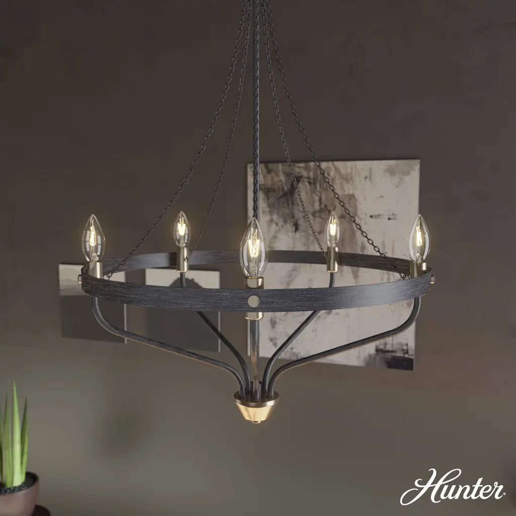 Warmth and wonder converge in Hunter’s 5 light chandelier—a showstopping piece from our Merlin collection. A glowing ring of lights evokes a sense of magic and mystery, while the Merlin’s modern angles and clean lines serve to ground the fixture in contemporary style. Available in multiple finishes, the Merlin 5 light chandelier is a mesmerizing addition to your design scheme.