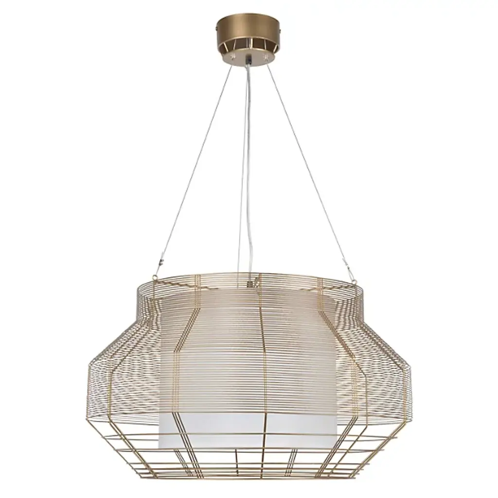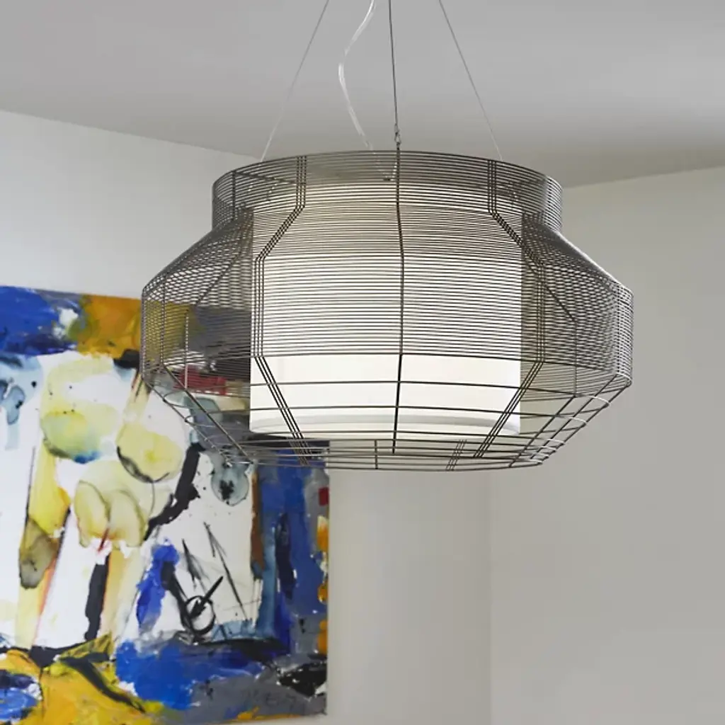 Add beauty and elegance to your favorite space with the Mesh Chandelier from Forestier. Designed by Arik Levy in 2016, this piece uses metal and fabric to maximum effect, creating a pleasing silhouette that works well with a range of home decors. Tight and thin metal lines angle sharply, creating an enclosure around a large, cylindrical fabric shade. A single bulb sits at the center, emitting a bright glow throughout the shade. Muted slightly, a relaxing ambiance flows over the space.