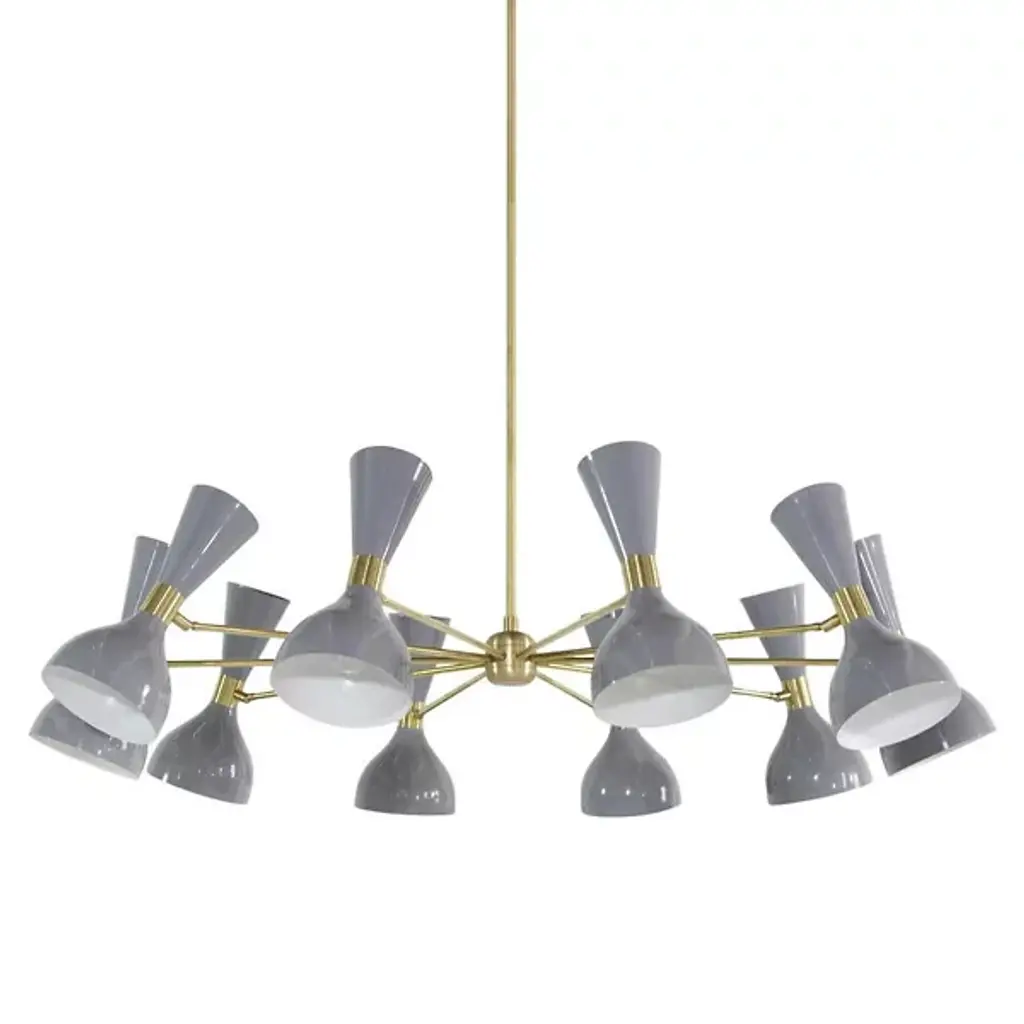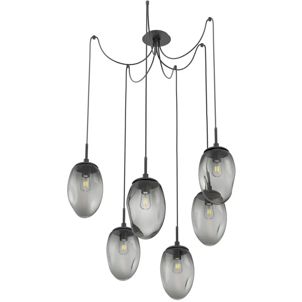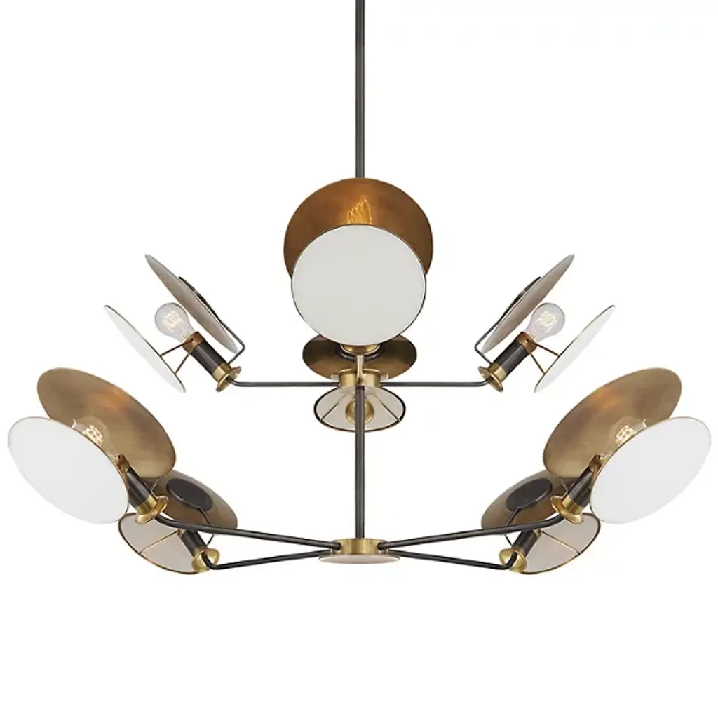 The Metalo Misto Chandelier from George Kovacs redefines overhead lighting through its single-tier arrangement of curved steel panels that appear caught in a gentle whirlwind. Each metallic segment flows into the next, creating a continuous circular motion around the central light source. The dimmable design casts light both upward and outward through strategic gaps between the panels. The suspension system keeps the fixture perfectly balanced while emphasizing its apparent weightlessness. Multiple light points work together to illuminate the space while highlighting the dimensional quality of the design.