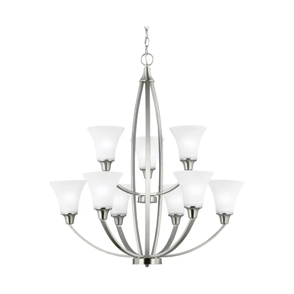 The Metcalf nine light multi tier chandelier in brushed nickel is an ENERGY STAR½ qualified lighting fixture that uses LED bulbs to save you both time and money. The soft curves give the transitional Metcalf lighting collection by its clean, subtle look. The modern silhouette of the Satin Etched glass shades reinforces the easy and casual lines of this design. Equally at home in a contemporary, urban setting or a transitional decor in the suburbs, the full lighting collection is offered in Autumn Bronze and Brushed Nickel finishes and is comprised of nine-, five- and three-light chandeliers; one- and three-light pendants, mini pendant, two-light semi-flush mount; and one-, two-, three- and four-light bath fixtures. Incandescent and ENERGY STAR-qualified LED lamping are available; all fixtures are California Title 24 compliant.