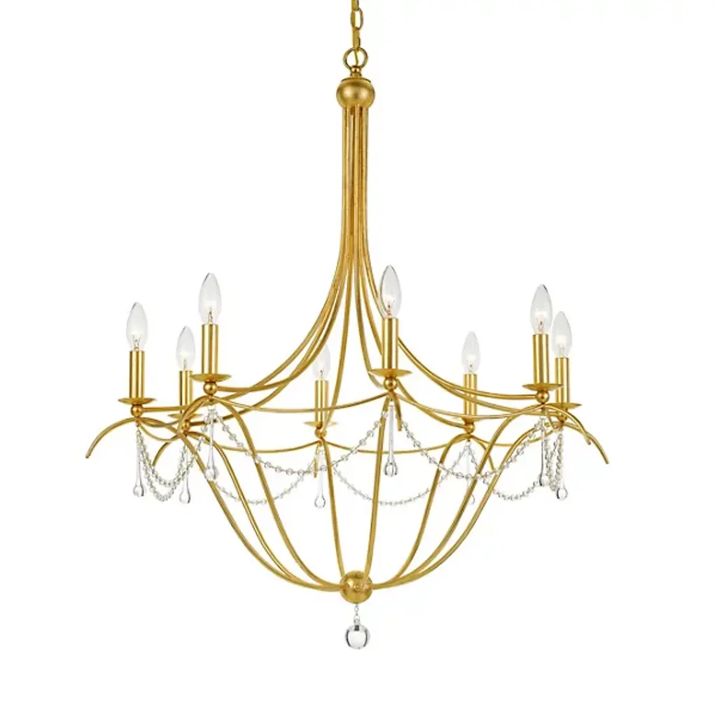 Delicate and with antique charm, the Metro Chandelier by Crystorama will add a touch of elegance to your home. A wrought iron frame swoops gracefully to create the candelabra arms, each suspending a glossy crystal droplet below. A beaded crystal garland streams from arm to arm and a single glass bead is suspended from its center to underline its ornamental design. The warm, glowing light of its bulbs emit a calm and inviting quality that glistens across its crystal accents.