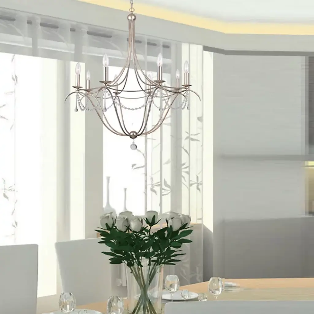 Delicate and with antique charm, the Metro Chandelier by Crystorama will add a touch of elegance to your home. A wrought iron frame swoops gracefully to create the candelabra arms, each suspending a glossy crystal droplet below. A beaded crystal garland streams from arm to arm and a single glass bead is suspended from its center to underline its ornamental design. The warm, glowing light of its bulbs emit a calm and inviting quality that glistens across its crystal accents.