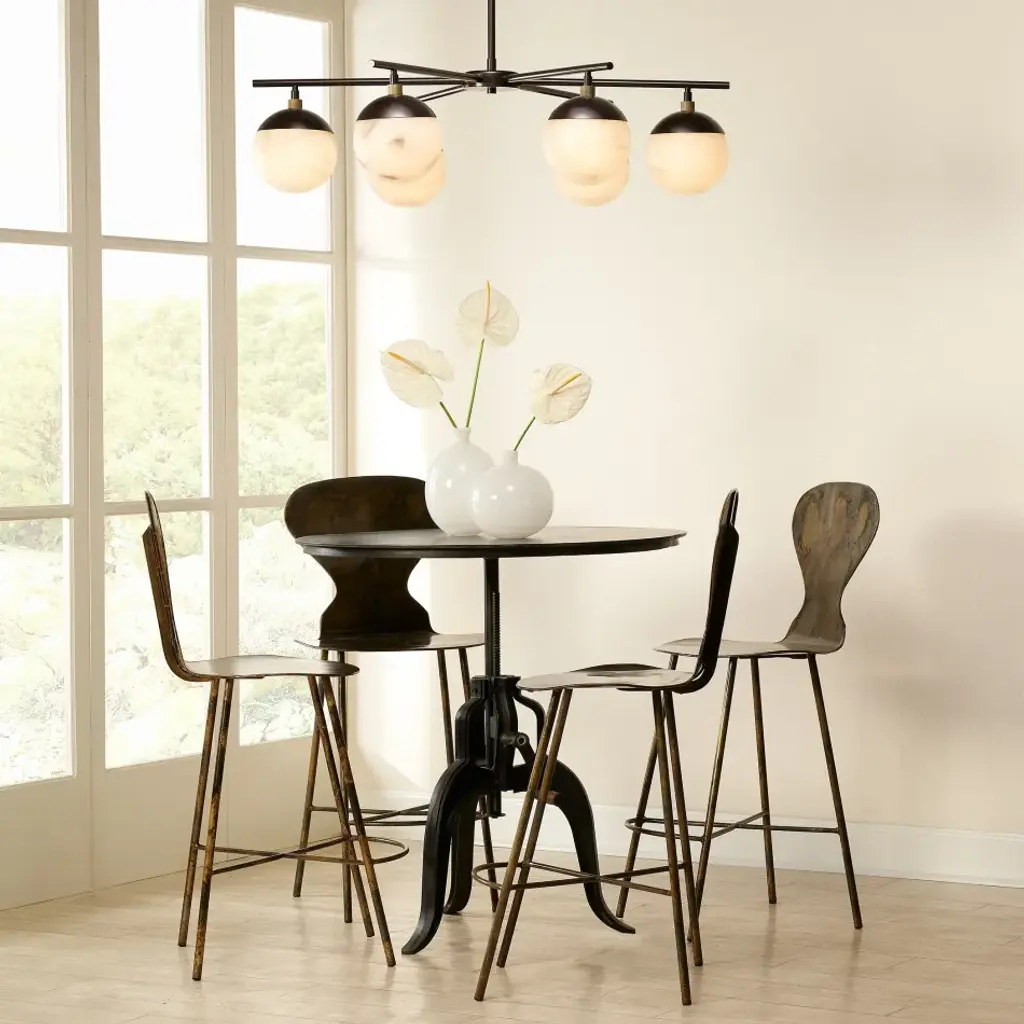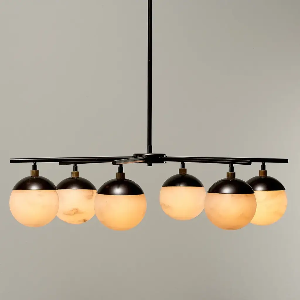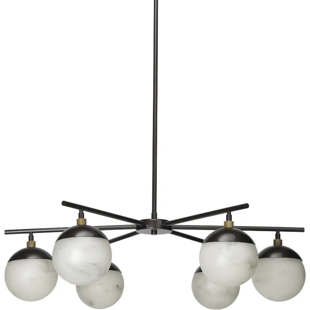 A brilliant display of two-toned metals and faux alabaster orbs, this chandelier is thoroughly modern. Borrowing inspiration from mid-century form, the sleek disposition and substantial presence brings the best of both design worlds home. The delicate swirl patterns and veining of natural stone is recreated carefully by hand from high quality resin and are unique to each shade. Placed over a round dining table or conversation area, this fixture is sure to be a conversation starter!