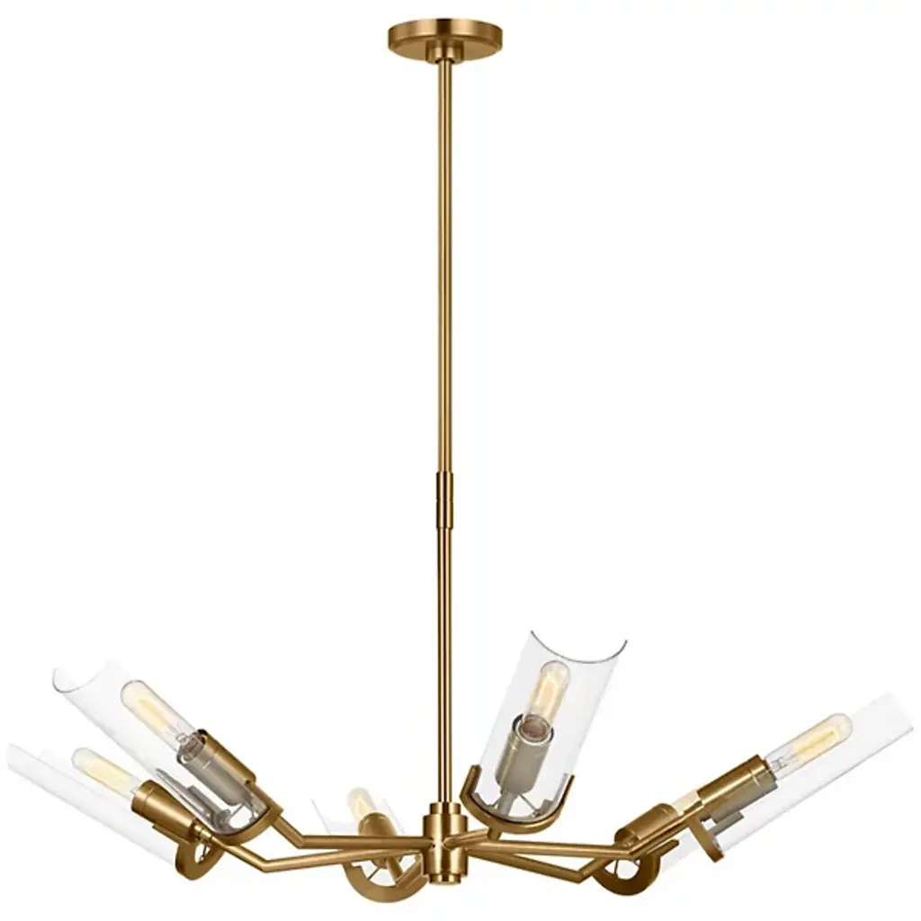 The Mezzo Chandelier by Visual Comfort Studio is a marriage of geometric forms. Clear glass shades surround brilliant LEDs, which illuminate your living space with ease. Fine steel framework outwardly splays from a focal point, giving this fixture an angular appearance that will elevate your interior design to new heights.
