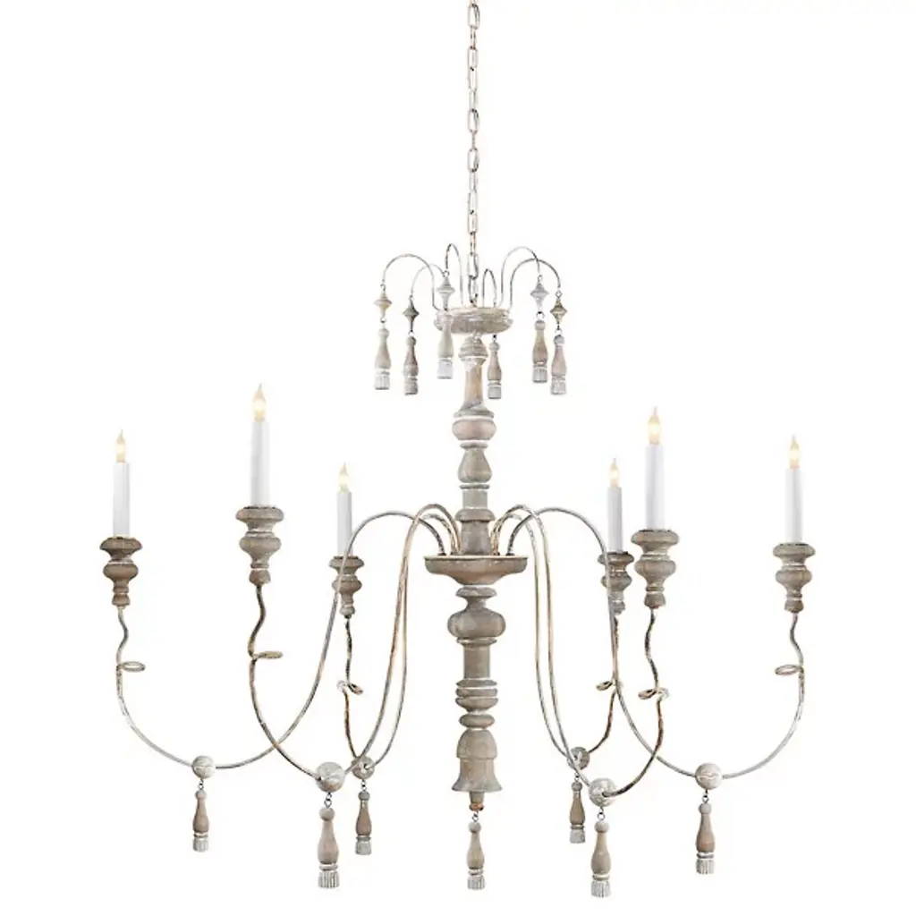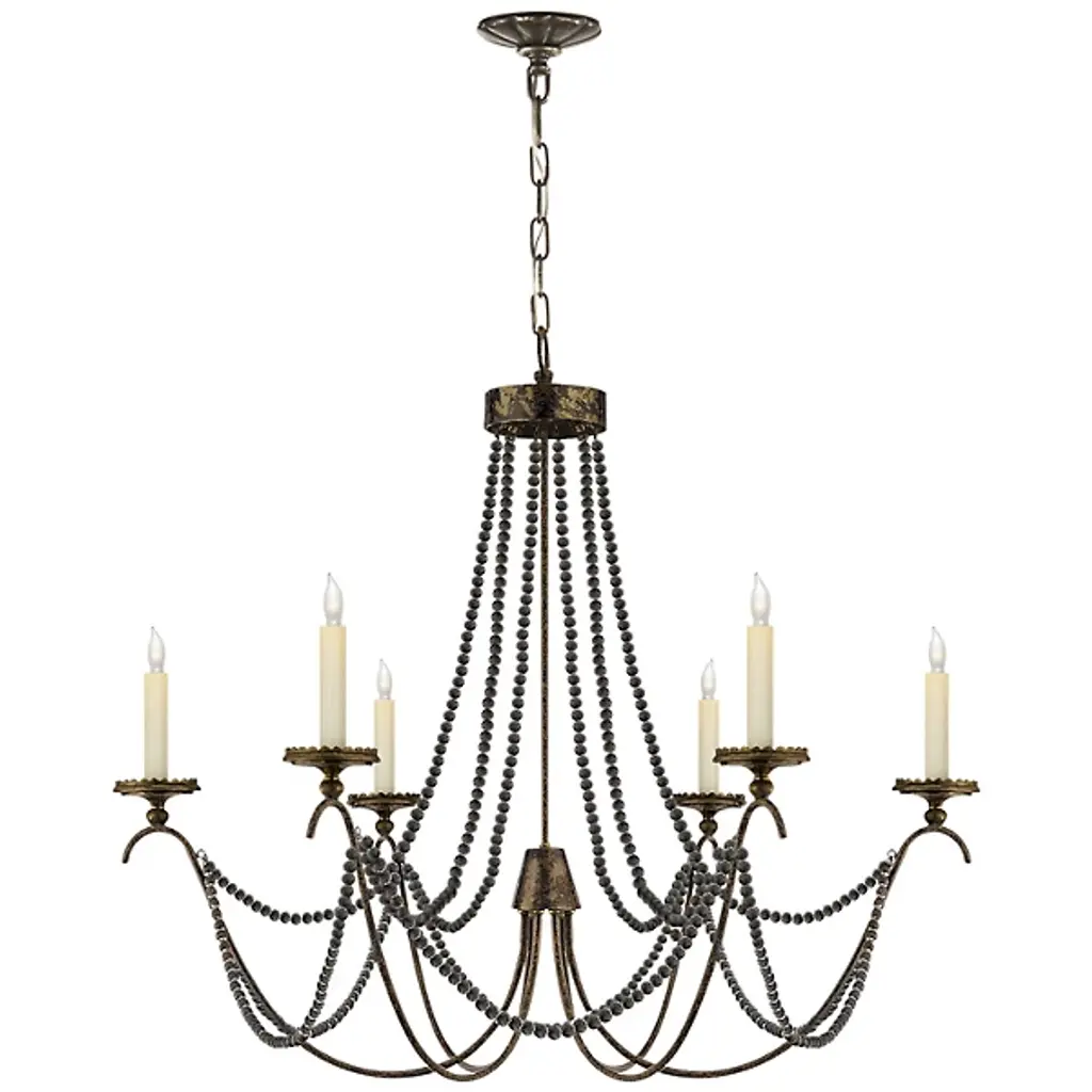 The perfect marriage of romantic and rustic, here's the Michele 6-Light Chandelier by Visual Comfort Signature, formerly known as Visual Comfort, Woodworking details on the spindle, candle cups, bobeches and bead drops bring a stylish touch of antique chic to a contemporary space. Its scrolling and twisting candelabra arms add whimsy and delicacy. Install this medium-sized ceiling fixture to create a French country foyer, a lavish living space or a dramatic dining room.