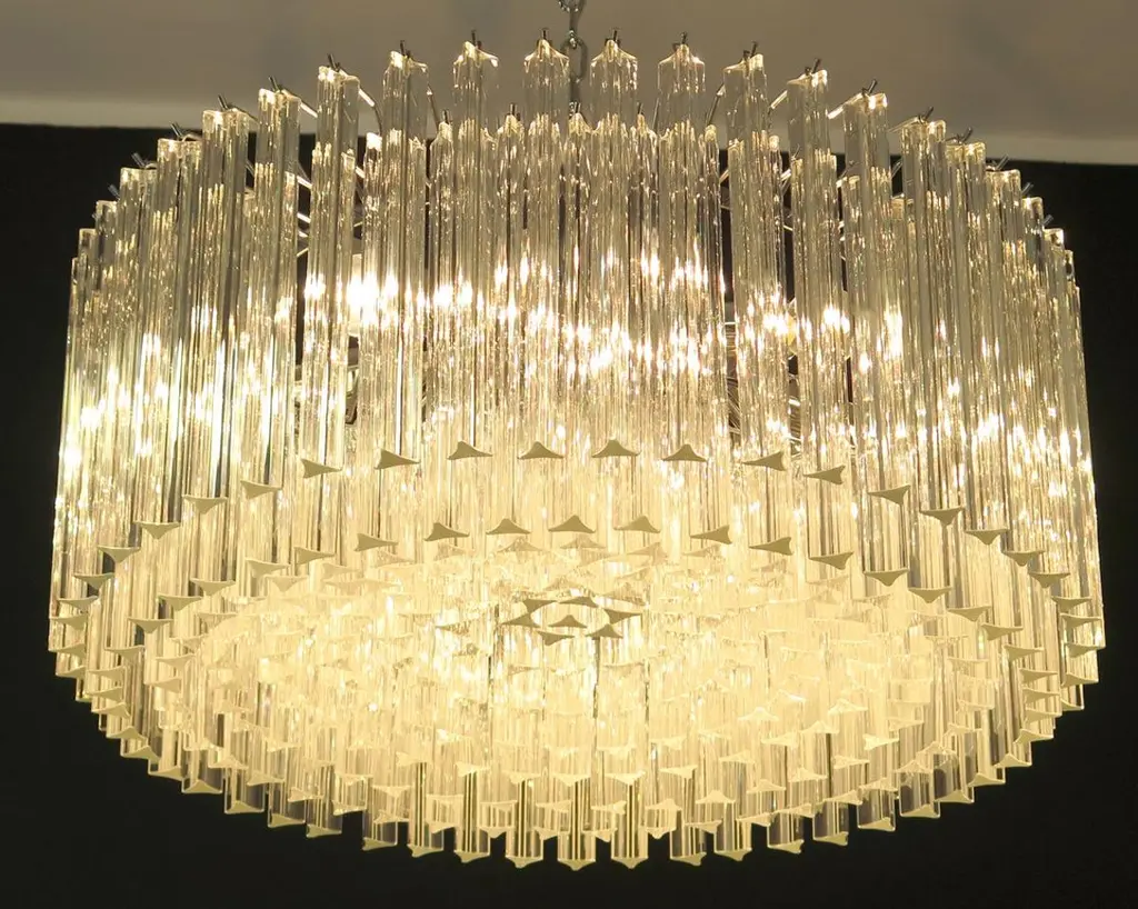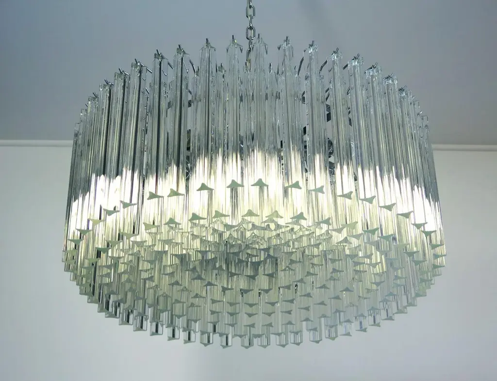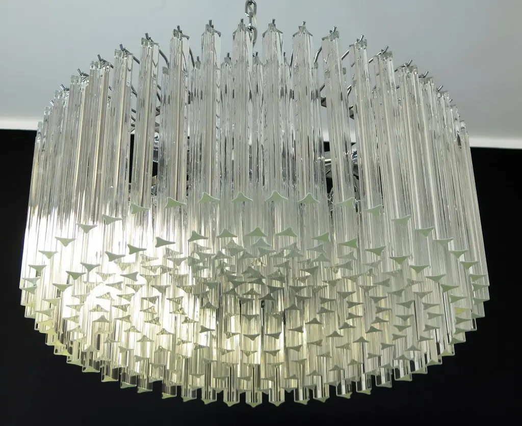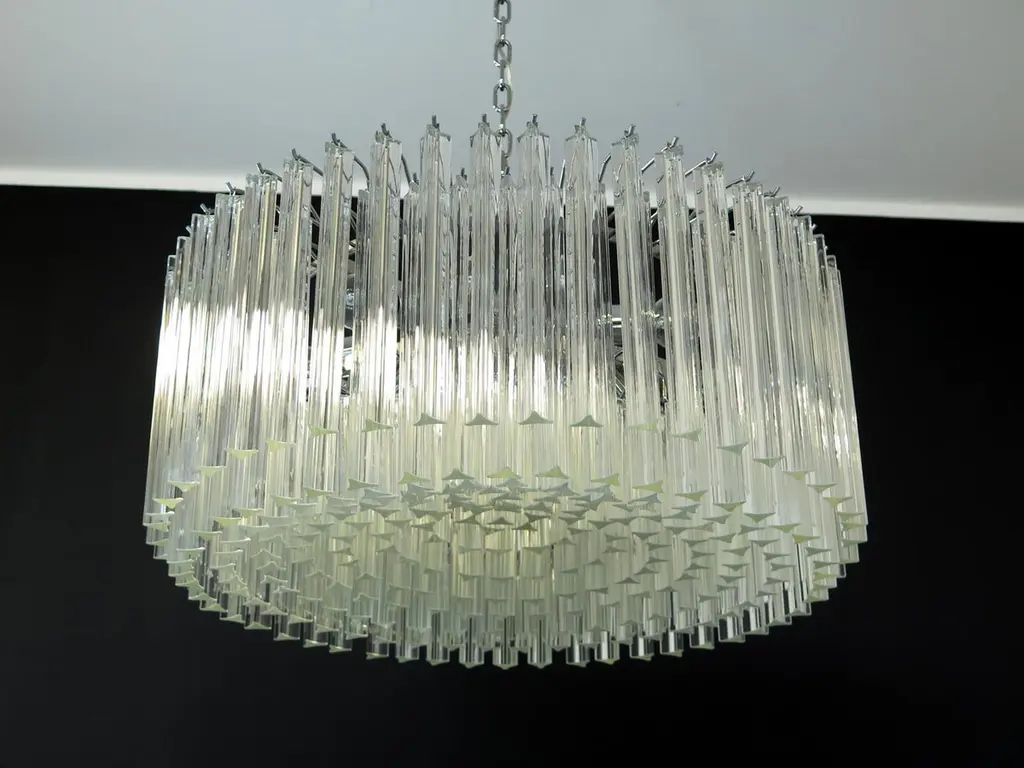 Pair Triedri Murano glass chandeliers, 265 trasparent prismA magnificent Murano glass chandelier, 265 pink triedri on crome frame. This large midcentury Italian chandelier is truly a timeless Classic.Period: late 20th centuryDimensions: 43.30 inches (110 cm) height with chain, 15.75 inches (40 cm) height without chain, 29.50 inches (75 cm) diameter. (The measurements are taken with a chandelier mounted, so there can be minimal differences)Dimension of glasses: 96 pink triedri, height 11 inches (28 cm) + 169 pink triedri, height 3.95 inches (10 cm)Light bulbs: 8 light bulbs, E27 dimension (not included in the sale), on request we can replace the lamp holders with those suitable for the American electrical system.Condition: Perfect condition and fully working.