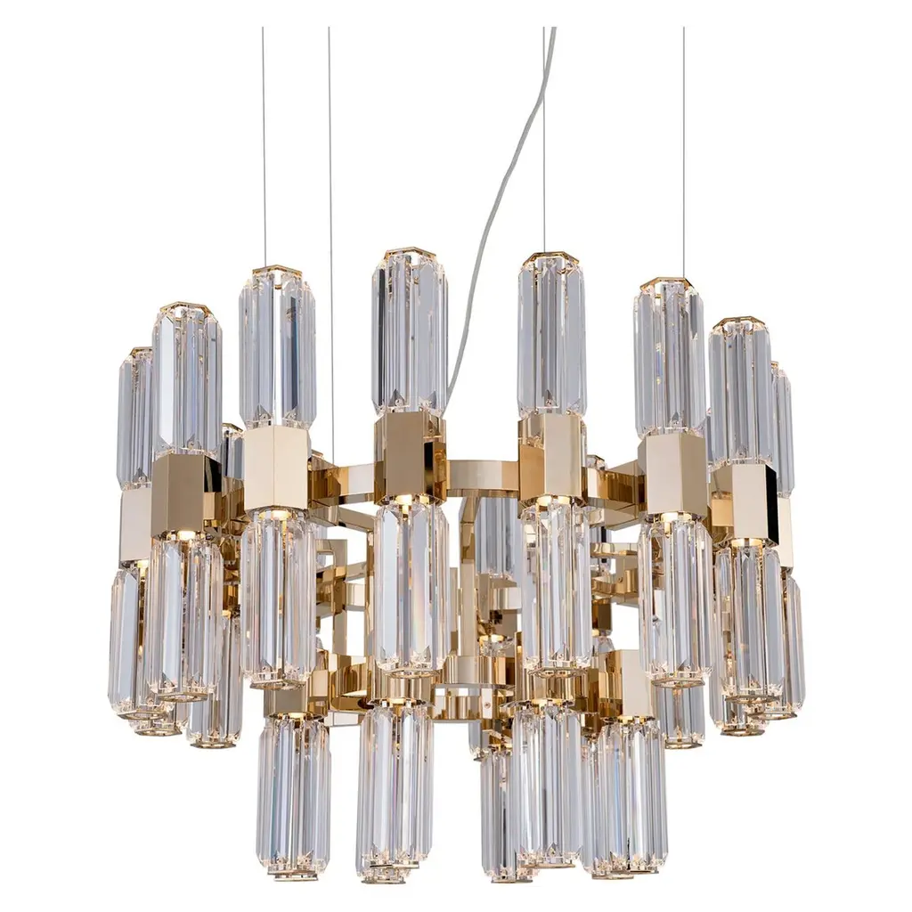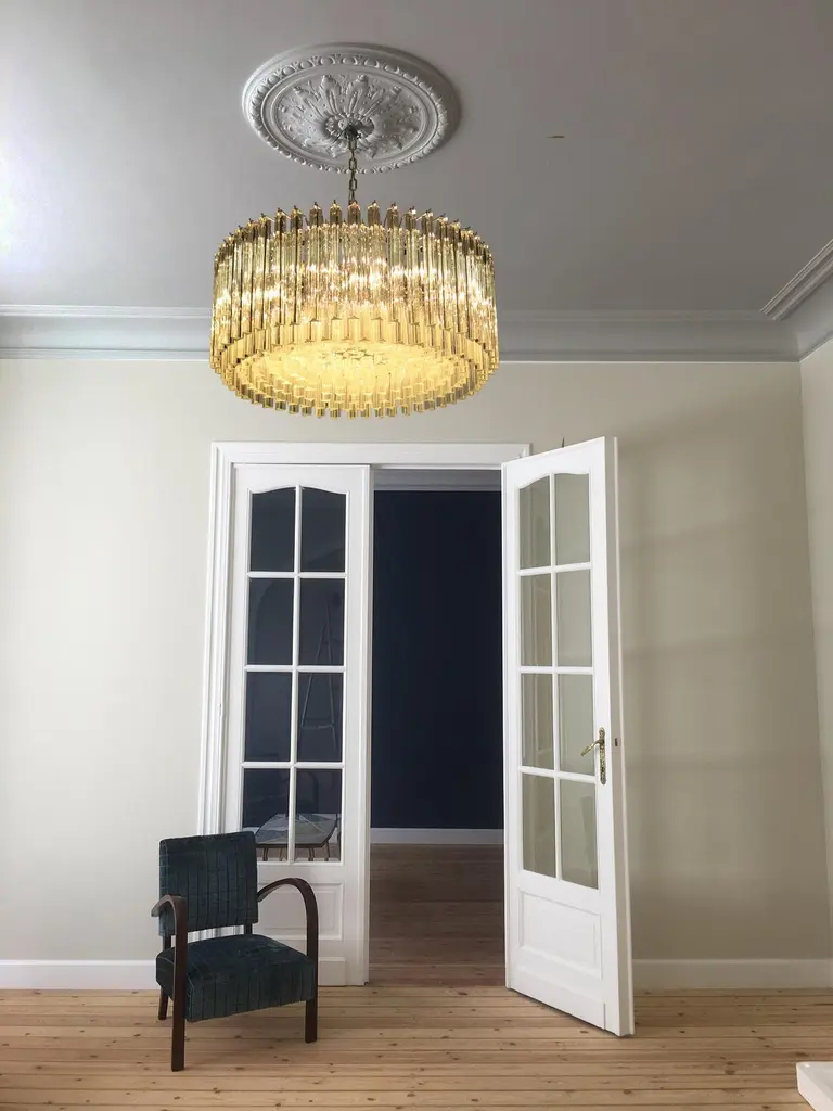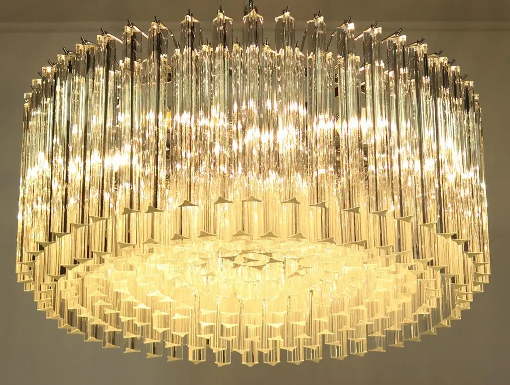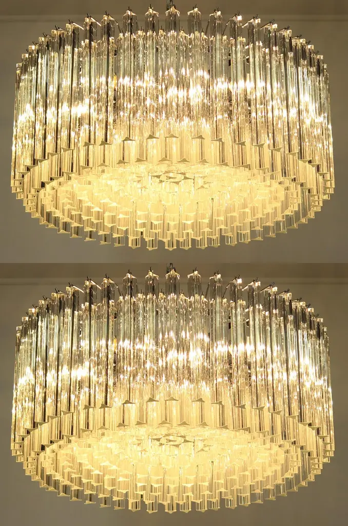 Pair Triedri Murano glass chandeliers, 265 trasparent prismA magnificent Murano glass chandelier, 265 pink triedri on crome frame. This large midcentury Italian chandelier is truly a timeless Classic.Period: late 20th centuryDimensions: 43.30 inches (110 cm) height with chain, 15.75 inches (40 cm) height without chain, 29.50 inches (75 cm) diameter. (The measurements are taken with a chandelier mounted, so there can be minimal differences)Dimension of glasses: 96 pink triedri, height 11 inches (28 cm) + 169 pink triedri, height 3.95 inches (10 cm)Light bulbs: 8 light bulbs, E27 dimension (not included in the sale), on request we can replace the lamp holders with those suitable for the American electrical system.Condition: Perfect condition and fully working.