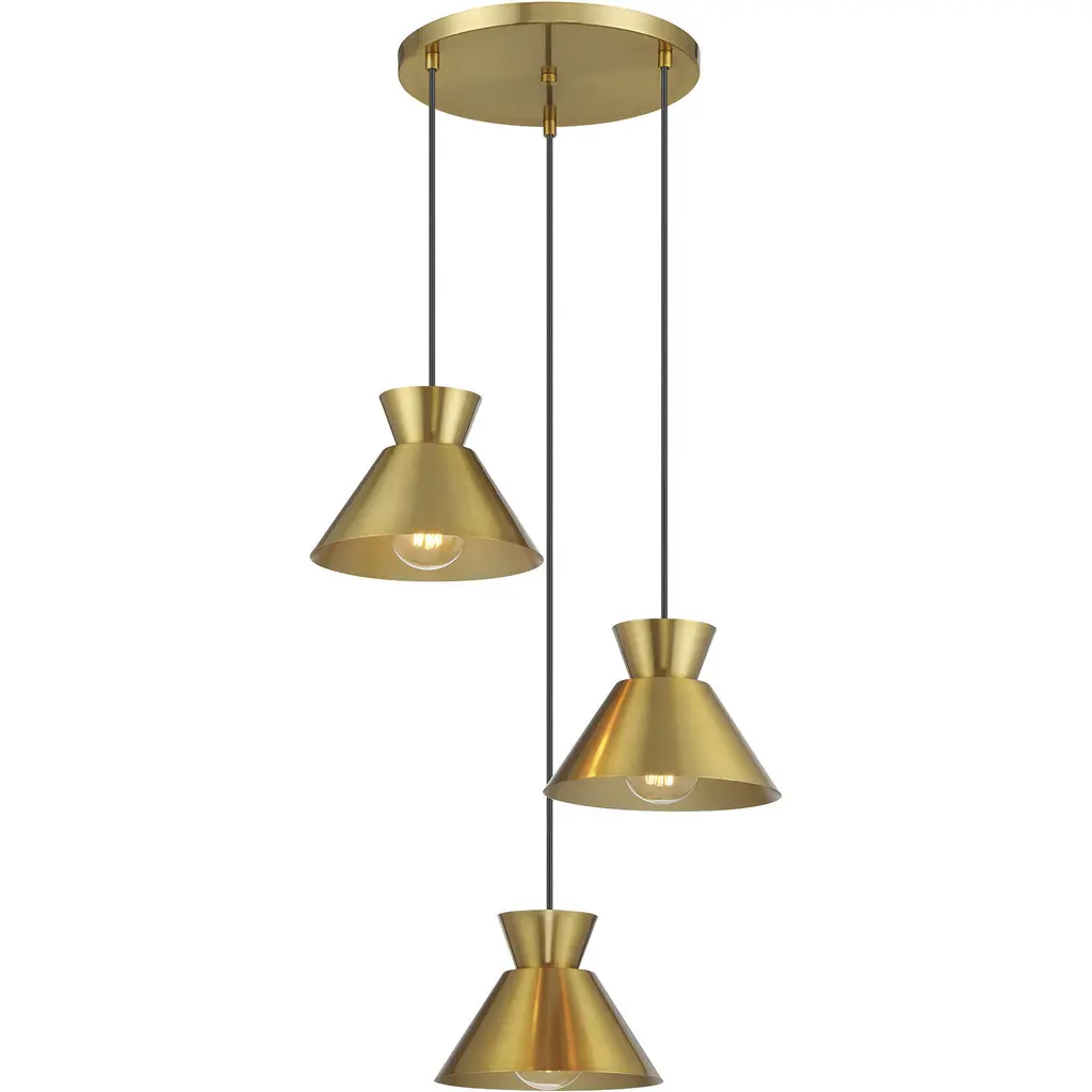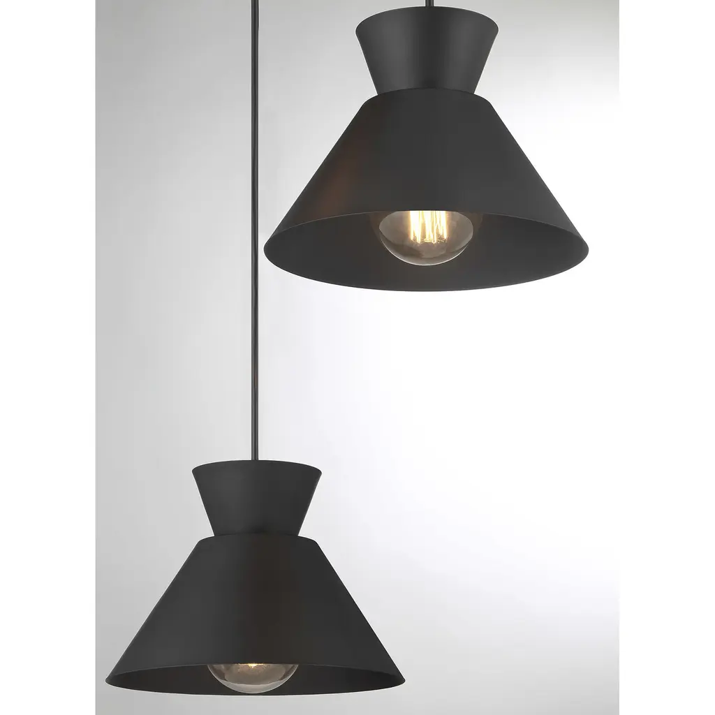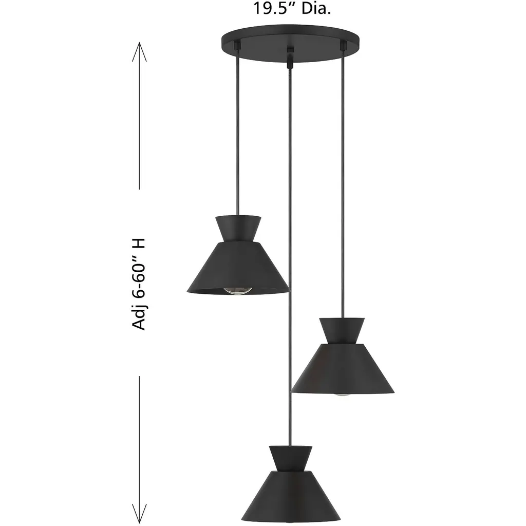 Get iconic mid-century modern style with this 3-light pendant, which has chic conical solid metal shades finished in Matte Black. The sleek black hanging cords allow you to adjust the hanging height of each light to meet the needs of your space. The height ranges from 6" to 126". The width is 19.5". Uses 3 standard size bulbs of up to 60 watts per bulb. Bulbs not included.