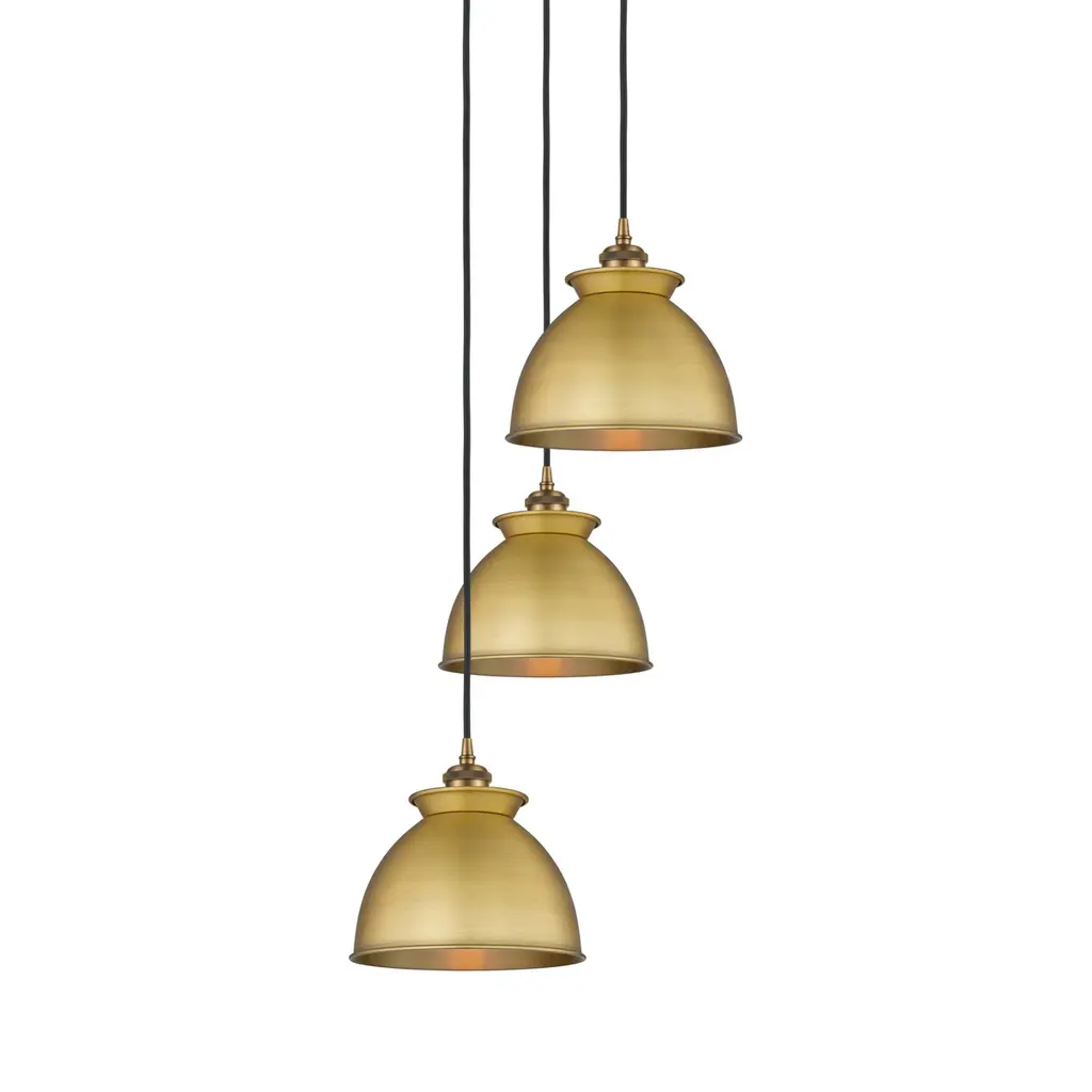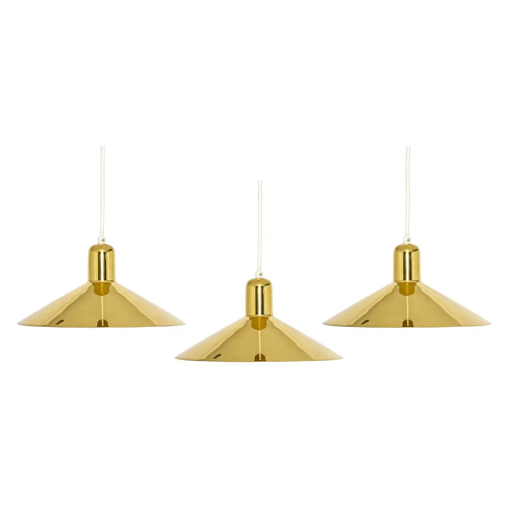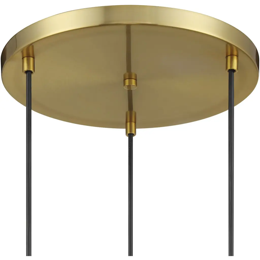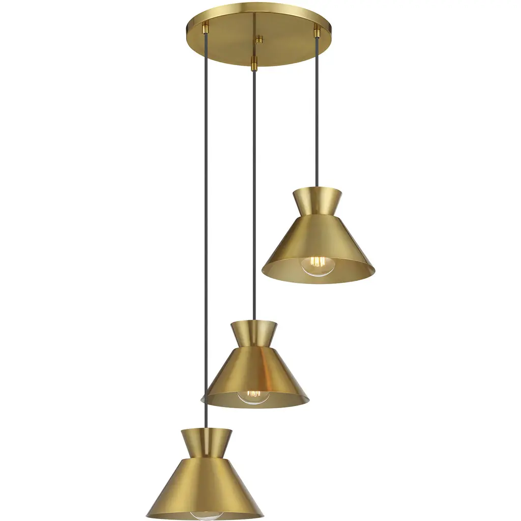 Get iconic mid-century modern style with this 3-light pendant, which has chic conical solid metal shades finished in Natural Brass. The sleek black hanging cords allow you to adjust the hanging height of each light to meet the needs of your space. The height ranges from 6" to 126". The width is 19.5". Uses 3 standard size bulbs of up to 60 watts per bulb. Bulbs not included.
