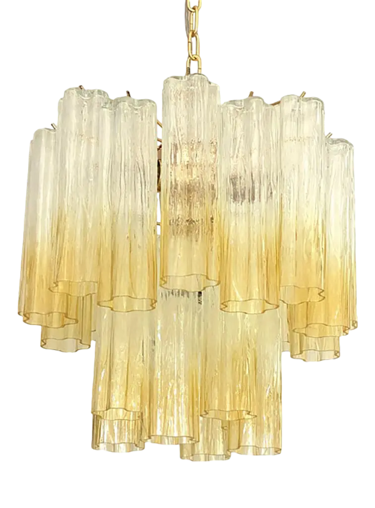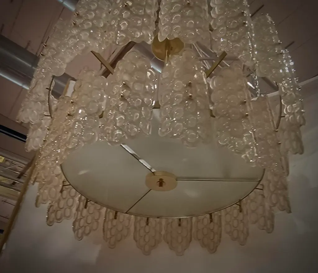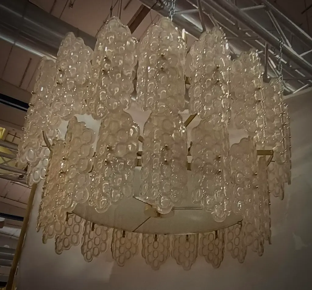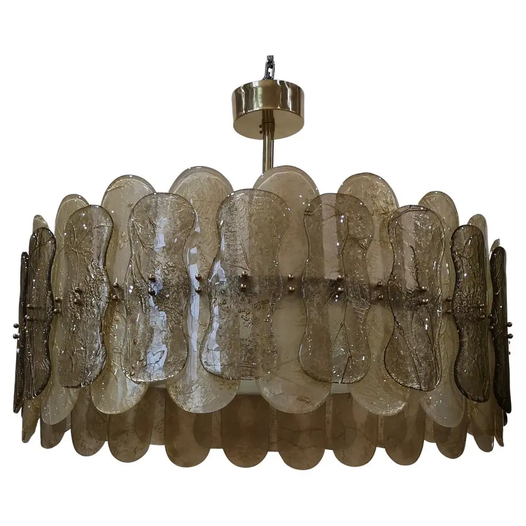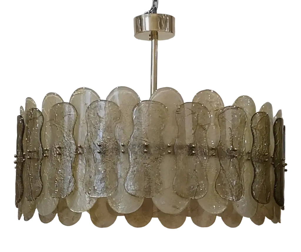 Fantastic round chandelier in Murano glass and polished brass. Note the shape of the light gold colored Murano glass shells, very beautiful and particular. Simple but very elegant linear Murano chandelier. Murano chandelier in artistic glass and brass. Composed of a circular structure with two concentric rings, one smaller and one larger, to which half light gold colored glass shells are inserted. The glasses are treated with a particular process that gives them a lively surface. These shells are arranged in a row along the perimeter of a circle, and anchored to the structure with brass screws. In the upper part the chandelier is open and lets out a large amount of light. In the lower part and between the two concentric structures instead the sandblasted glass has been positioned. The shape is that of a drum. A sort of very elegant ceiling light. The chandelier is fixed to the ceiling via a brass tube, through which the connection cable passes. At the end of the tube there is a beautiful canopy that hides the hook. European Plug (up to 250V).The wiring of this item may be original and might need replacement, if not specified otherwise.