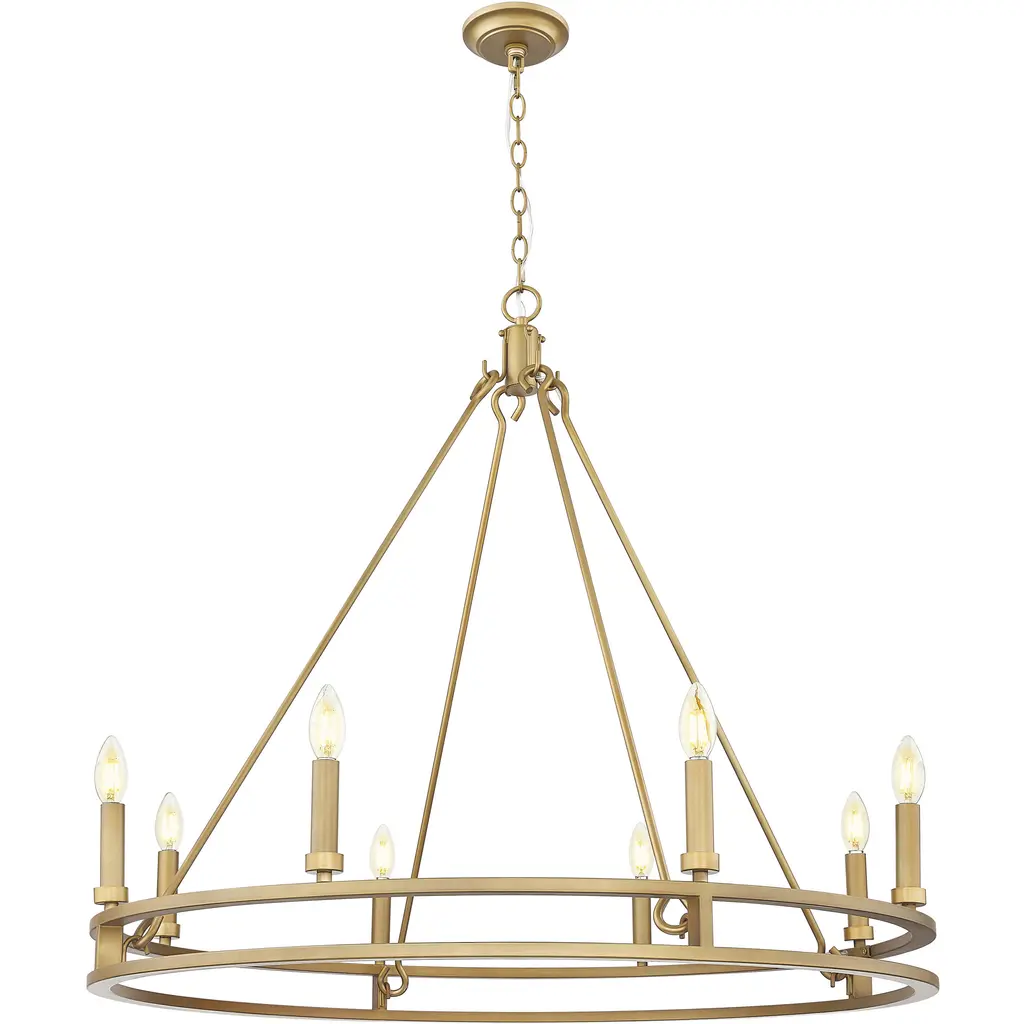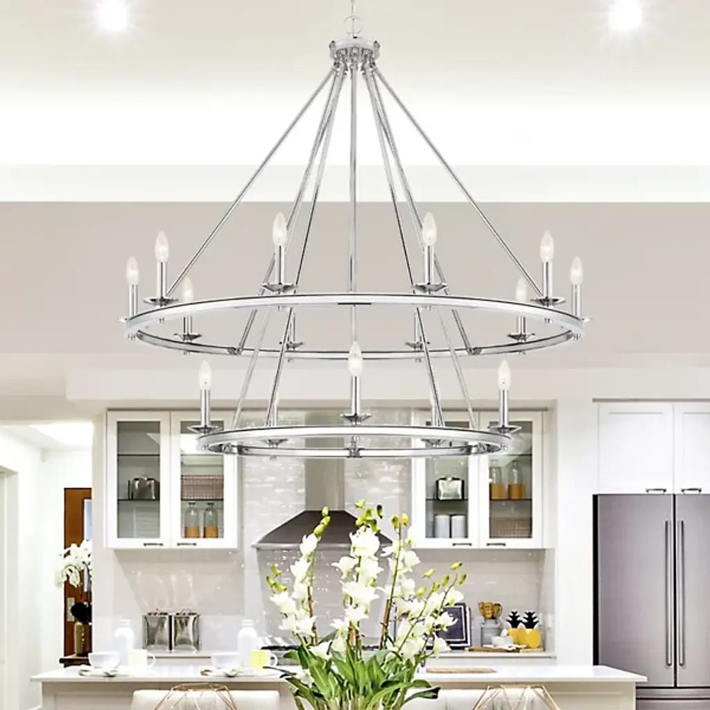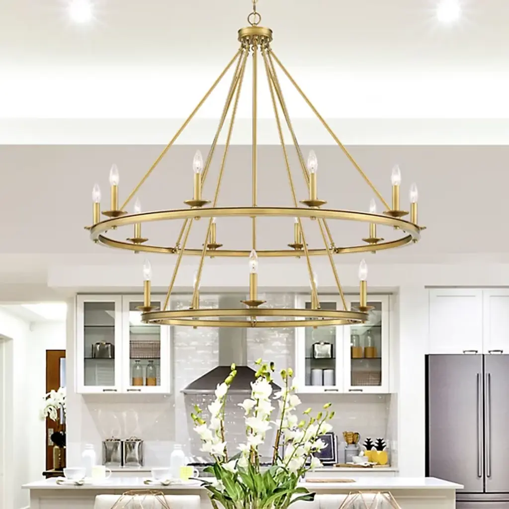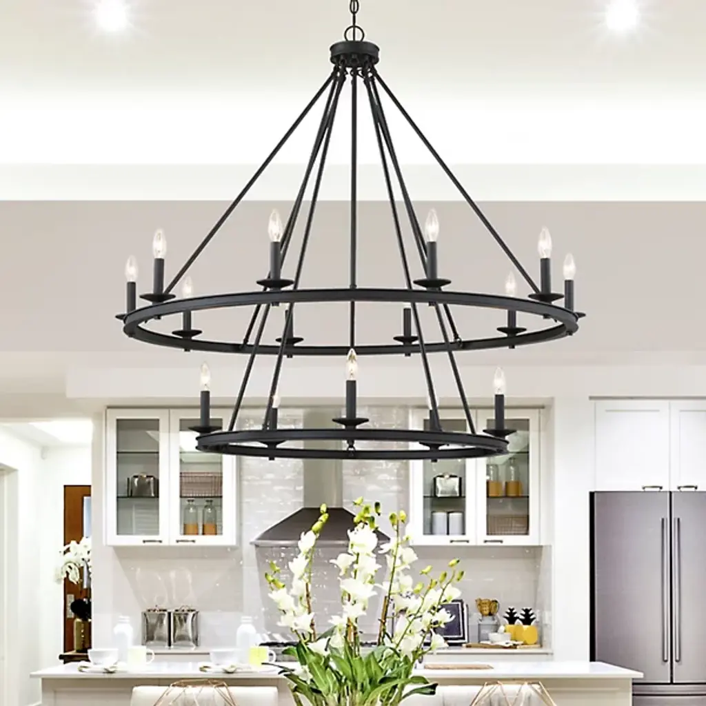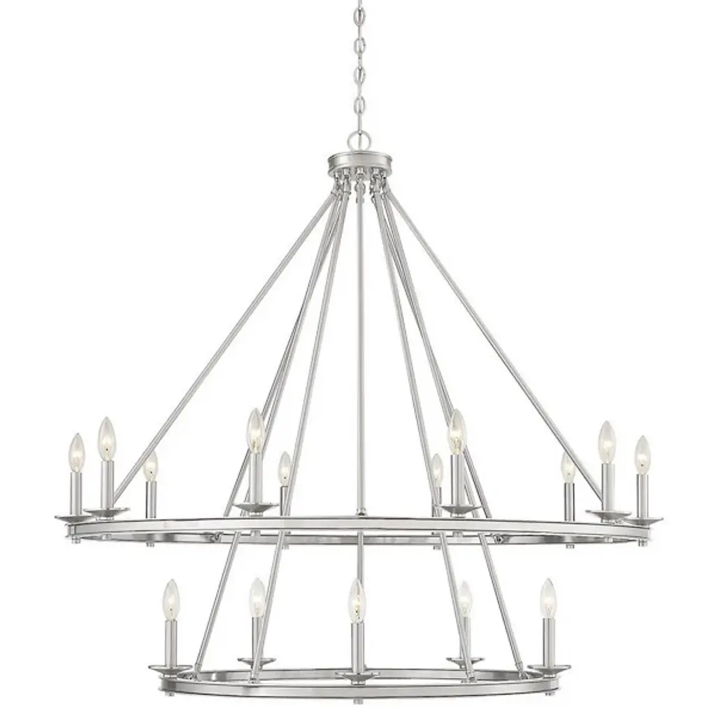 Countryside charm embodied. The Middleton 15-Light Chandelier by Savoy House has the looks and luminosity to fill any space with a relaxing farmhouse vibe. Suspending outward are long slender rods that hold a pair of open hoop frames. Treated with a classic bronze finish, each level is adorned with candelabra light sources (bulbs not included) that emit a balanced and inviting level of brightness that's suitable for any room where friends and family gather.