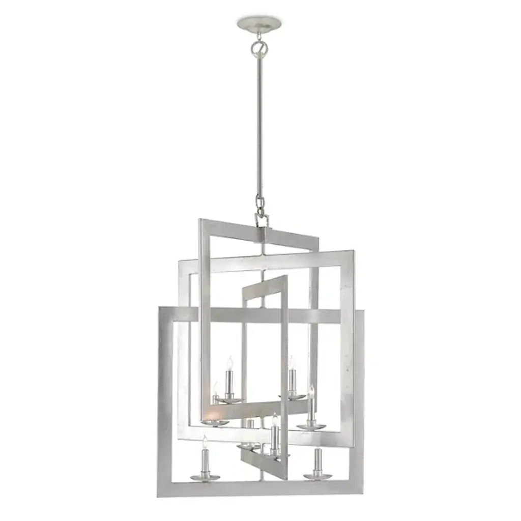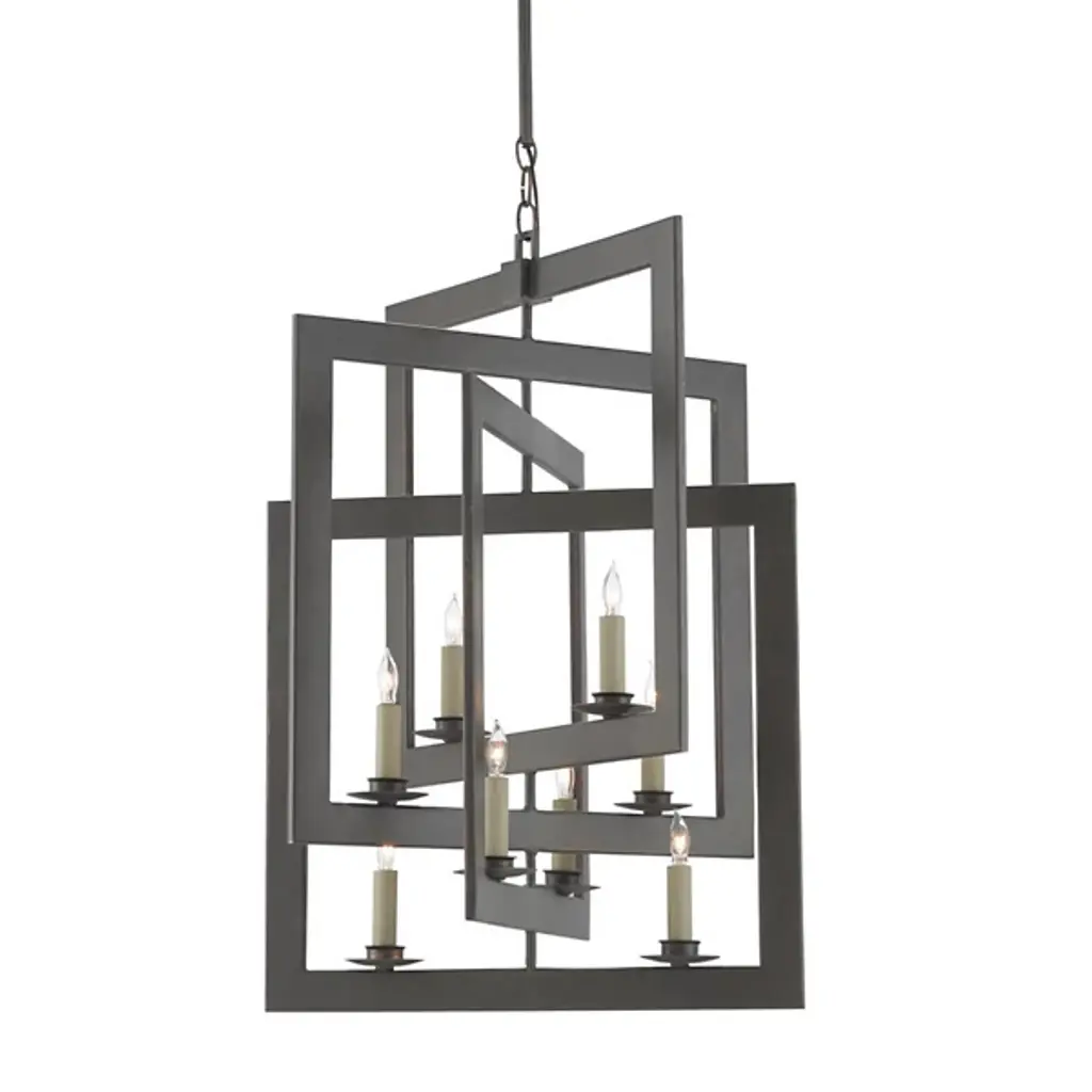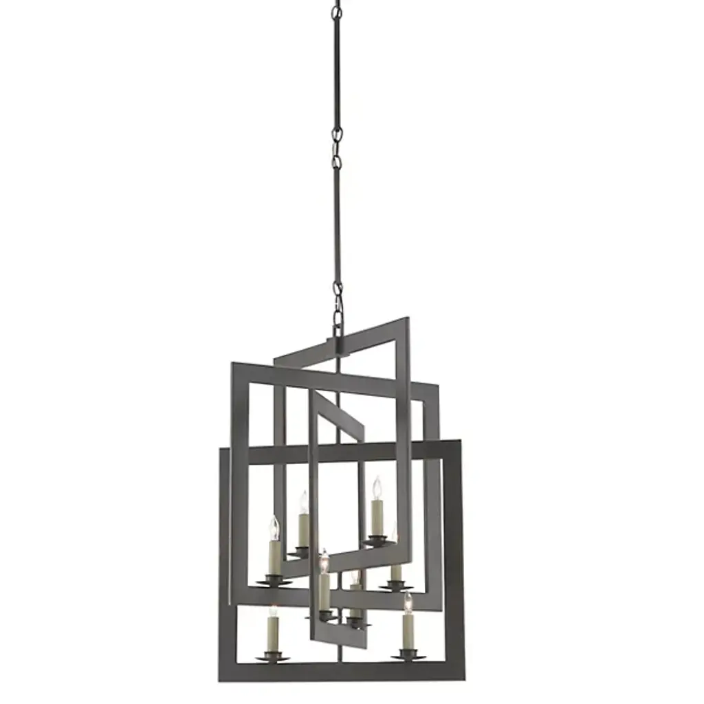 The Currey & Company Middleton Chandelier proves it's hip to be square. Four wrought iron squares are interlocked on four tiers, each bearing two exposed bulbs. The effect is not unlike a mobile, but the motion here is all perceived by the eye as each angle and corner bisects the negative space. Try with flame-tipped, tubular or globe-shaped bulbs to customize to any decor.
