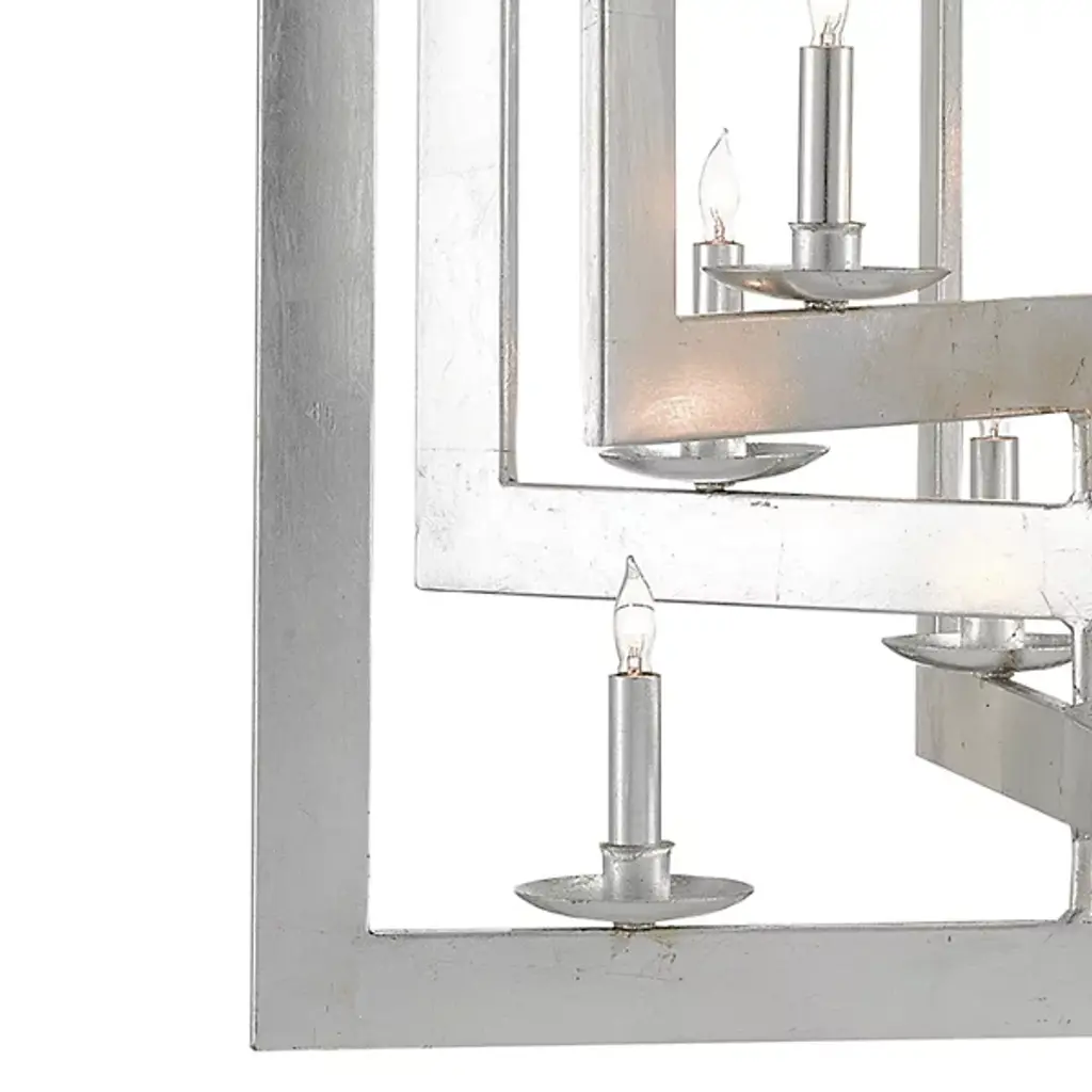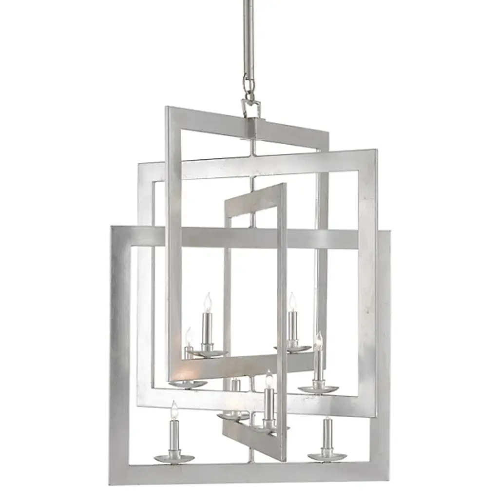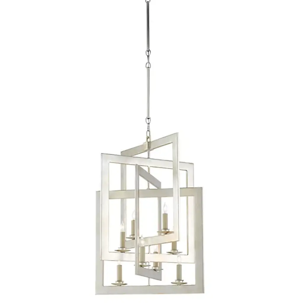 The Currey & Company Middleton Chandelier proves it's hip to be square. Four wrought iron squares are interlocked on four tiers, each bearing two exposed bulbs. The effect is not unlike a mobile, but the motion here is all perceived by the eye as each angle and corner bisects the negative space. Try with flame-tipped, tubular or globe-shaped bulbs to customize to any decor.