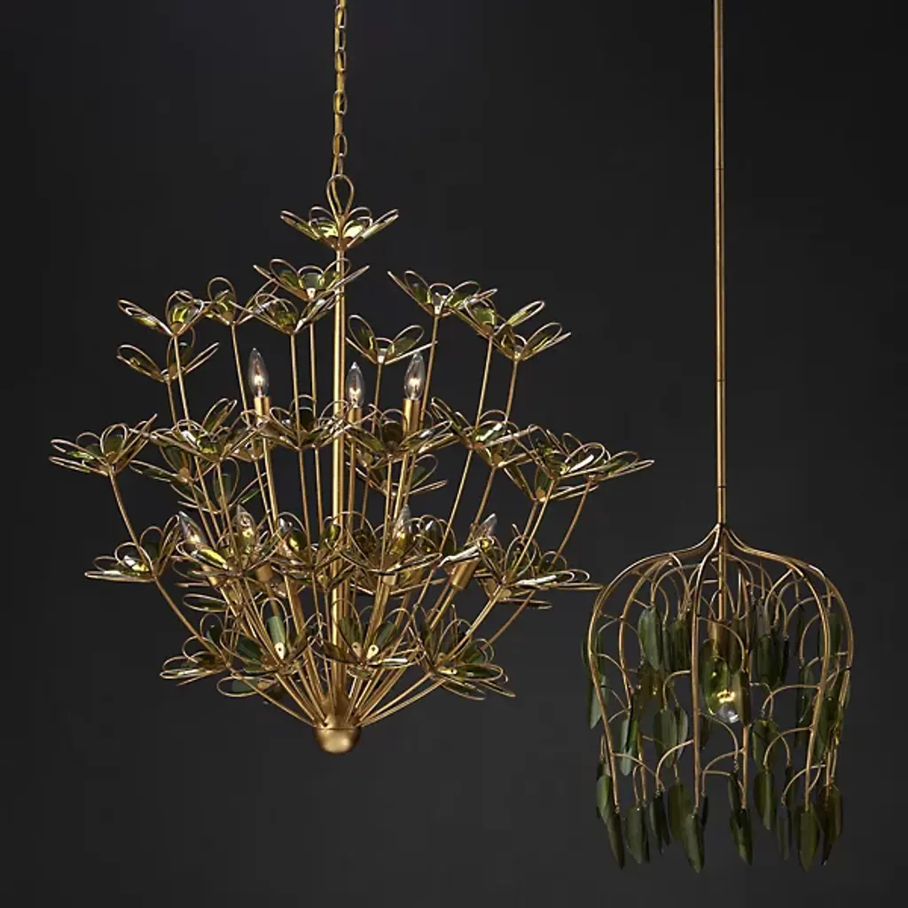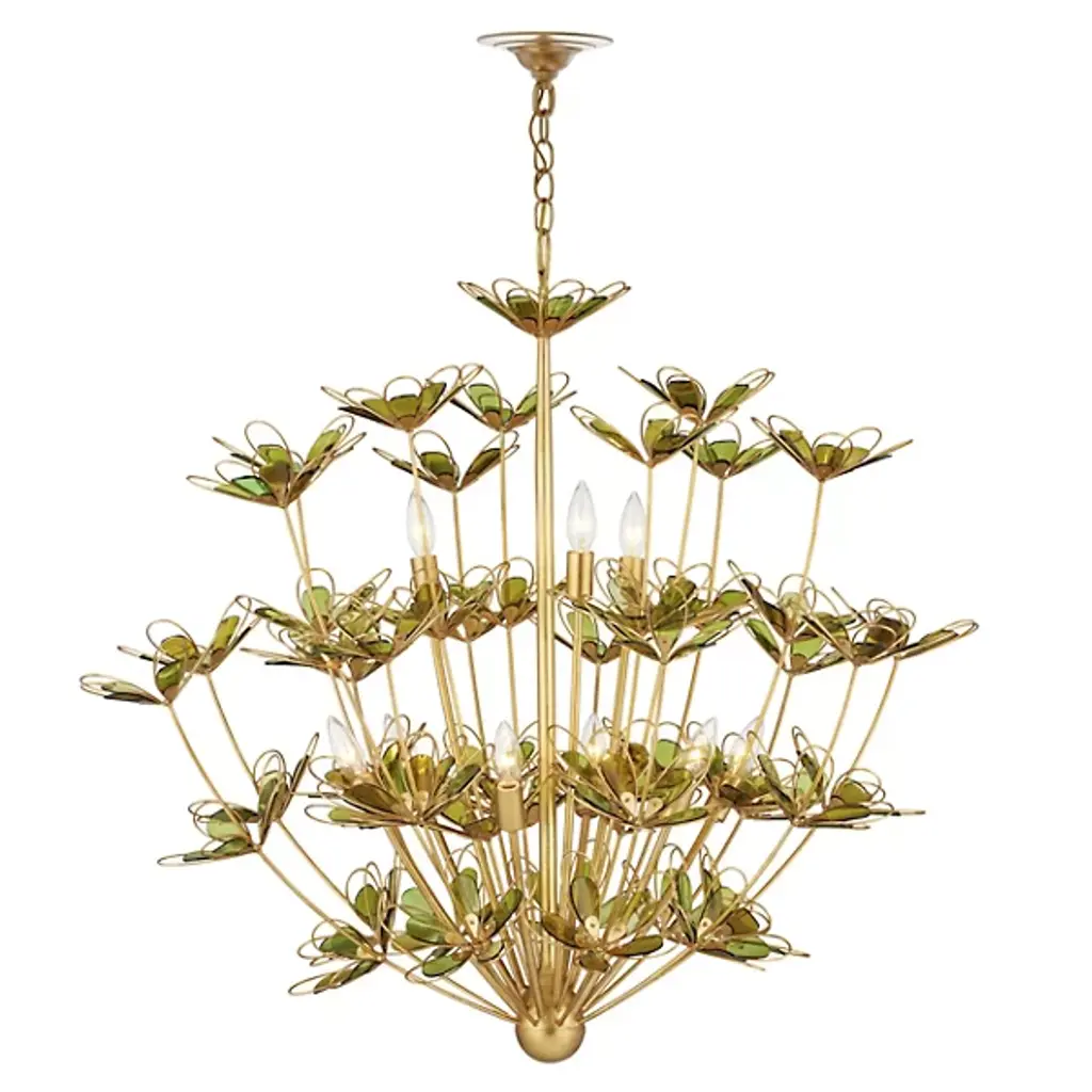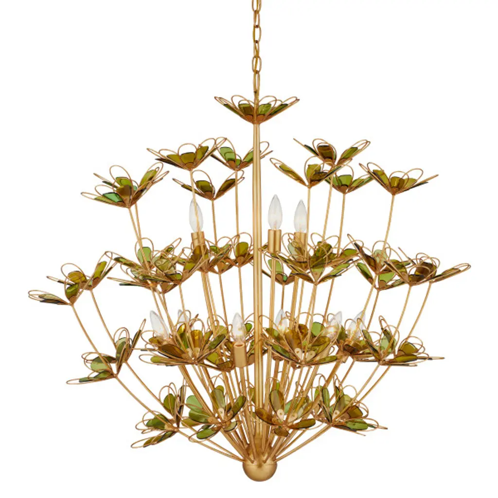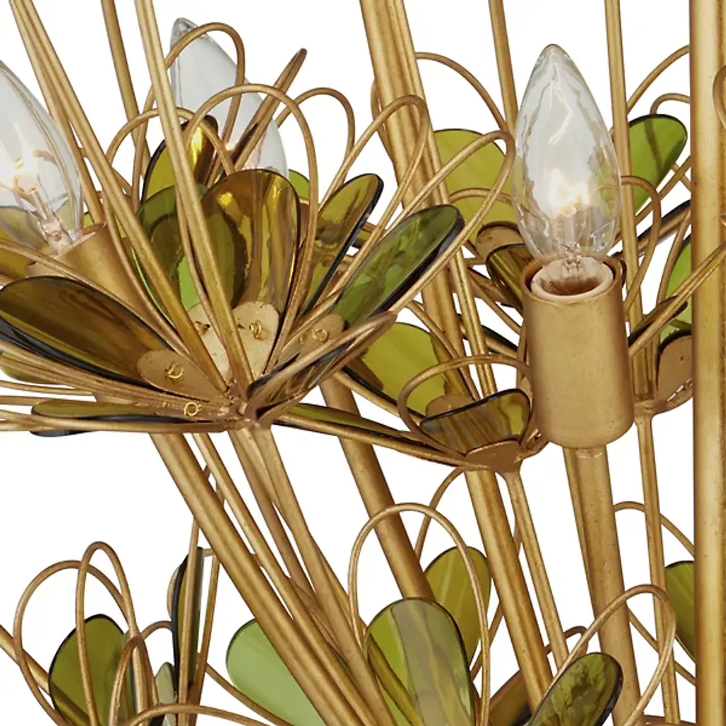 The Midsummer Chandelier from Currey & Company is a stunning tribute to nature's elegance. Its frame, adorned with a modern gold leaf finish, beautifully accentuates the green recycled glass petals of the blossoms. Each oblong glass piece is encircled by wire, bent to echo their shapes, and features a contemporary gold finish. The layered design imparts a fluttering floral effect. This chandelier is adjustable from 42" to 110" using the included chain, rod kit, and cable, with options for additional length available for purchase if needed.