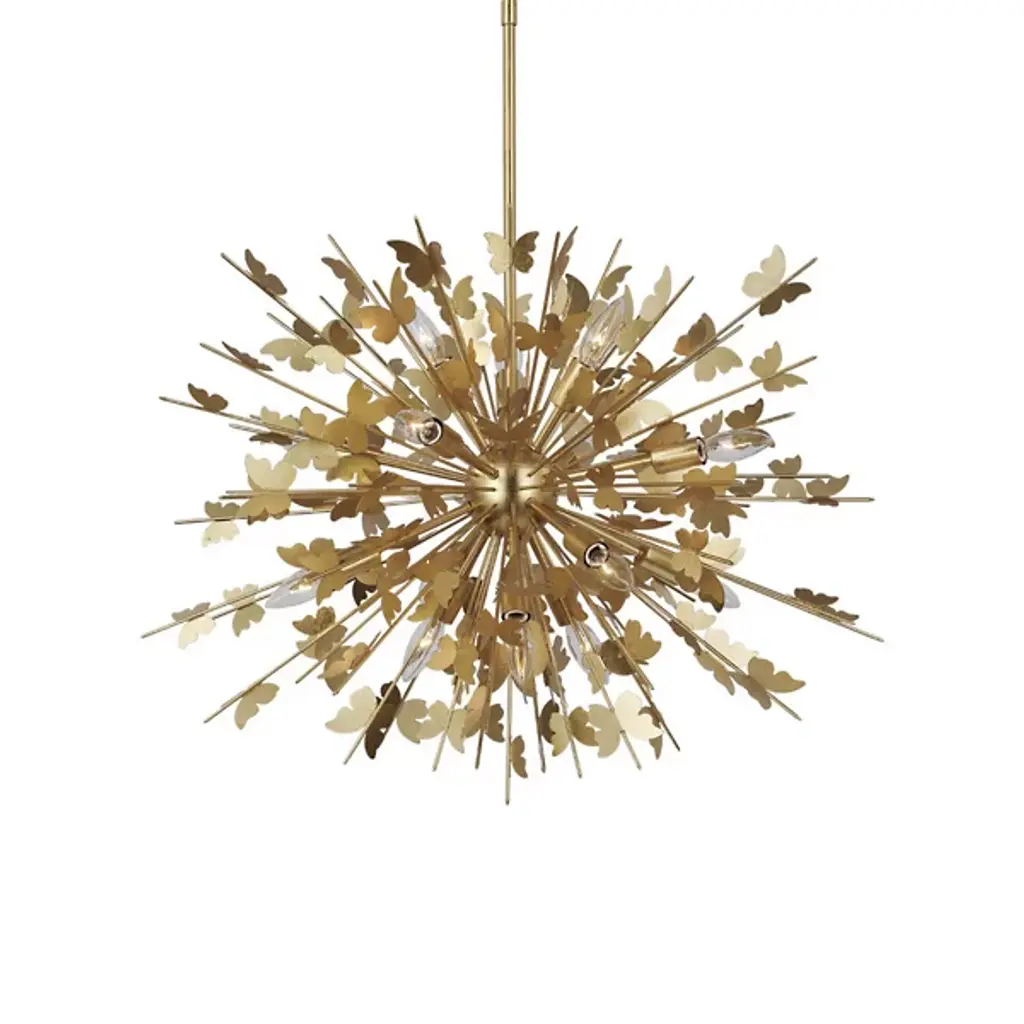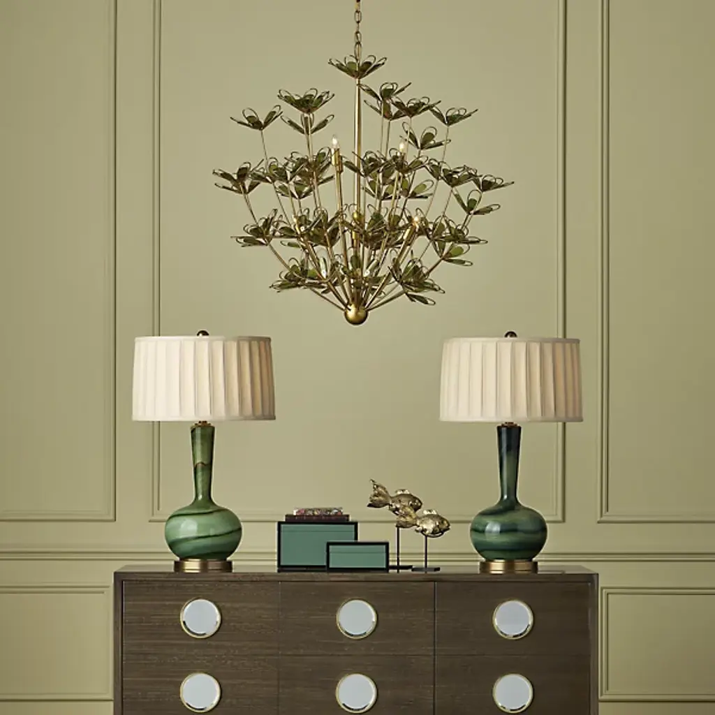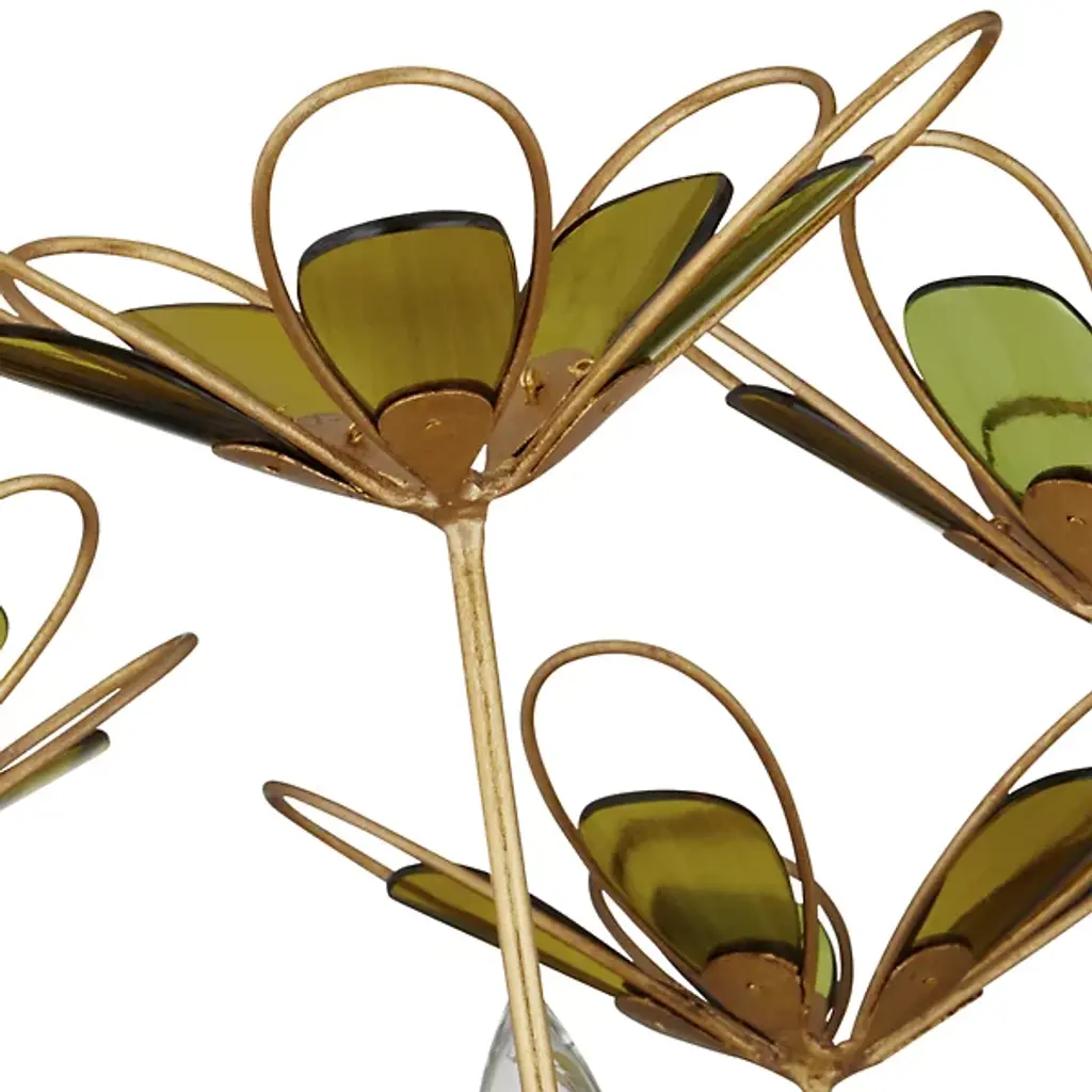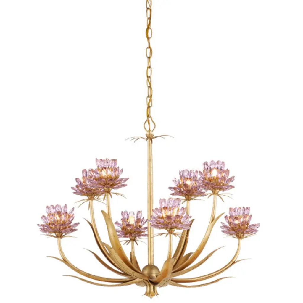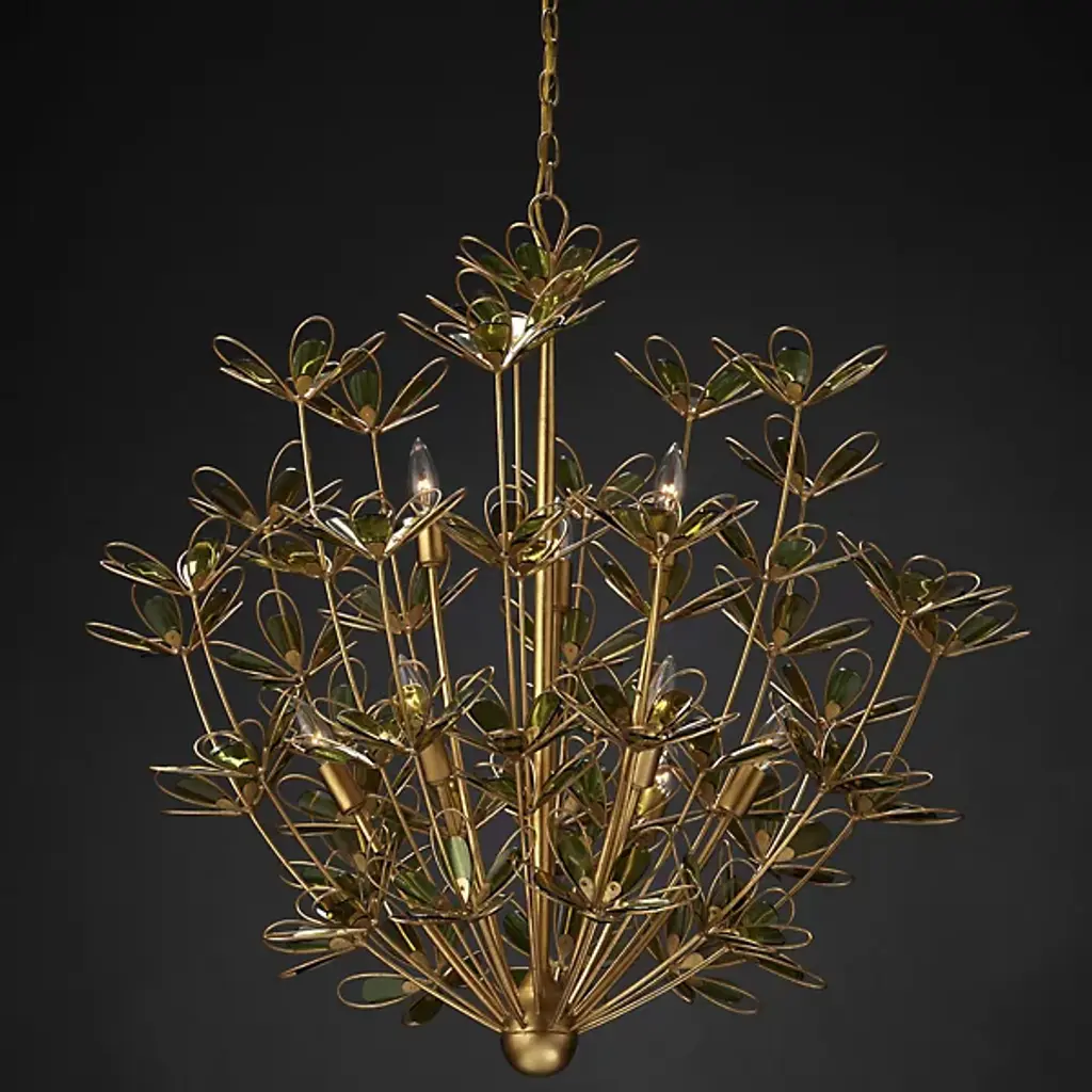 The Midsummer Chandelier from Currey & Company is a stunning tribute to nature's elegance. Its frame, adorned with a modern gold leaf finish, beautifully accentuates the green recycled glass petals of the blossoms. Each oblong glass piece is encircled by wire, bent to echo their shapes, and features a contemporary gold finish. The layered design imparts a fluttering floral effect. This chandelier is adjustable from 42" to 110" using the included chain, rod kit, and cable, with options for additional length available for purchase if needed.