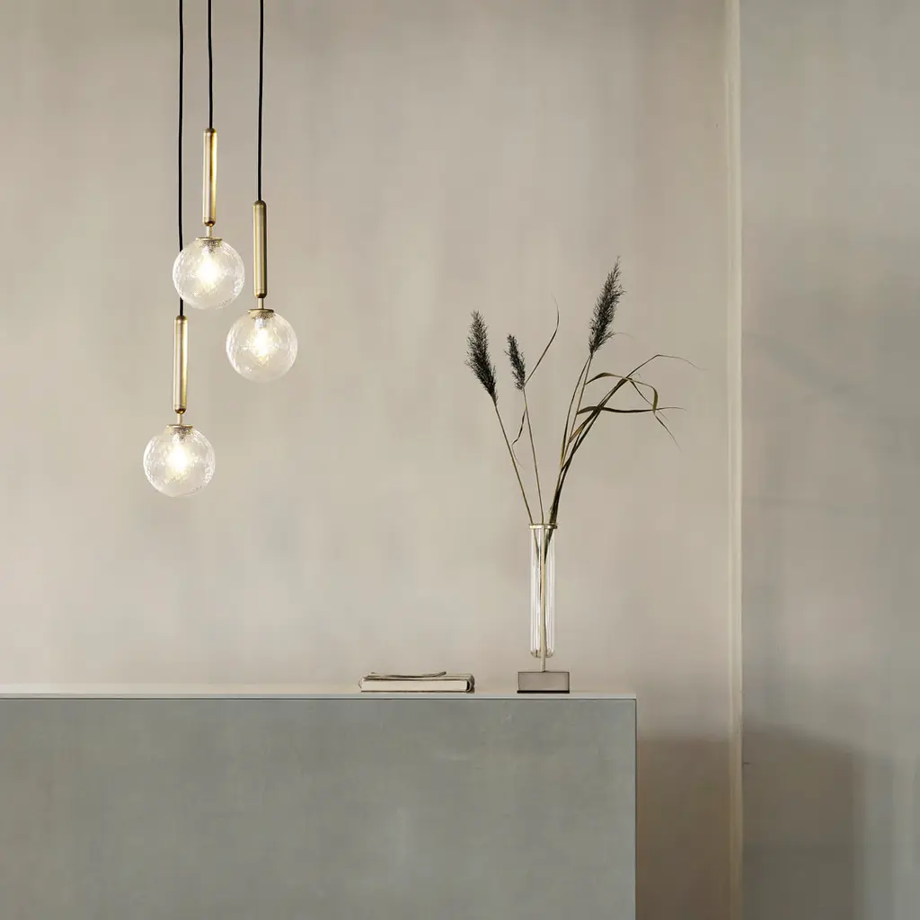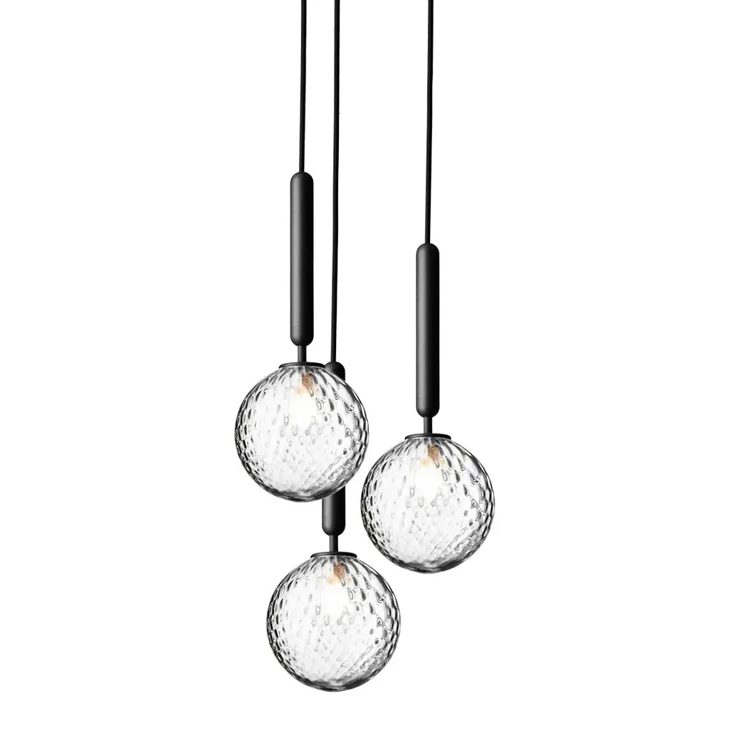 Miira 3 is a chandelier with 3 single pendants attached to a round ceiling plate in a multi-light formation, as the pendants can be adjusted to the desired height. The Miira 3 chandelier has a light and narrow silhouette, creating a floating appearance in the air. The single pendants are suspended from the ceiling plate, and the sleek metal rods and bold glass globes make the pendants pop in the air. Miira 3 Chandelier creates a cozy ambience over the dining table.