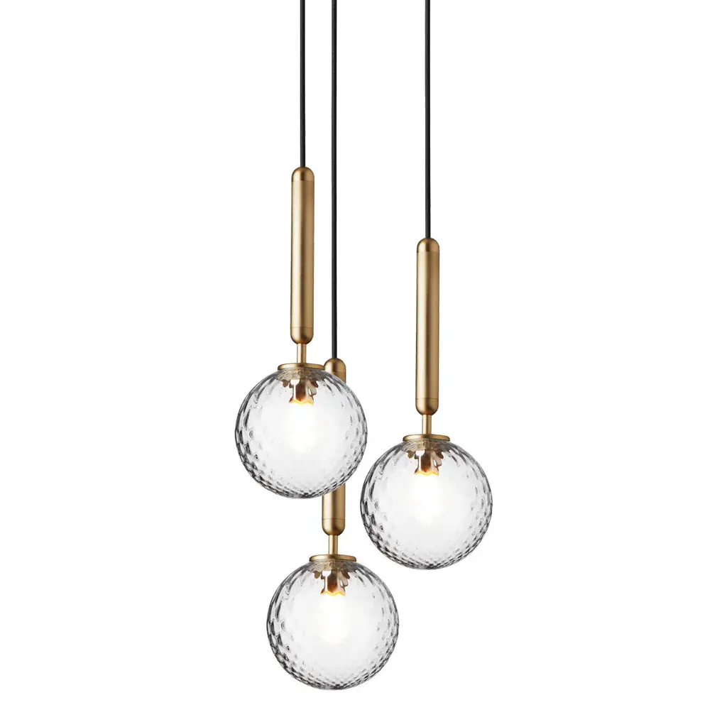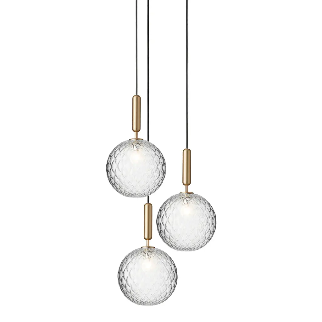 Miira 3 is a chandelier with 3 single pendants attached to a round ceiling plate in a multi-light formation, as the pendants can be adjusted to the desired height. The Miira 3 chandelier has a light and narrow silhouette, creating a floating appearance in the air. The single pendants are suspended from the ceiling plate, and the sleek metal rods and bold glass globes make the pendants pop in the air. Miira 3 Chandelier creates a cozy ambience over the dining table.