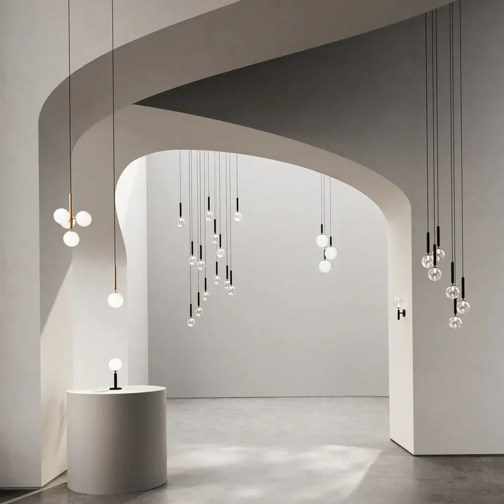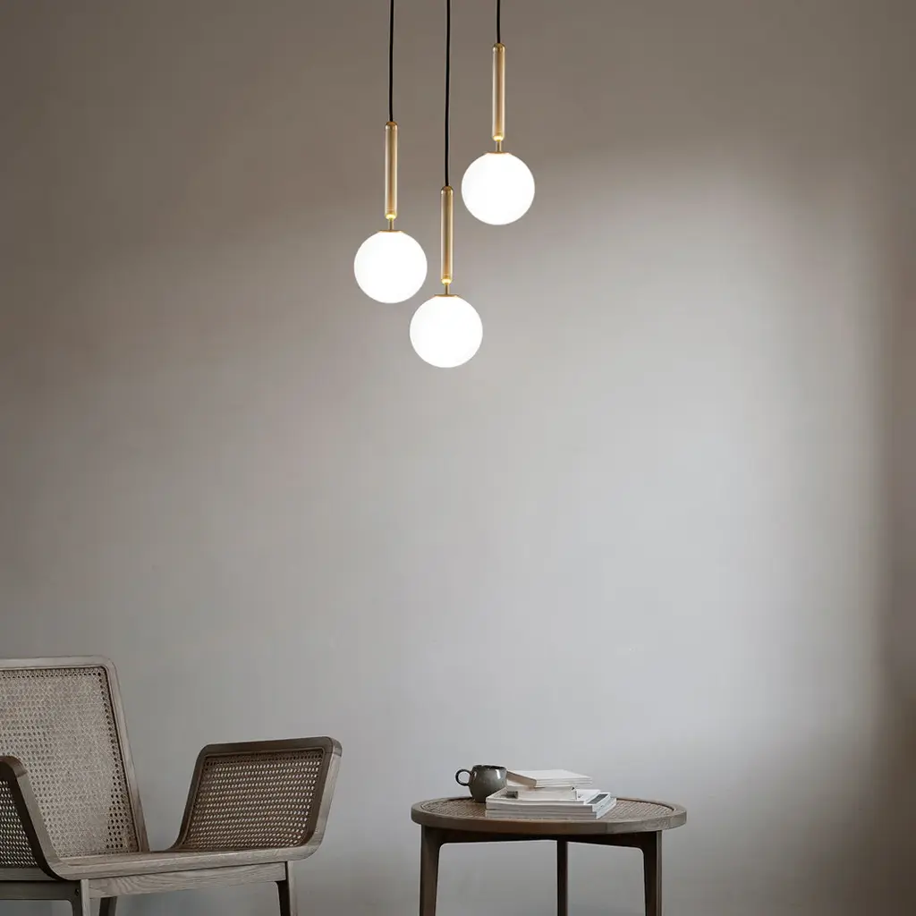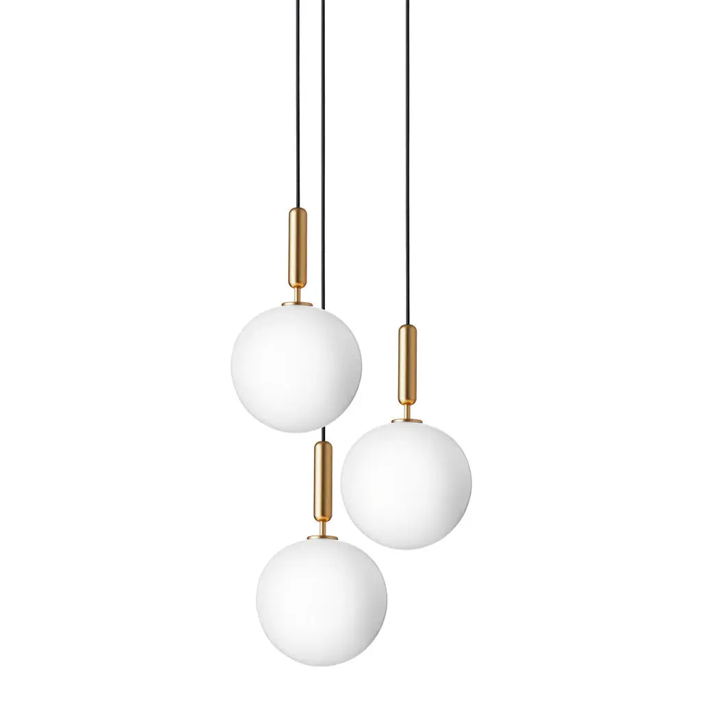 Miira 3 is a chandelier with 3 single pendants attached to a round ceiling plate in a multi-light formation, as the pendants can be adjusted to the desired height. The Miira 3 chandelier has a light and narrow silhouette, creating a floating appearance in the air. The single pendants are suspended from the ceiling plate, and the sleek metal rods and bold glass globes make the pendants pop in the air. Miira 3 Chandelier creates a cozy ambience over the dining table.