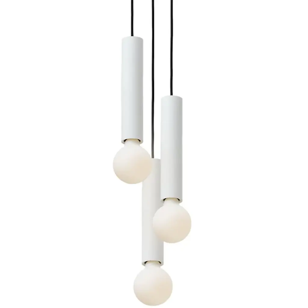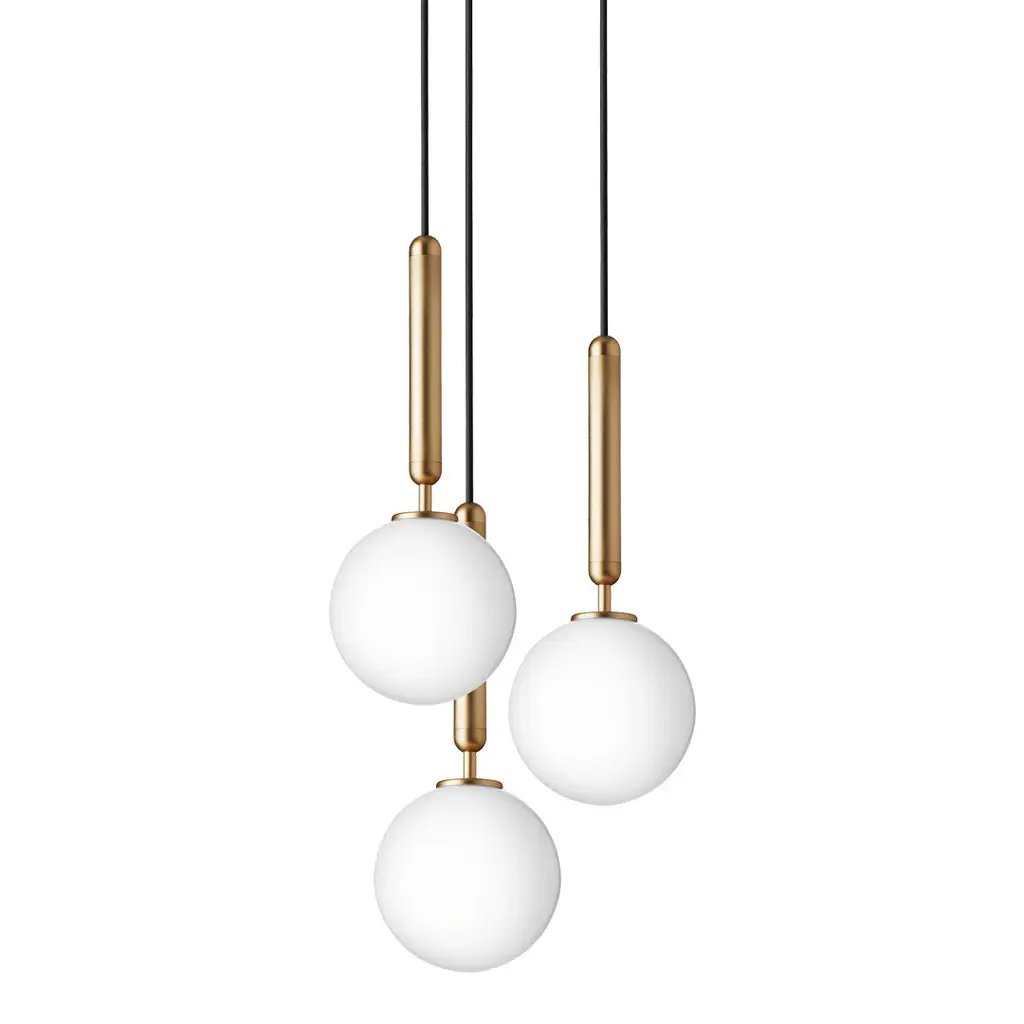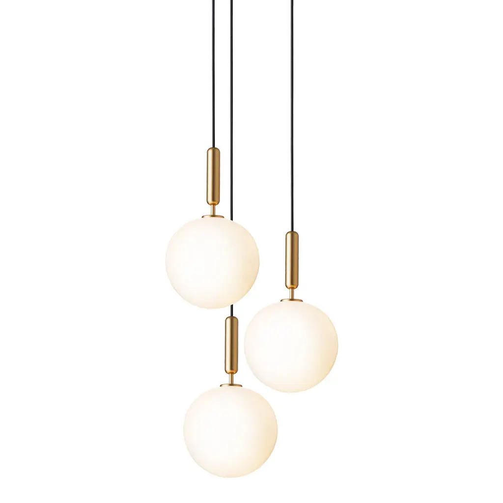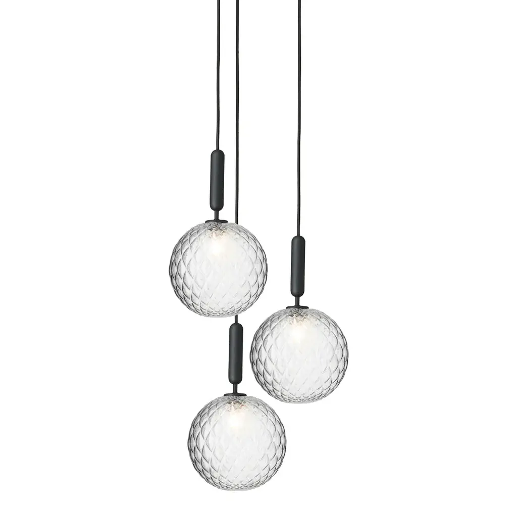 Miira 3 is a chandelier with 3 single pendants attached to a round ceiling plate in a multi-light formation, as the pendants can be adjusted to the desired height. The Miira 3 chandelier has a light and narrow silhouette, creating a floating appearance in the air. The single pendants are suspended from the ceiling plate, and the sleek metal rods and bold glass globes make the pendants pop in the air. Miira 3 Chandelier creates a cozy ambience over the dining table.