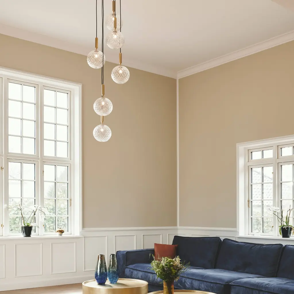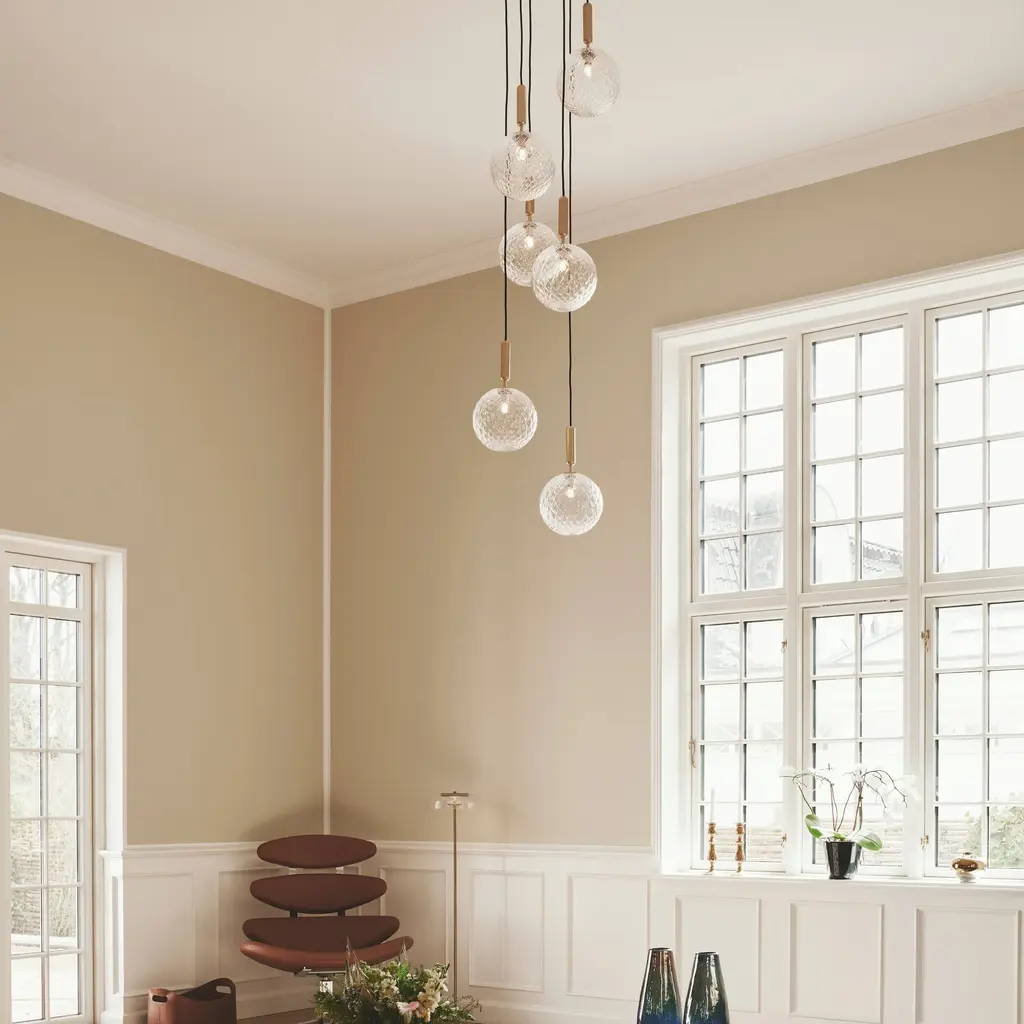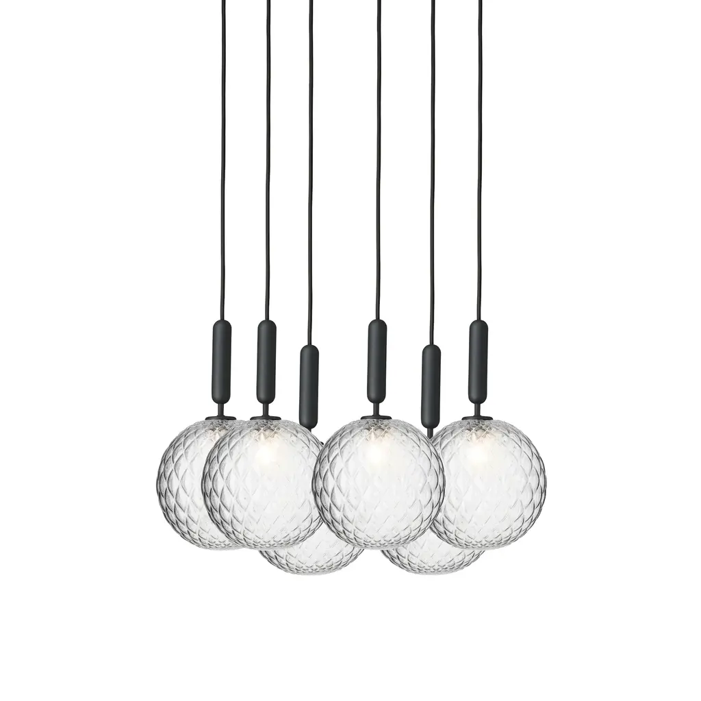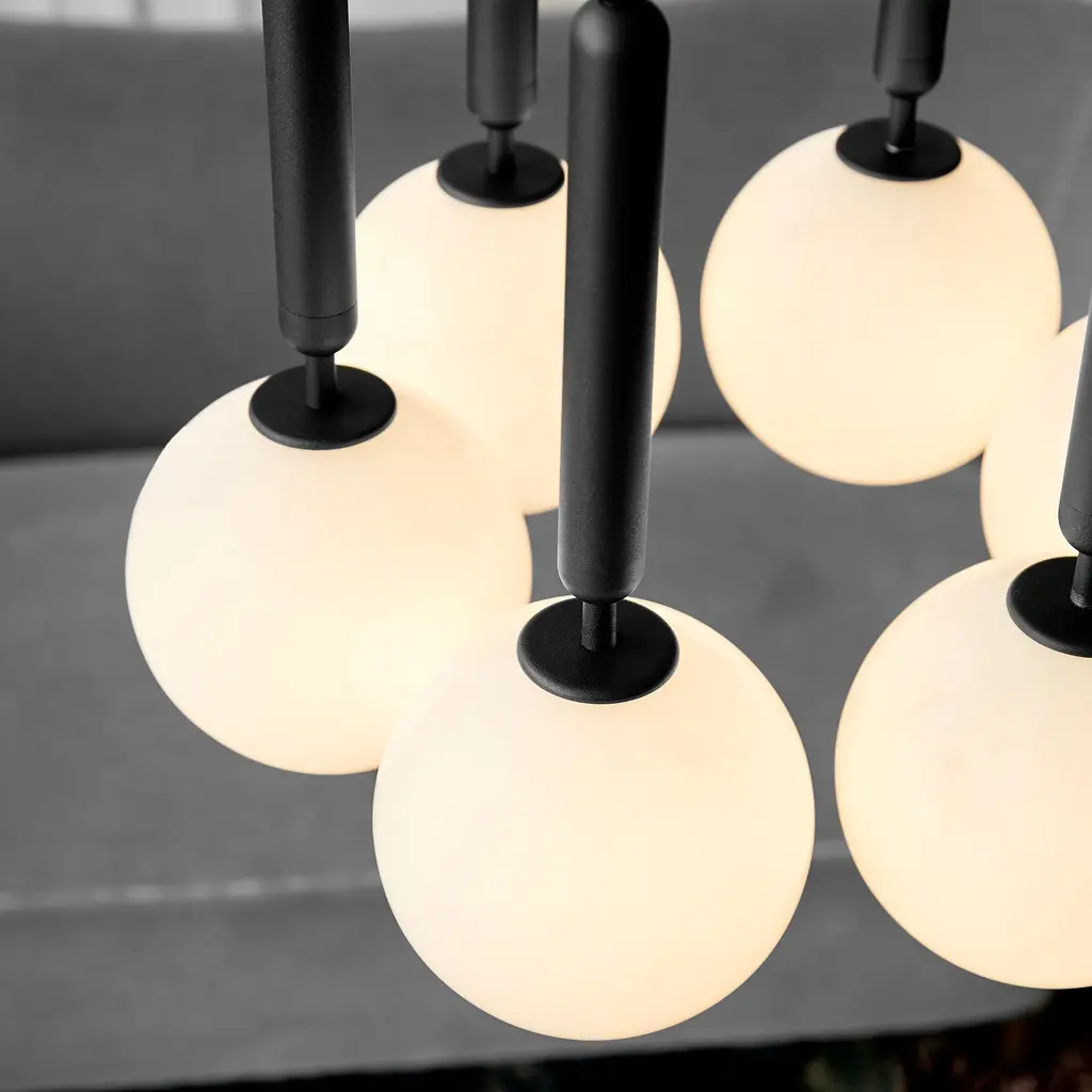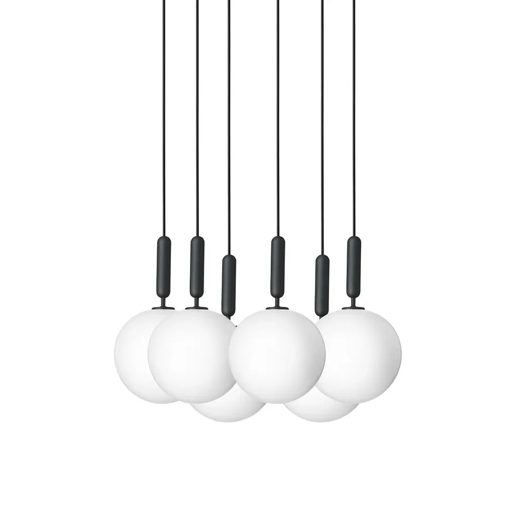 A stunning cascade of a half-dozen gorgeous globe lights makes a memorable impression in this minimalist chandelier. Repeating the design motif of the entire Miira collection, the 6 mouth-blown globes dazzle the eye, in either milky opal glass or clear glass with a unique embossed pattern. Danish design brand Nuura's creative director Sofie Refer mounts each glowing orb on a simple grey metal cylinder stand, giving prime emphasis to the atmosphere-lifting soft and even illumination.