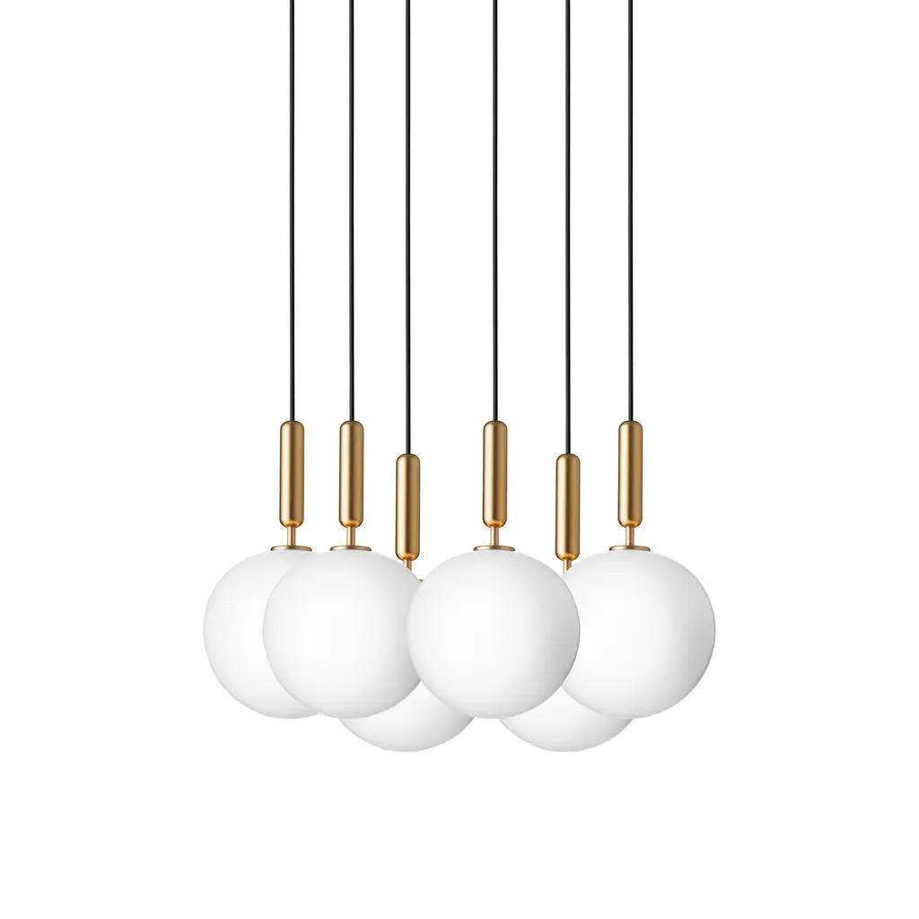 A stunning cascade of a half-dozen gorgeous globe lights makes a memorable impression in this minimalist chandelier. Repeating the design motif of the entire Miira collection, the 6 mouth-blown globes dazzle the eye, in either milky opal glass or clear glass with a unique embossed pattern. Danish design brand Nuura's creative director Sofie Refer mounts each glowing orb on a simple grey metal cylinder stand, giving prime emphasis to the atmosphere-lifting soft and even illumination.