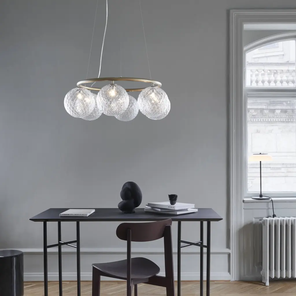 In a dazzling circular configuration, Nuura's creative director Sofie Refer arrays 6 of the mouth-blown Miira globes on a powder-coated metal ring colored a dark bronze. The chandelier can hang high or low from the ceiling, via a special wire system that easily adjusts the suspended height from 45 to 250 centimeters. With the globes alit in either milky opal or or clear optic glass with an embossed pattern, the fixture spreads a sumptuous illumination that makes it a glowing focal point in a variety of settings.
