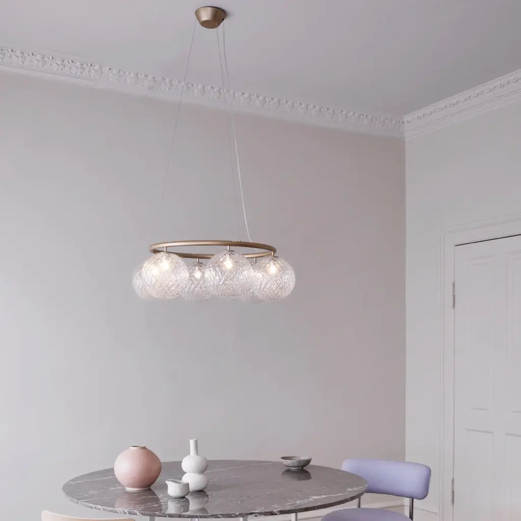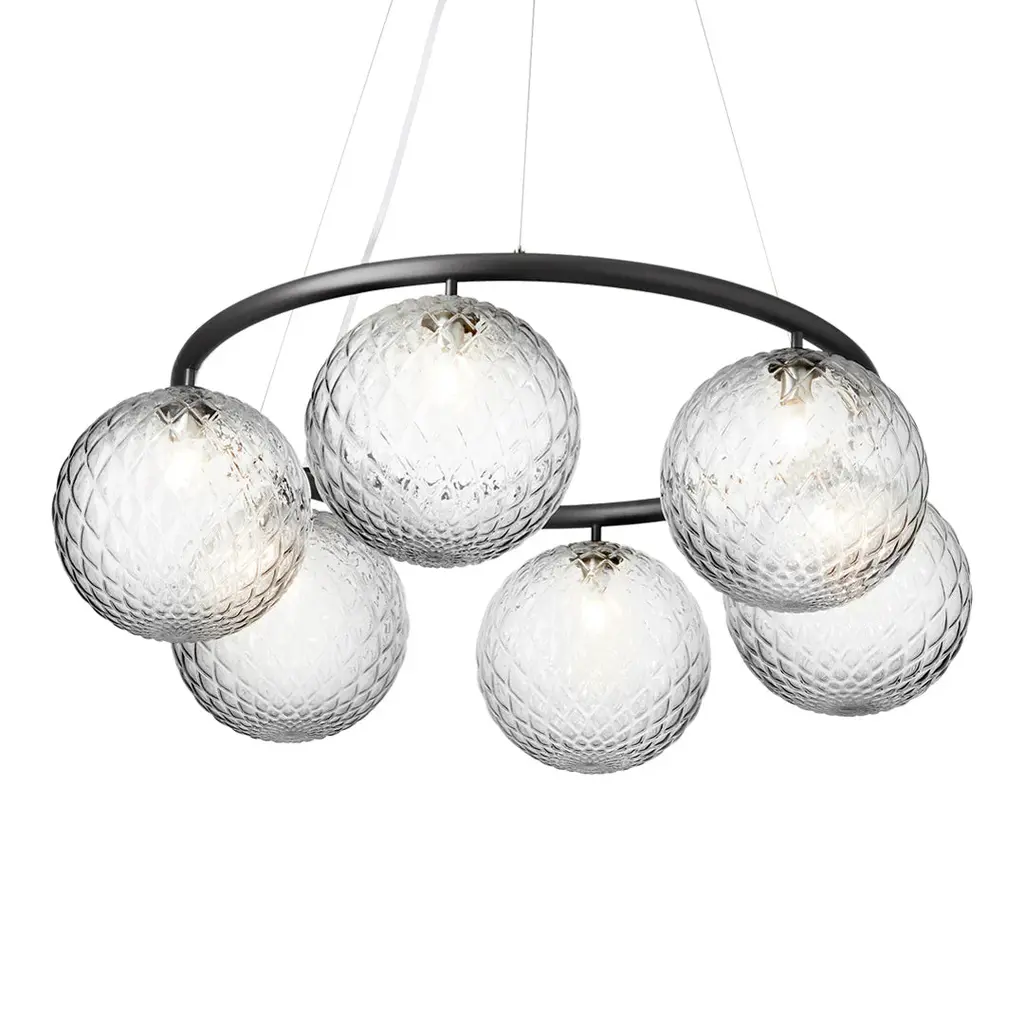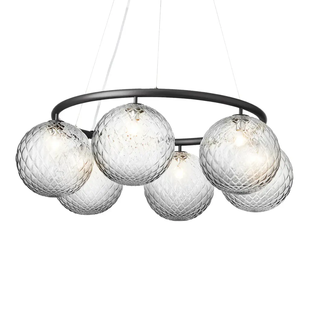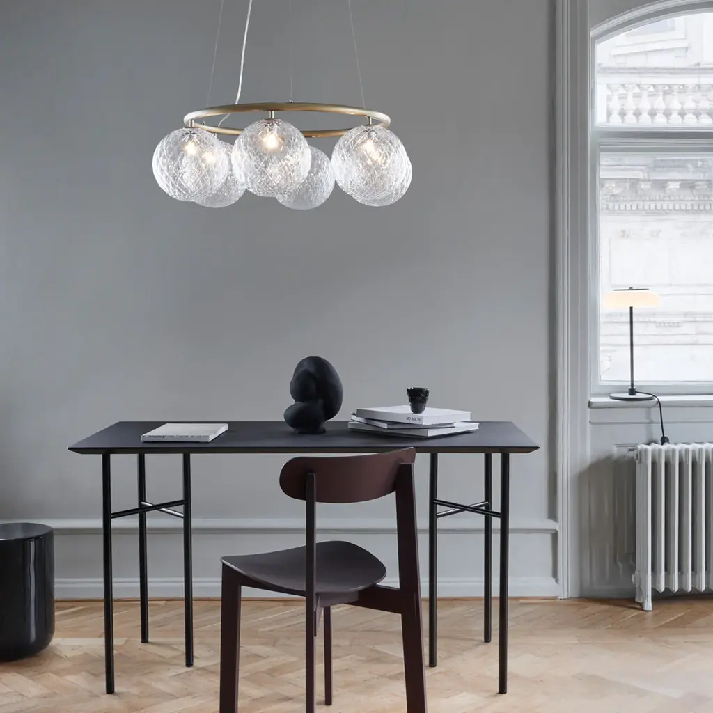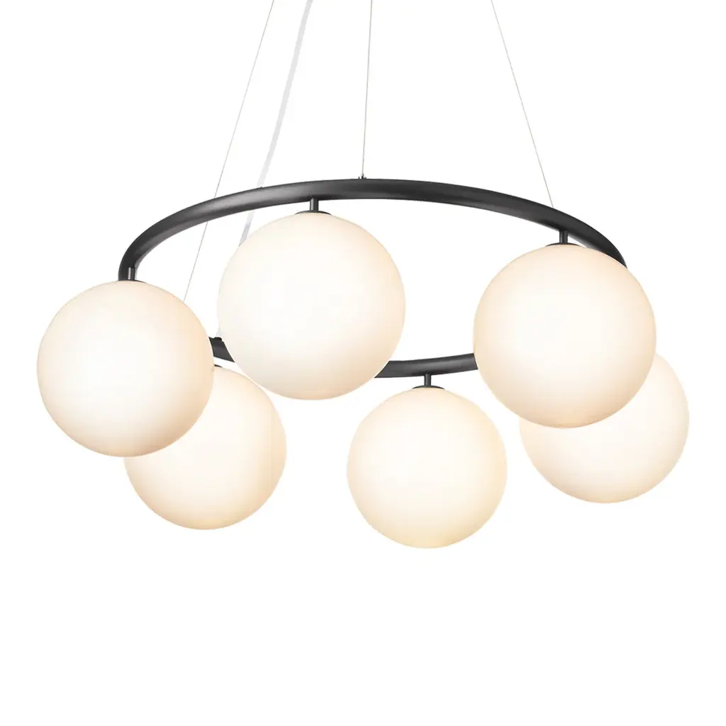 Miira 6 Circular is a modern chandelier in an organic, circular design and contrasting yet complementing materials. The chandelier comprises a wet painted metal ring and 6 mouth-blown glass globes from which a sensuous light is spread. Ideal above a dining table or sofa.