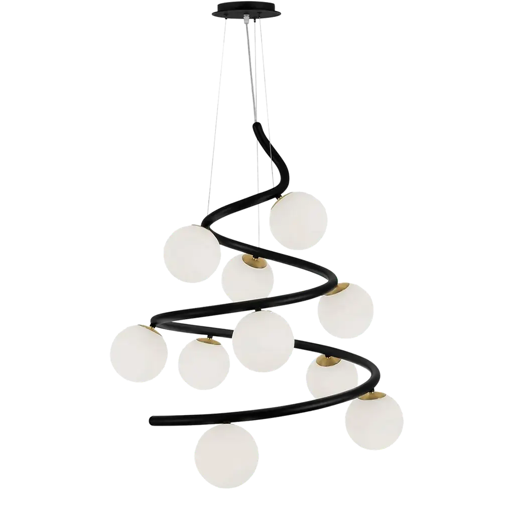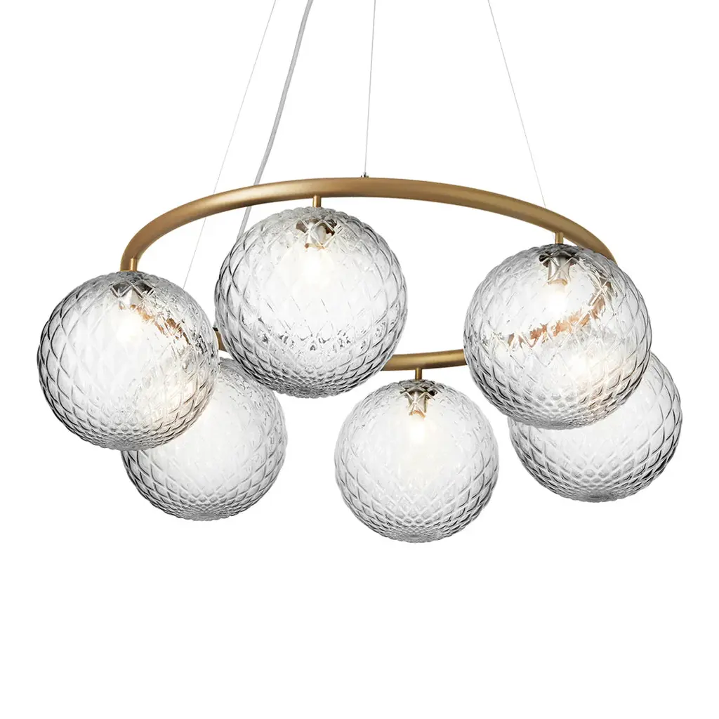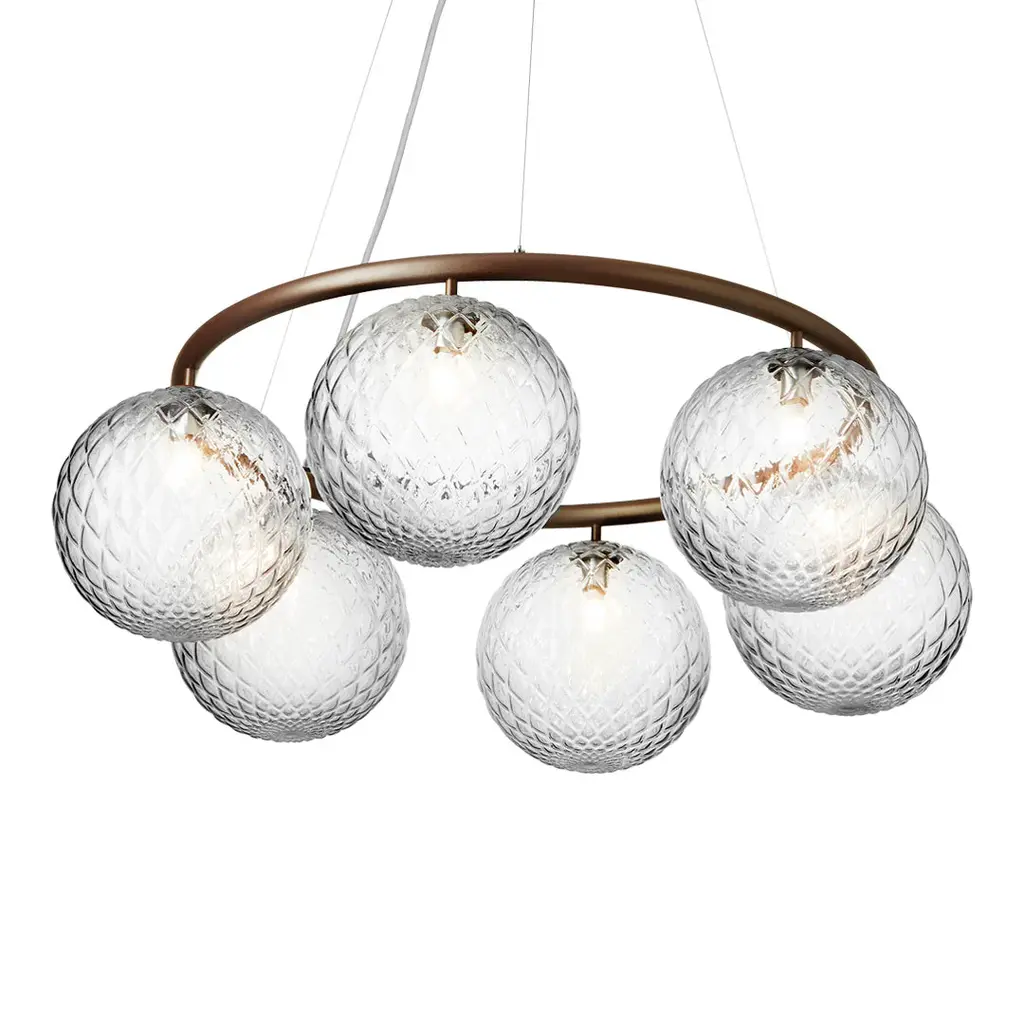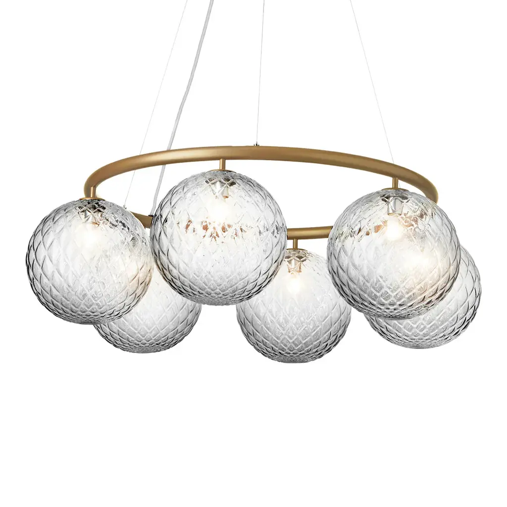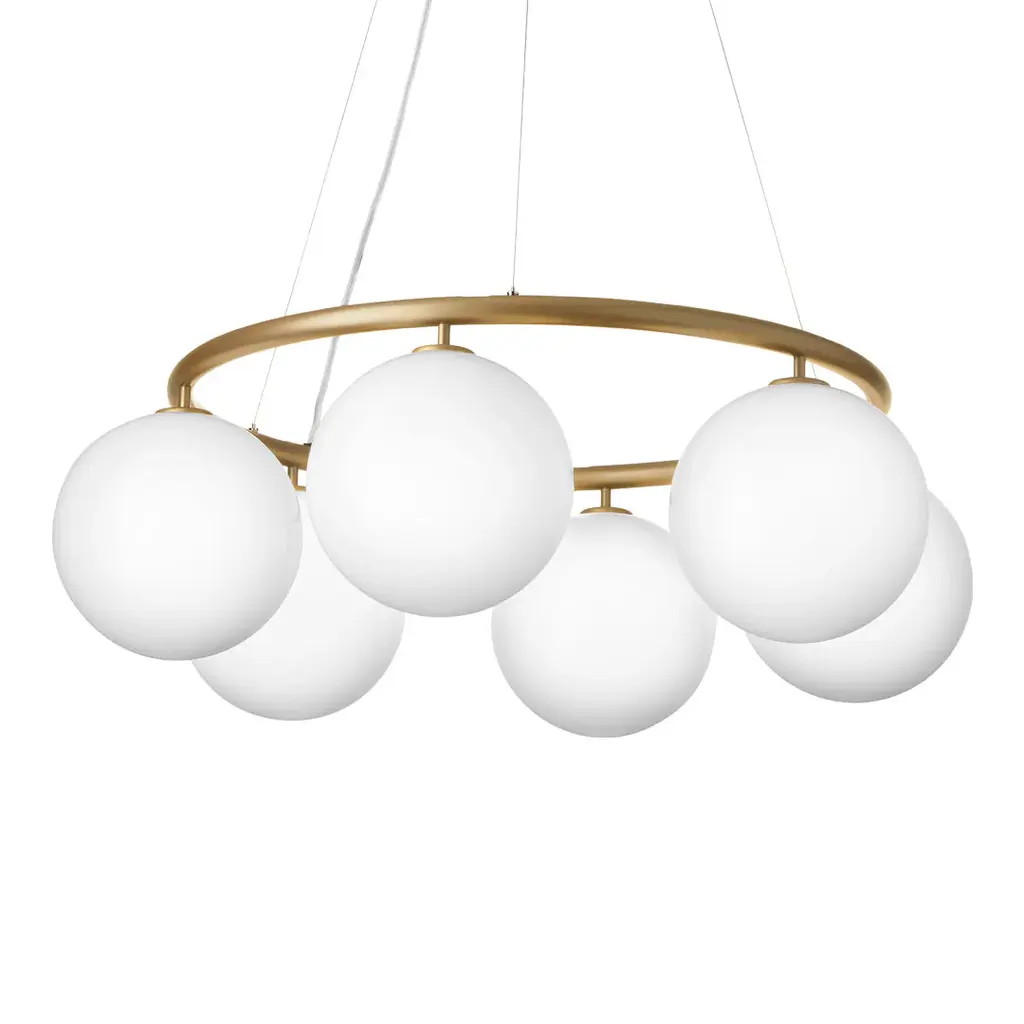 Miira 6 Circular is a modern chandelier in an organic, circular design and contrasting yet complementing materials. The chandelier comprises a wet painted metal ring and 6 mouth-blown glass globes from which a sensuous light is spread. Ideal above a dining table or sofa.
